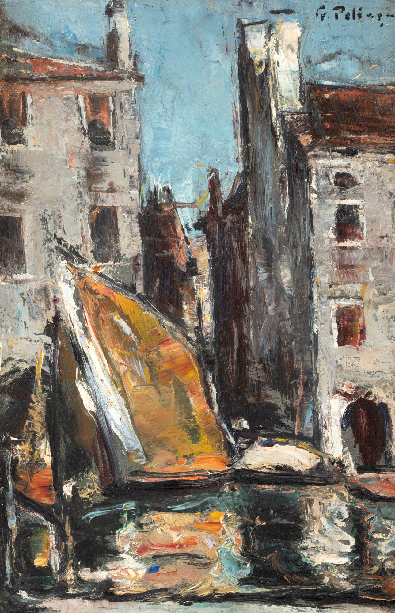 Specificitatea picturii lui Gheorghe Petrașcu ne introduce în psihologia unui artist modelat după structura marilor impresioniști, chiar dacă el însuși s-a desprins rapid, la începutul carierei de presupusele “metehne” ale pictorilor în plein-air. După cum biografia și datările peisajelor ne mărturisesc, Petrașcu a pictat la Veneția între 1902 și 1939, timp în care se pare că a efectuat aproximativ 10 călătorii. Printre cele mai importante itinerarii le regăsim pe cele materializate în 1924, 1928 și 1934, ani în care pictorul a stăruit și a realizat o seamă de opere reprezentative. Arhitectura, deşi mai simplă decât a palatelor veneţiene păstrează linii elegante, culorile zidurilor aduc pe lângă aerul vetust, şi o notă de lux, Petraşcu transformând tencuiala îmbătrânită într-o patină preţioasă. Apa, reprezentată în nuanţe multiple, devine consistentă, oglindă minerală, la fel cum şi cerul pare alcătuit dintr-un material smălţuit. Pictura este dominată de o atmosferă de linişte şi reculegere, evocând aspectele calme, stabile, ale realităţii şi tăcerea materiei minerale din care este alcătuită lumea lui Petraşcu.