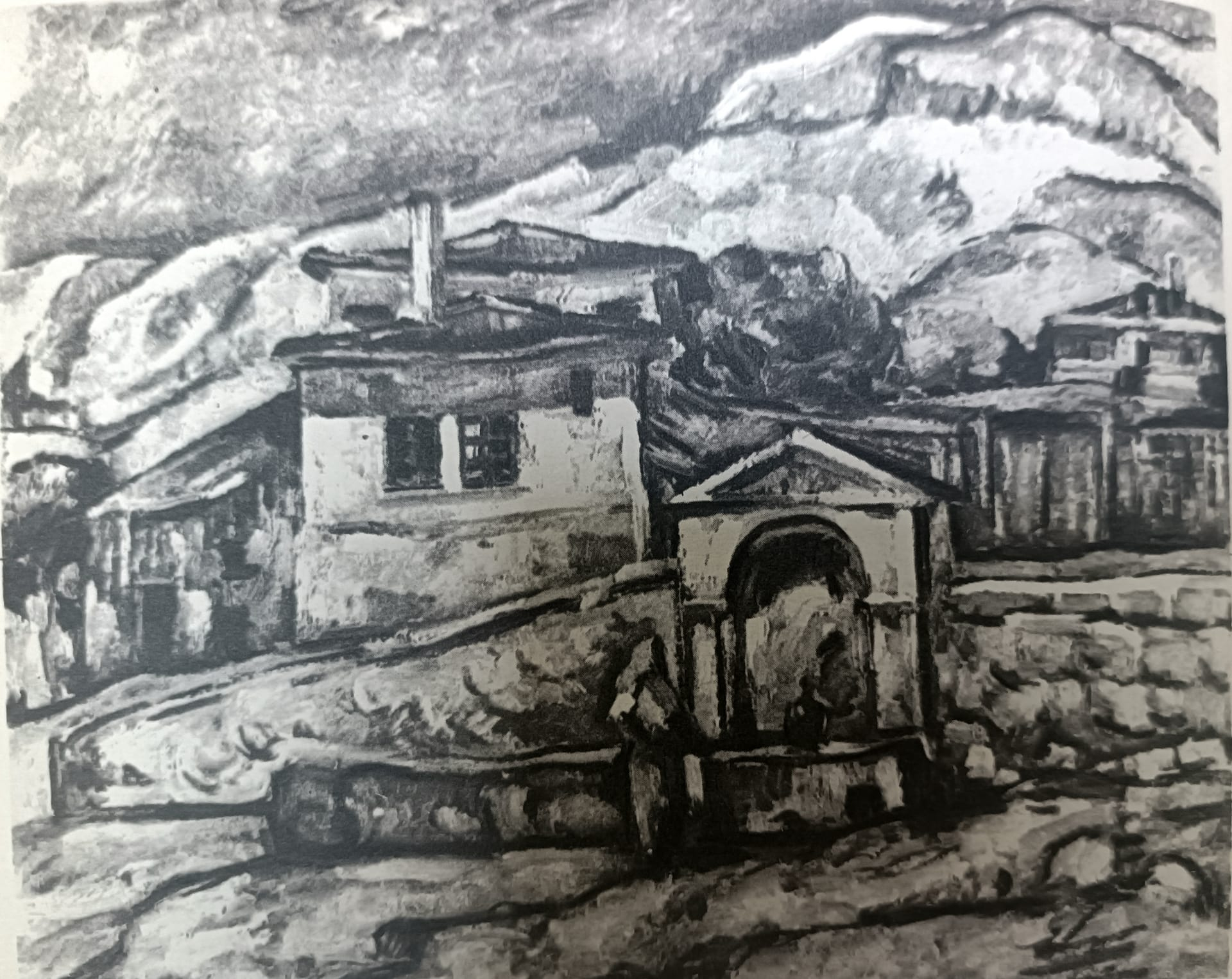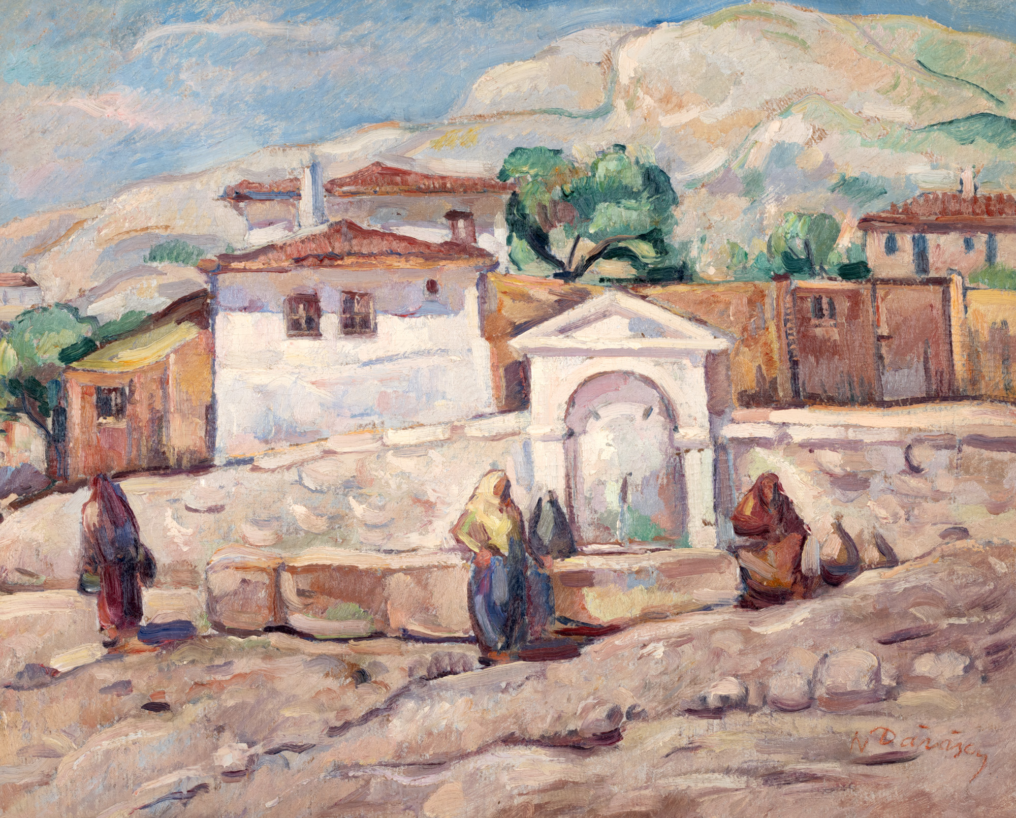 După un lung șir de călătorii efectuate de-a lungul Europei, în anul 1919 artistul se va opri și în Dobrogea. Descoperă Balcicul și dezvoltă o reală pasiune pentru culoarea acestuia. Pictează scene de gen în care îl preocupă redarea grupurilor de oameni, străzile, hanurile ori mahalalele. La expoziția personală organizată în anul 1924 prezintă mai multe lucrări care au drept punct de pornire Marea Neagră, cu stâncile, dealurile roșiatice sau casele tătărești ale oamenilor. Dărăscu va reuși să împrumute operei sale din spiritul său solar, prin vibrația tonurilor și rigoarea tehnicii care răzbate dincolo de drumurile prăfuite ale Dobrogei și ale Balcicului. Pictează în plein air, adesea în zone urbane sau marine, surprinzând efectele trecătoare ale luminii și a vieții cotidiene a oamenilor, unde câteva exemple în acest sens sunt: ,,Case la Balcic”, ,,Familie de turci în Dobrogea” sau ,,Fântâna din Balcic”. În multe lucrări ale sale predomină arhitectura urbană, clădirile înalte și agitația satului. Lucrarea de față este realizată în perioada anilor 1923 și 1924 surprinde arhitectura specific dobrogeană, în care clădirile se înlănțuie succesiv și deschid drumul urbei, alături de cișmeaua satului. Dărăscu, astfel pune accent pe surprinderea unui moment din viață locală a oamenilor simpli, ce se află surprinși la fântâna satului care apare aici ca și element necesar traiului vieții, dar care poate reprezenta și loc de întâlnire și de socializare între aceștia.