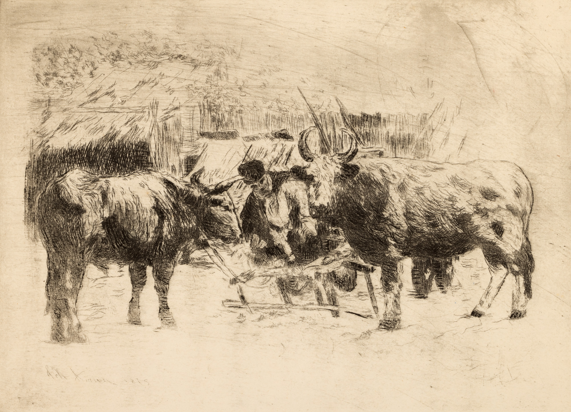 O variantă a operei este reprodusă în ”Adevărul Literar și Artistic”, 19 decembrie 1926, anul VII, nr. 315. O variantă a operei este reprodusă în albumul ”Theodor Aman”, Vasile Florea, Editura Meridiane, București, 1965, sub denumirea ”Înjugatul boilor”, la pag. 34. O variantă a operei este reprodusă în "Repertoriul graficei românești din secolul al XIX-lea", Vol. I, pag. 44, cat.179.