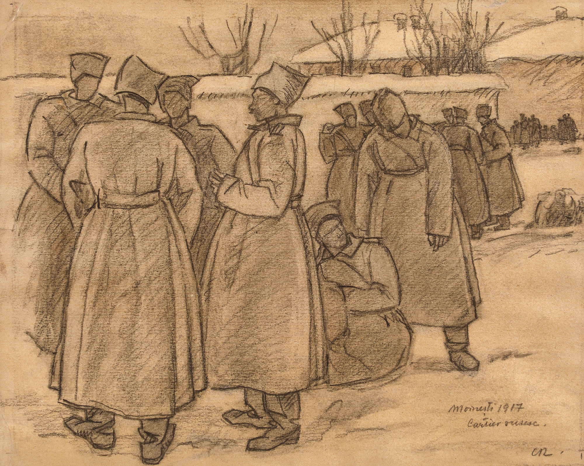 semnat, localizat, datat și intitulat dreapta jos, în cărbune, "CR, Moinești, 1917, Cartier rusesc"