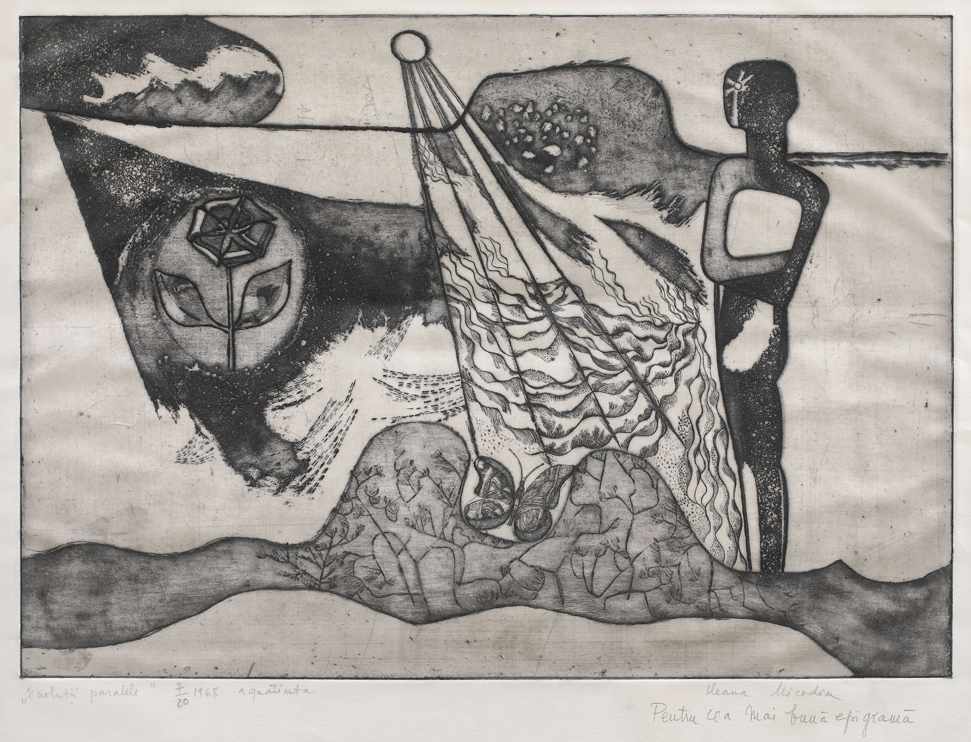 semnat și dedicat dreapta jos, în creion, "Ileana Micodim, Pentru cea mai bună epigramă"; intitulat, numerotat, datat și notat stânga jos, sub cadru, în creion, "Evoluții paralele, 7/20, 1965, aquatintă"