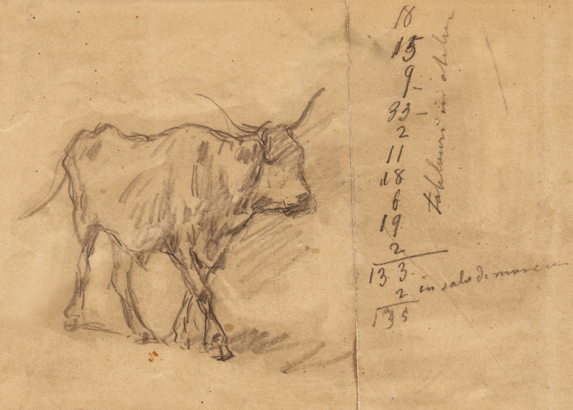 Pe lângă ineditul desen-studiu de animal, hârtia pe care se regăsește studiul cuprinde și notițe de inventar ale lui Nicolae Grigorescu. Descoperim o listare a unor lucrări aflate în atelier, cât și menționarea unor opere expuse, transformând hârtia de față într-o dublă însemnătate, un studiu preliminar pentru celebrii boi ai lui Grigorescu, cât și un document de epocă ieșit din mâna pictorului. În plus, pe recto regăsim unul dintre studiile rapide, în creion, pentru una dintre cele mai complexe scene create de Grigorescu și anume "Nunta țărănească". Nevoia acestor schițe în creion era evidentă pentru un pictor care încerca să surprindă în câteva tușe lumina, mișcarea sau starea personajelor, chiar dacă pictura era finalizată în atelier.