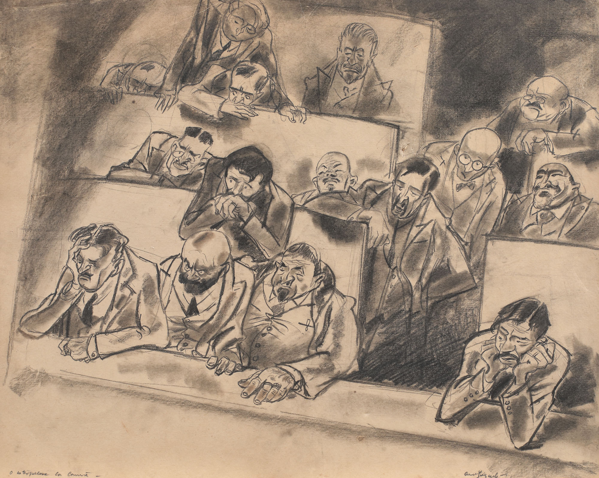 semnat dreapta jos, în creion, "aurel jiquidi"; intitulat stânga jos, în creion, "o interpelare la cameră"