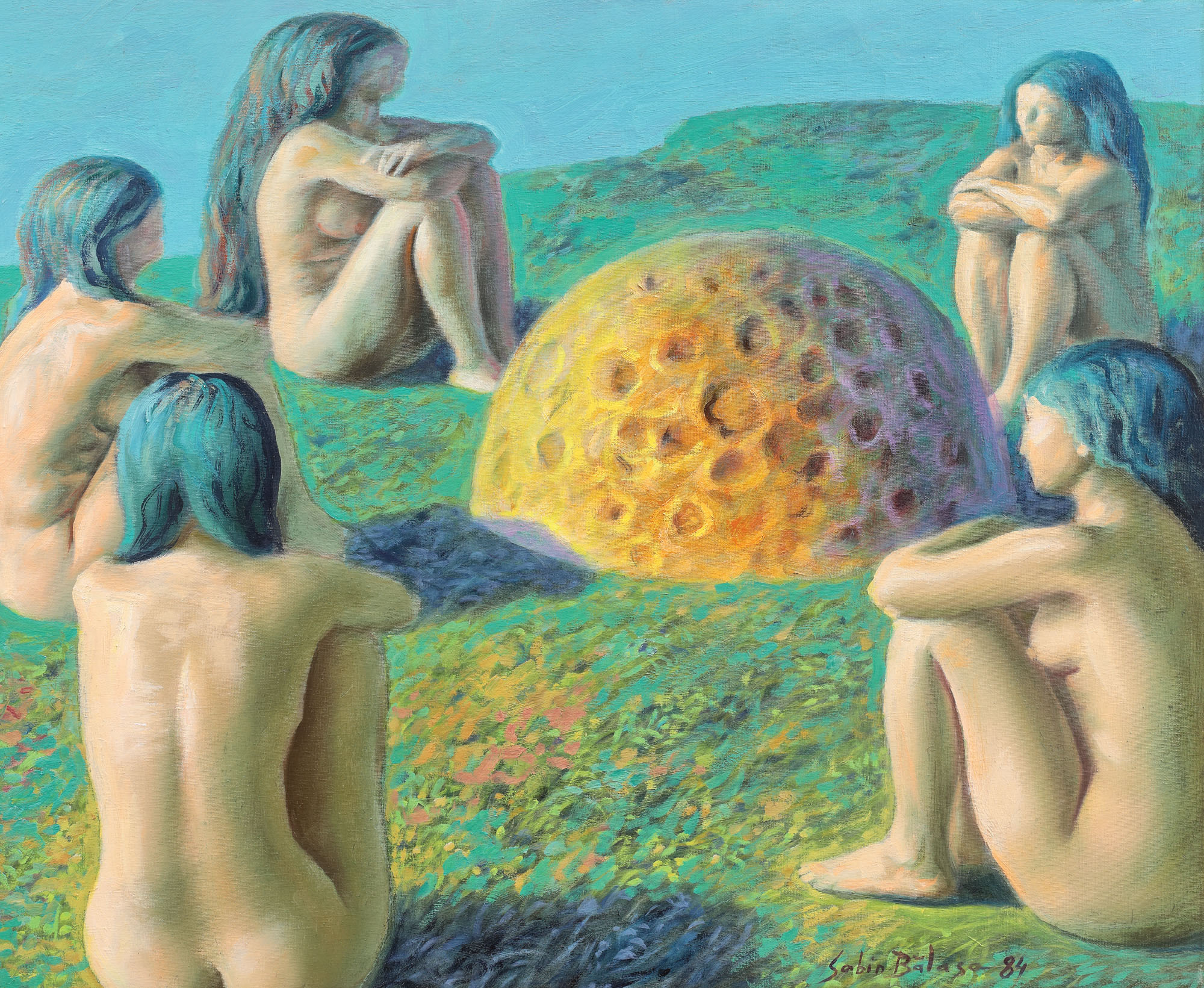 Dezvăluind o adevărată pasiune pentru arta figurativă, în centrul căreia va așeza omul și relația sa cu universul, artistul Sabin Bălașa este autorul unei arte străbătute de mituri și de mister. Cosmosul, locul unde alege să își plaseze acțiunile compozițiilor sale, este învăluit în albastru, îmbrăcând în simboluri teme universale precum: pacea, tinerețea, maternitatea, dragostea, primăvara, patria, viața, moartea, victoria ș.a. Accentuate în sensul lor mistic universal și adesea prin repetiție, simbolurile se vor regăsi într-o realitate spirituală imaginară, devenind sinonime ale unor reale metafore vizuale. (G.M.)