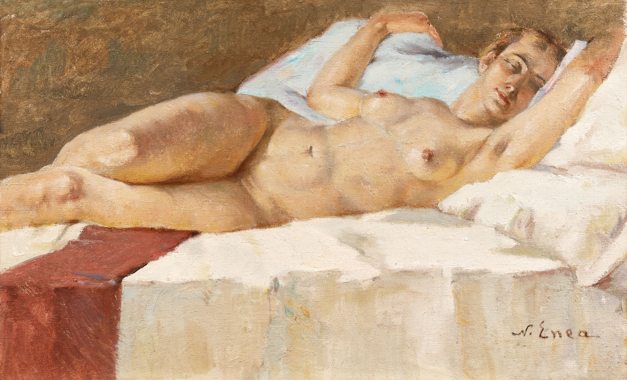 Pictor cu o activitate intensă în perioada interbelică, Nicu Enea s-a prezentat ca un artist coordonat de estetica postimpresionistă încă de la primele apariții pe simeze. Elev al unor artiști de o formare academistă, ca Artachino sau G.D. Mirea, artistul își va găsi repede identitatea picturală, în special în peisaj și în compozițiile cu personaje. Nudurile lui Enea arată predilecţia acestuia pentru formele clasice, precum şi o depărtare de normele academiste, prin alegerea unor mijloace picturale din alt registru. Regăsim uneori rigoarea și robustețea nudurilor lui Camil Ressu, ce i-a fost profesor la Belle Arte în anii '20, însă maniera atât de recognoscibilă a pensulației avea să îl distanțeze de creația profesorului. Anatomia atletică a personajului, postura şi spaţiul în care este ilustrat și compoziţia se află toate în descendenţa tradiţiei clasice a nudului în pictura europeană, fapt ce îi conferă creației lui Enea o anume eleganță și distincție.