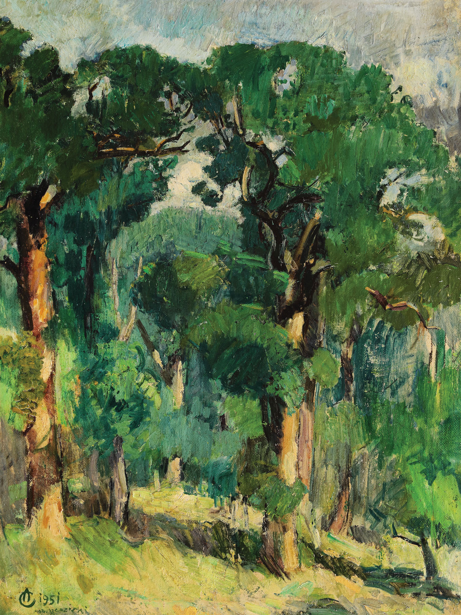 semnat, datat și localizat stânga jos, cu verde, ”AC, 1951, Pădure Cozieni”