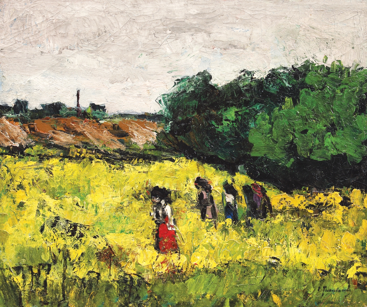 Pentru opera lui Ion Țuculescu deceniul al cincilea al secolului XX a reprezentat o perioadă extrem de importantă, ce ne oferă practic trei etape distincte - peisajele expresioniste - perioada folclorică - începutul abstractului. Necesitatea fixării acestor etape este impusă de caracteristicile picturii lui Țuculescu, care își extrag înțelesurile din alternări temporale. Fixarea în timp a lucrării de față este evidentă, datarea fiind mai mult decât folositoare în discursul nostru. Peisajele lui Țuculescu din anii 1941-1943 se înscriu pe linia influenței expresioniste, asimilate, dar aplicate în coeziune cu cele de factură impresionistă ori postimpresionistă. Deși dinamismul sau virilitatea expresivă a manierei expresioniste sunt opuse contemplației din perioada impresionismului, în opera artiștilor români ecourile acestea persistă mai ales în tehnică. În cazul creației lui Țuculescu din preajma lui 1943 discutăm însă despre un limbaj total cufundat într-o tendință expresionistă. Lucrurile devin tranșante și limpezi nu doar în paleta artistului, ci și în receptarea acestuia în mediul artistic bucureștean. Lucrările prezentate la expoziția personală din 1943 de la Atheneul Român -peisaje, portrete, flori, naturi statice și câteva interioare țărănești duceau la apogeu tendințele vizibile în manifestările anterioare. Grupate pe simeze după tonalitățile dominante - roșu/verde, galben/violet, verde/galben - operele se defineau prin tonuri puternice, intense, pure într-o suită descrisă prin intensitate figurativă. În cazul peisajelor - fapt ce ne interesează direct aici - Țuculescu expunea atunci cunoscuta serie a “câmpurilor de rapiță”, opera de față făcând parte din acel ciclu excepțional. Însăși lucrările din acest ciclu restrâns sunt pictate într-o alternanță vizibilă de tonuri puternice, susținute și de o împăstare voit exagerată, prin care peisajul vibrează în principal la nivel senzorial, ulterior compozițional. Prim critic al acestor opere expuse în 1943, Petru Comarnescu recunoaște în Țuculescu un pretendent la ruperea de tradiția impresionistă și postimpresionistă care definea în linii mari arta modernă românească interbelică, intuind într-un fel calea artistică ce o va urma Țuculescu. Se definea deja ca un singular sau poate singuratic al artei românești (așa cum va deveni în anii ce urmau) și poate și această trăsătură vor face pe mulți să găsească în pictura lui Țuculescu de atunci apropieri de creația lui Van Gogh. Poate nu vedem neaparat aceleași câmpuri ca cele ale maestrului olandez, însă pare să vibreze în aceeași notă expresionistă. În plus, să nu uităm că Țuculescu rememora cu plăcere faptul că în 1937 reușea să privească marea expoziție retrospectivă Vincent Van Gogh de la Muzeul de Artă Modernă din Paris, expoziție ce avea să îi marcheze nu doar debutul pictural, ci și anii ce urmau.