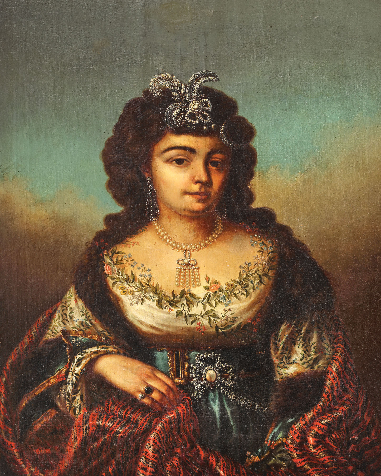 Smaranda Balș (1785-1848), odată promisă viitorului domnitor Mihail Sturdza, avea să devină totuși una dintre doamnele importante a societății moldovenești din prima jumătate a secolului al XIX-lea. Născută în familia Sturdza, fiică a marelui logofăt Alexandru Sturdza (1758-1831) de la Ruginoasa și a Ecaterinei Moruzi (1767-1835). Înrudită cu aceste două importante familii boierești muntenești și deopotrivă moldovenești, Smaranda și soțul ei, Alecu Balș, aveau să beneficieze de favoruri, chiar doneșt, unchiul ei, Alexandru Moruzi, oferindu-le evident, beneficii. Urmașii Smarandei, ce își supraviețuia soțul cu 15 ani, au fost cei doi fii, Constantin și Gheorghe, primul moștenind domeniul familiei Balș de la Dumbrăveni. În ceea ce privește portretul realizat vistiernicesei, putem presupune că acesta este realizat în primii ani de căsnicie (se căsătorea în 1798 cu Alecu Balș) și, având în vedere activitatea lui Topler în Țările Române, probabil după 1800. Putem presupune că și acest portret este urmare a legăturii de sânge între Smaranda și Moruzești, căci nu oricine pueta beneficia de măiestria portretistică a lui Mihail Topler la acea oră. Se știe că unul dintre cele mai timpurii portrete pe care le realizează artistul din Boemia a fost cel al domnitorului Alexandru Moruzi, pe când conducea Țara Românească, în anul 1800. Pe această filieră este foarte probabil să se fi intersectat și modelul de față cu Topler, beneficiind fără îndoială de serviciile celui mai înzestrat portretist al boierimii pământene de la 1800. Surprinsă în stil european, portret în peisaj, manieră preluată de Topler în urma anilor petrecuți la Viena, Smaranda este portretizată în fastul tipic portretului de aparat. Coafura bogată, în stil oriental, este înnobilată de șalul de mătase și de anteriul îmblănit la guler. Aceste elemente tipice orientului sunt îmbinată armonios cu elemente ale modei vestice: rochia cu talie înaltă, prinsă cu centură aurie sub sâni, decolteul oval și larg, iar bijuteriile - broșa cu diamante și perle, colierul luxuriant din perle și broșa pafta tot cu perlă, ne indică fără îndoială zestrea prețioasă de care beneficia tânăra Smaranda. Măiestria lui Topler se vede atât în pictarea chipului în sine, cât mai ales în dibăcia cu care reproduce decorațiile și aspectul vaporos al materialelor (cu siguranță scumpe) veșmintelor modelului.
