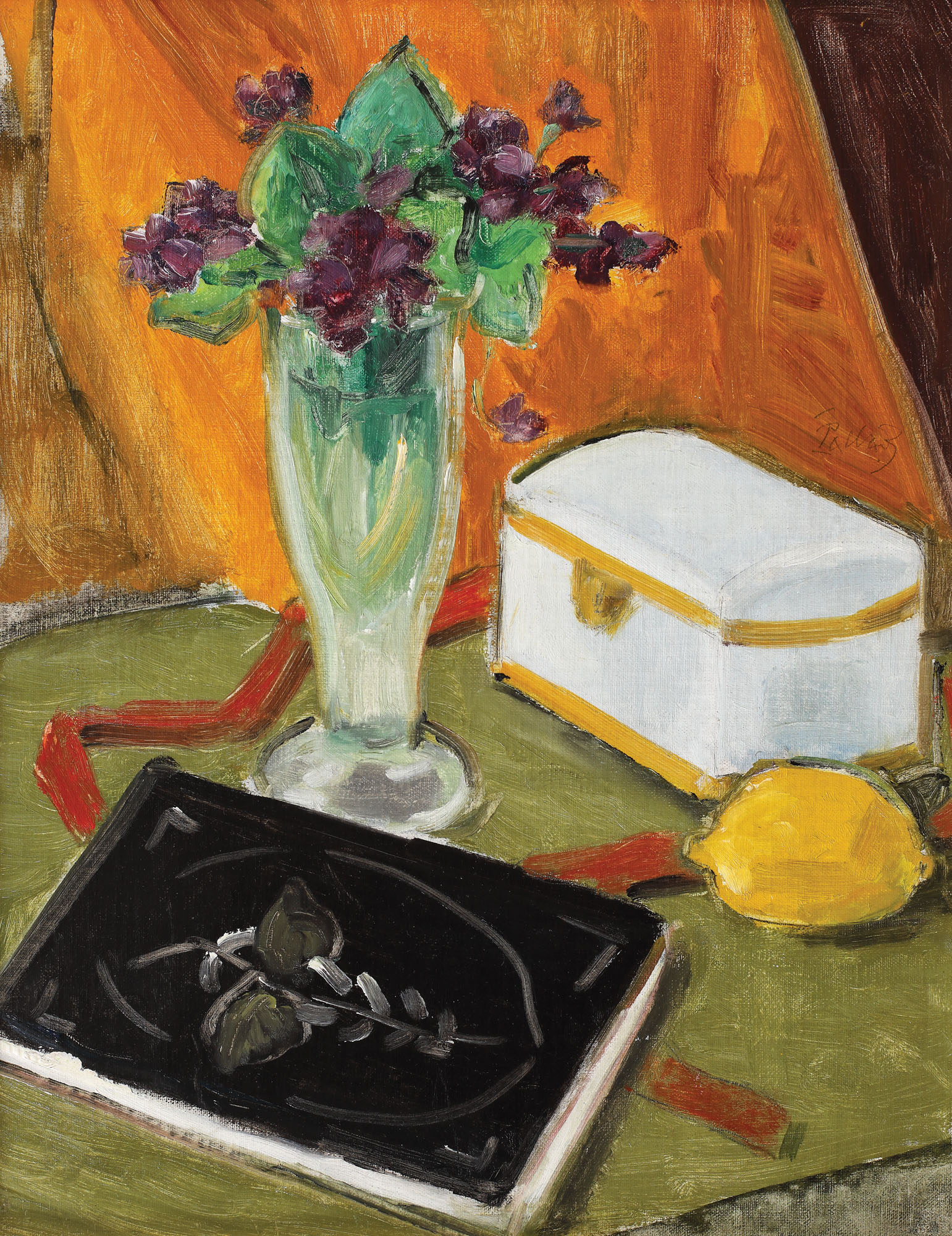 Manifestându-se cu statornicie în pictura de interior, cu care se simțea cel mai familiar, artistul Pallady va crea în acest spirit aproape tot restul vieții sale. Astfel, opera sa va fi formată din subiecte precum naturi statice, scene de gen, portrete sau nuduri. Cu o recuzită mereu distinctă, formată din obiecte precum: vaze cu flori, tablouri, cărți, cutii, periodice, fructe, cuțite, ochelari, pipe sau statuete, compozițiile sale se vor afla întotdeauna într-un echilibru perfect, atent stabilit de artistul perfecționist. Deși prin natura lor modeste, obiectele recuzitei sale sunt transfigurate într-o simfonie de sensuri, ritmuri și culori, subiectul real al unei compoziții de interior fiind poetica sa, revelată prin expresii, intensități și armonii. Un echilibru evident se remarcă și în cazul alcătuirii formelor și cromaticii, fundamentate de legi ce guvernează raporturile compoziționale. Intim implicat în tehnica meșteșugului său, precum și în alcătuirea arhitecturală a compoziției, a coloritului, a ritmului și a atmosferei, Pallady va fi un original interpret al materialului. Predilect al uleiului, artistul va converti acest material, în general onctuos, în interpretări temperate, stinse, mate. Constituind o mare parte a operei sale, naturile statice sunt genurile care i se potrivesc cel mai mult, oferindu-i o deplină libertate în ceea ce privește spiritul de construcție și de sinteză, în vederea creării unei ordini și a unui echilibru armonios. Frecvent remarcate în ambianța naturilor statice - pe lângă nelipsitele obiecte - vor fi și florile. De diferite specii și nuanțe - lalele, crizanteme, brândușe, toporași, cârciumărese, flori de soc sau narcise, florile iau parte la alcătuirea unor compoziții complexe, unde cotidianul, intimul și obiectele familiare își dezvăluie misterul, transfigurându-se. (G.M.)