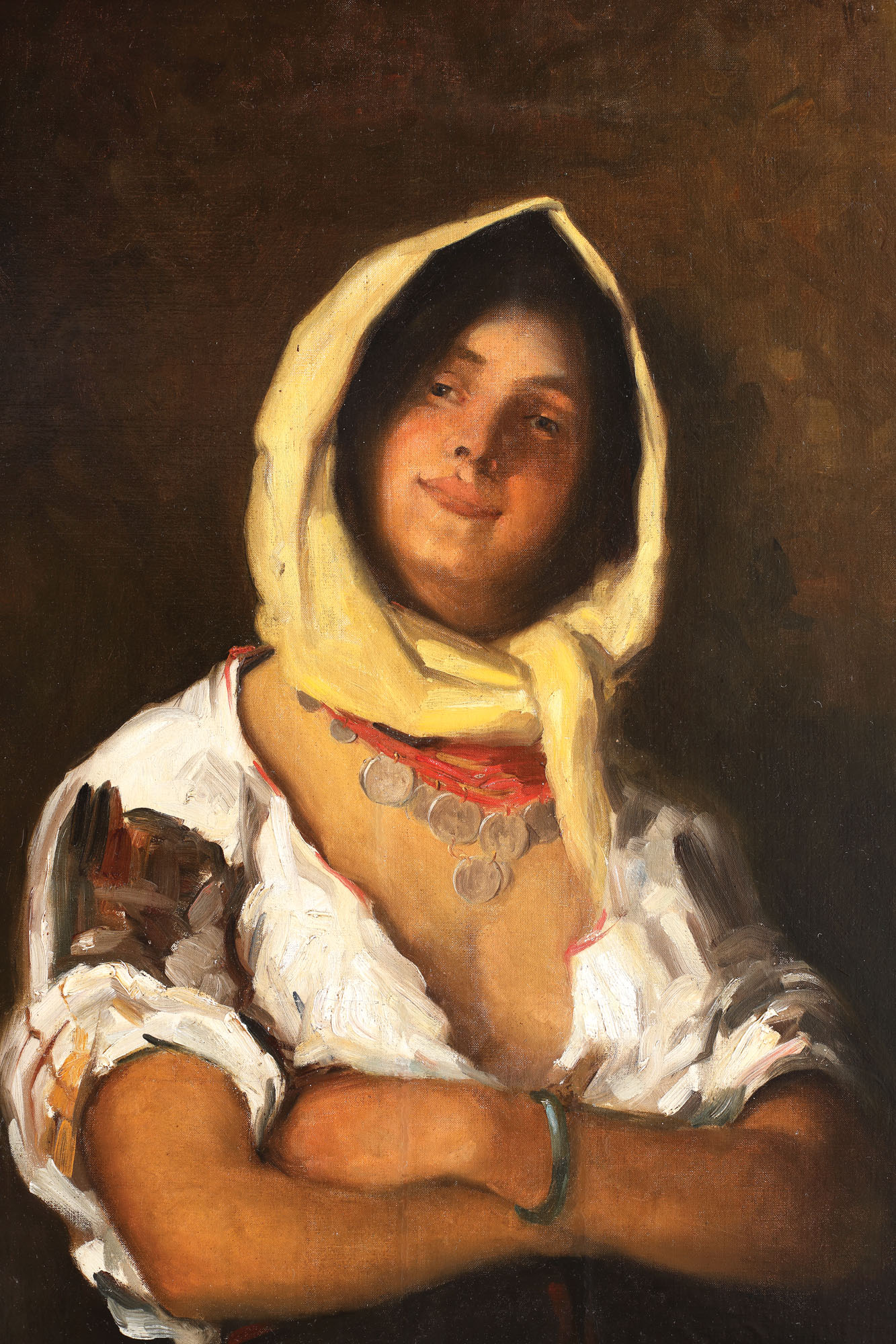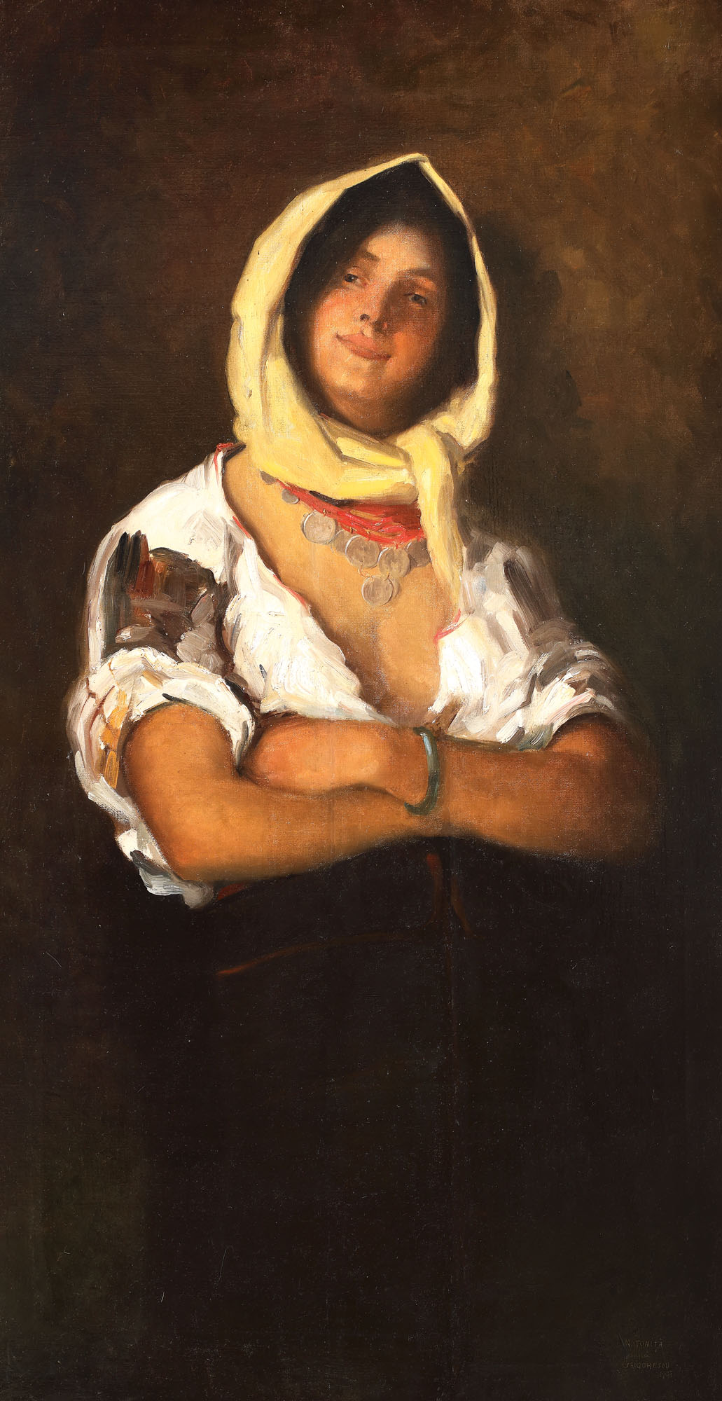 pe verso, autentificare de Alexandru Moscu: "Tabloul din față este o copie de Tonița după tabloul original al lui Grigorescu, Țigancă din Bolduri"