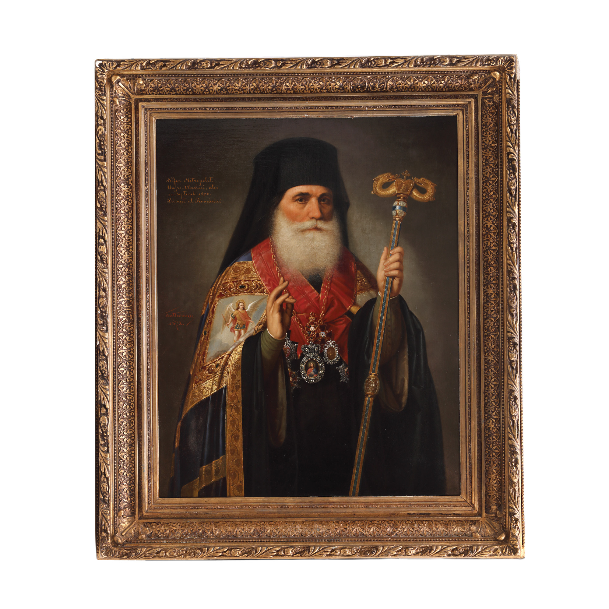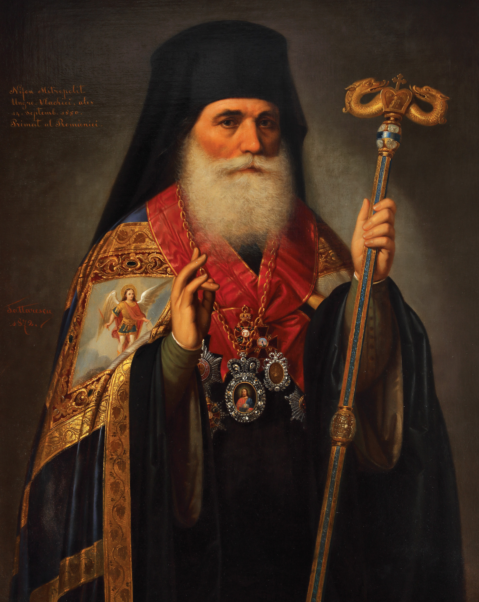 semnat și datat lateral stânga, cu ocru, "Tattarescu, 1872"; notat stânga sus, cu ocru, ”Nifon Mitropolit Ungro-Vlachiei ales în 14 Septemb(rie) 1850, Primat al României”