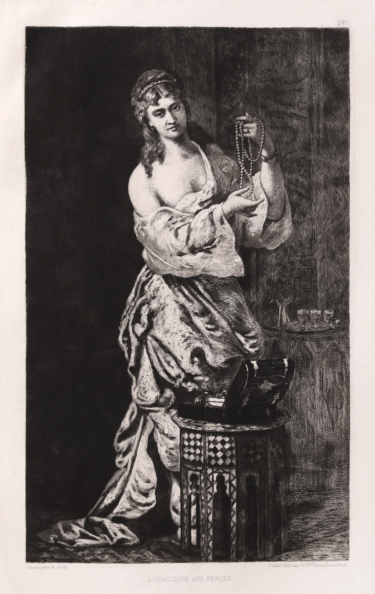 semnat stânga jos, "Aman, pinx. et sculp."; intitulat central jos, "L'ODALISQUE AUX PERLES"; menţionată editura şi adresa dreapta jos, "Cadart, Edit. Imp., 56 B-ard Haussmann, Paris"