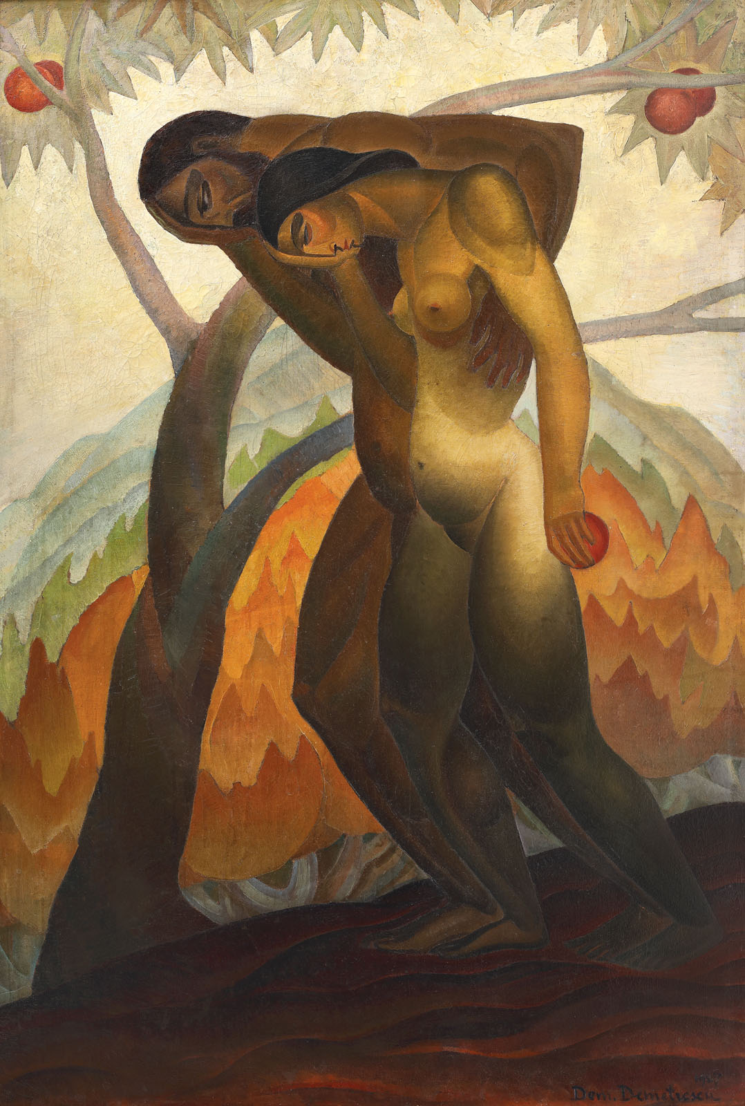 Cunoscut mai mult pentru activitatea sa în grafică, ca ilustrator de cărți, reviste pentru copii sau cărți literare, artistul Ion (Dem) Demetrescu va practica în preajma anilor săi de început și arta picturii. Deși prezent în cadrul Saloanelor Oficiale încă din anul 1924, unde debuta cu lucrări de grafică, câțiva ani mai târziu, în 1927, artistul Demetrescu va adera ca student al Academiei Libere de Pictură, inițiată în anul 1919 de pictorul Arthur Verona, pe care îl va avea și ca profesor. Ca tehnici, vom remarca uleiul sau tempera, prezente în lucrări precum: „Adam și Eva”, dar și în alte lucrări mai târzii precum: „Macedoneancă”, „Mănăstirea Comana” sau „Turnul Galata, Istambul”. Printre temele abordate de artist se vor remarca temele biblice, prezente în lucrări precum „Adam și Eva”, pe care o expunea în anul 1927 în cadrul Salonului Oficial. Inspirată din sacru, tema ilustrează izgonirea din Rai a lui Adam și Eva- protopărinții neamului omenesc. Scena, reprezentată de artist la scară mare, descrie întâmplarea în detalii subiective. Protagoniștii, poziționați aproape central, înfățișează sentimentele primordiale resimțite de primii oameni- și anume căința și resemnarea. Reprezentate în culori întunecate, pământii, fără prezența luminii, detaliile afective alcătuiesc paleta coloristică a compoziției. Mărul din mâna Evei- motiv al inculpării și al vinei, ocupă un loc simbolic, un simbolism resimțit în întreaga scenă compozițională. (G.M.)