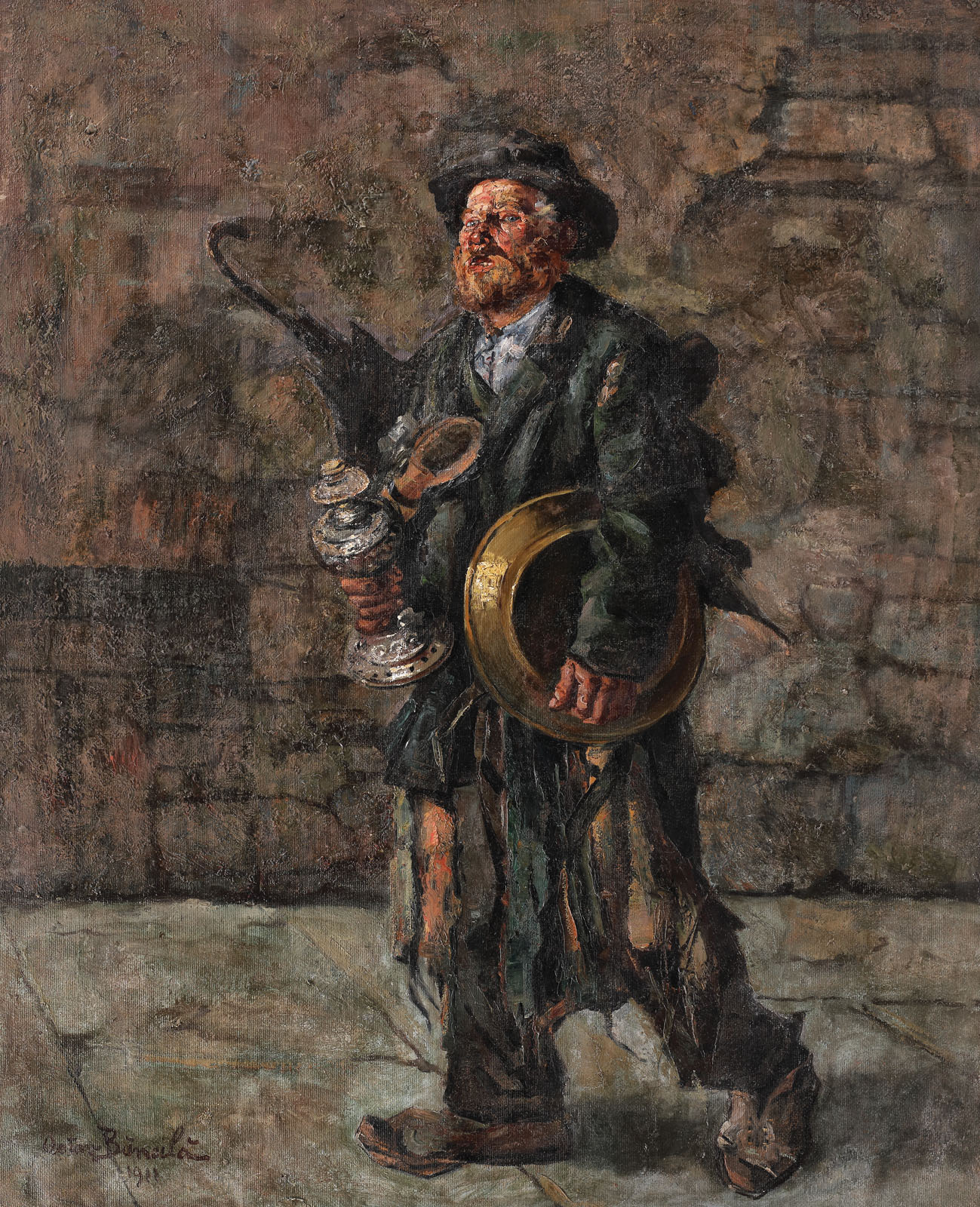 Pictor de accente răspicate, viguros glăsuitor și fire năvalnică, Octav Băncilă se află continuu în căutarea acțiunii, a mișcării și a luptei de viață, aducând prin creația sa un puternic conținut de real, recurgând adesea la forme dinamice ca un temerar. Preocupările sale pentru descrierea faptelor, pentru jalea poporului sau a oricărei forme de nedreptate vor reprezenta însăși temele repertoriului său artistic. După terminarea studiilor la München și după călătorii la Paris și Italia, pictorul revine în țară în anul 1898 și se stabilește la Iași, unde efectuează serviciul militar timp de doi ani. Ajuns aici, pictorul își va instala un atelier în curtea gimnaziului „Ștefan cel Mare”, de pe strada Sărăriei, unde director era cumnatul său, Gheorghe Nădejde; ceva mai târziu, își va muta atelierul pentru o perioadă în curtea Mitropoliei, fiind adăpostit de diaconul Gheorghe Șerban. Pe timpul șederii sale la Iași, artistul va descoperi noi subiecte de pictură, pe care le va întâlni în timpul deselor sale drumuri în cartierul Târgu Cucu, loc unde pitorescul naturii se îmbina cu sărăcia oamenilor. Pe lângă minunatele priveliști spre Tătărași, cartierul nu era decât o aglomerare de dughene sărace, posedate de evreii care se ocupau cu mici negoțuri. Meseriașii bătrâni, cârpacii, peticarii, vânzătorii de haine vechi- așa zișii telali, sau bătrânii aflați la ora rugăciunii ori la sfat deveneau astfel noile sale subiecte picturale, (tratate și înainte, la München cu câteva ocazii), contribuind prin realism și verosimil la o pictură matură. (G.M.)