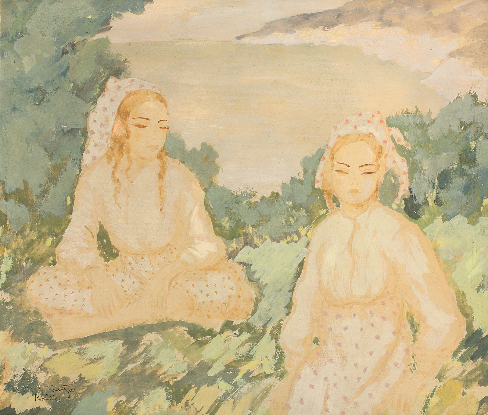 Opera surprinde ochiul privitorului prin prezența celor două femei de origine orientală. Ambientate în mijlocul naturii, așezate pe iarba verde pal, cele două femei lasă să se vadă în spatele lor, apa mării arse de soare și stânci de pământ galben, într-o după-amiază călduroasă de vară. Ochi migdalați și încărcați de nostalgie, tainici, languroși, șalvari ampli de culoarea caisei, creează transparența unor seminuduri de o puritate cu iz de senzualitate. Carnația pârguită se îmbină cu verdele copt al vegetației și cu auriul falezei argiloase, creând un peisaj dobrogean unic, liniștit și auster. Lucrarea reprezintă o viziune sintetică a realității dobrogene. Liniile folosite evită detaliile ce nu-l intersează și se unduiesc creând suprafețe largi. Umbrele, contrastele, în acestă lucrare nu-l preocupă aproape deloc pe pictor. Spațiul dobrogean a reprezentat un deosebit farmec pentru artist, o lume pe care acesta a conservat-o în gândurile, scrierile sau picturile sale. Încă din perioada prizonieratului, Tonitza publică în 1925 un poem în proză “Când moare Darimé” care reflecta percepția artistului despre femeile orientale ce aveau să ocupe un loc important în lucrările sale de mai târziu, de la Balcic. “Am presărat pe aleile din grădină pulbere de sidef pentru că tălpile ei erau mai roze și mai fine decât petalele trandafirilor… Am țesut pentru ea un chioșc din fire de mătase ca soarele să nu o atingă, căci trupul ei era mai alb decât albul pieptului de porumbiță… Am hotărât să smulg din părul ei toate pietrele prețioase, fiindcă, în părul ei, pietrele prețioase păreau hârburi netrebnice… Când râdea, râsul ei desfăcea în laturi norii, căci râsul ei era singura bucurie a cerului…” [NICOLAE TONITZA, Când moare Darimé, apud PETRU COMARNESCU, N.N. Tonitza, Ed. Tineretului, p. 277-275] “Turcoaice la Balcic” aparține foarte probabil perioadei 1936-1937 (ultimii ani ai creației sale), ani în care artistul a fost de mai multe ori la Balcic, fascinat de lumina diafană a ținuturilor. În anii ce urmează, artistul se îmbolnăvește grav, încercând pentru ultima oară, în august 1939, la Sinaia, să picteze un peisaj, pe spatele căruia se găsește scris: “ultima svârcolire artistică a neuitatului nostru Tonitza…” (cf. RAOUL ȘORBAN, Tonitza, Ed. Meridiane, Sibiu, 1973, p.57) Artist realist (grafician, pictor, critic de artă deopotrivă), Tonitza a lăsat artei românești o operă profund pătrunsă de o mare umanitate. Pictorul copiiilor, cântărețul frumuseților corpului omenesc și al florilor, în ultima perioadă a vieții descrie, prin culori blânde, viața Balcicului pe care l-a admirat, pentru prima oară, în 1933. (M.N.) "Turcoaicele cu ochii de migdală, cu părul ascuns sub turbanele strânse pe cap, cu sfioșenia lor plină de taine, Tătăroaicele cu șalvarii împodobiți de buline roșii sau albastre, cu trupul mlădios și subțire, cu farmecul lor exotic îl atrag, îl pasionează. Începe din nou să lucreze, dar se oprește la schițe, la studii mici[…]. Se îndreaptă spre un decorativism sumar, spre o sensibilă caligrafiere a formelor, în câteva tonuri de culoare reduse. Cele “Două Turcoaice” din colecția Lt. Col. Borneanu (planșa No.42) arată însă toată grația desenului său abil, tot farmecul evocării unui moment sensibil și delicat". Ionel Jianu, „N.N.Tonitza”, Ed. Căminul Artei, București, 1945