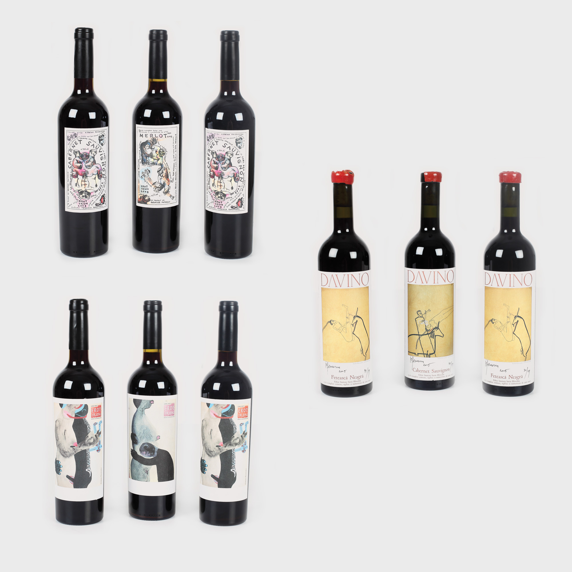 Colectia Erotikon, o serie limitată la aproximativ 2000 de sticle din fiecare vin, a fost un punct de plecare pentru câteva dintre cele mai interesante asocieri din lumea vinurilor românești. În primul rând ea reprezintă prima gamă a Cramei Oprișor din inițiativa generic numita "Artă și Vin" prin care producătorul din Mehedinți a dorit să ofere ceva mai mult consumatorului decât un simplu vin. A fost și prima colaborare a Cramei Oprișor cu artistul plastic Ciprian Paleologu, cea care a trasat o linie pentru alte colecții similare. Această linie este în continuare urmată, noi etichete fiind lansate de atunci, altele deja anunțate și asteptate în viitor. Este cunoscut suportul echipei Davino pentru arta din România: pe de o parte ca și colecționari, pe de altă parte ca susținători ai tinerelor talente încă de pe băncile facultății prin acordarea de premii și burse. Cutia Ilfoveanu a fost o ediție extrem de limitată de vinuri din recolta anului 2005 ce au purtat fiecare câte o etichetă diferită realizată de faimosul artist Sorin Ilfoveanu. În afară de noutatea etichetei, această ediție foarte limitată reprezintă ultimele inițiative ale cramei de a îmbutelia separat fiecare soi de strugure separat. Cele două vinuri propuse din gama etichetelor Ilfoveanu sunt vinuri unice atât din prisma unicității unui vin de cea mai bună calitate cât și a unei etichete produse într-o singură ediție, cea din 2005. Cele trei sticle din gama Ilfoveanu au capișonul din ceară usor crăpat.