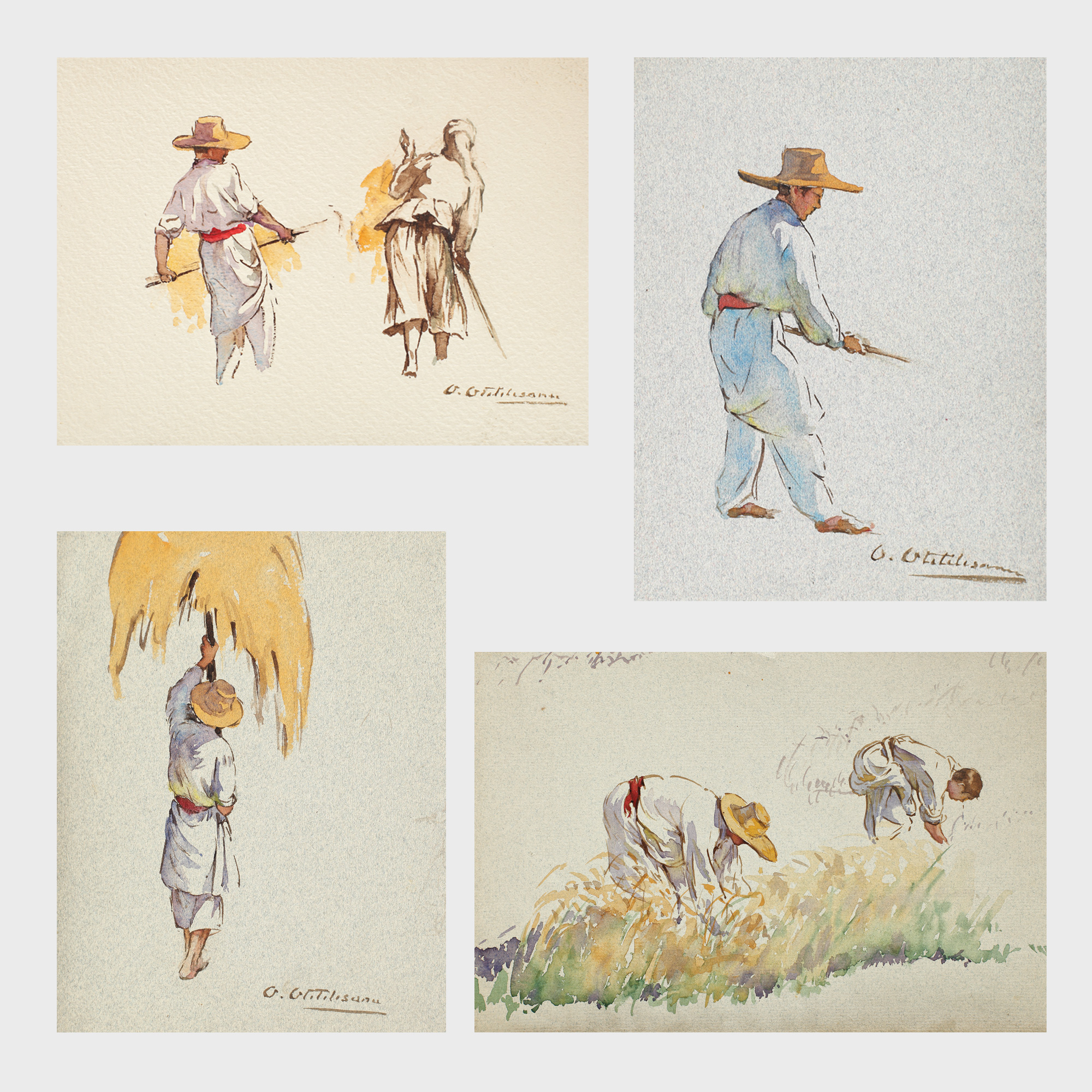 A. acuarelă pe hârtie, 13 × 10 cm semnat dreapta jos, cu brun, O. Oteteleşanu B. acuarelă pe hârtie, 16,5 × 11 cm semnat dreapta jos, cu brun, O. Oteteleşanu C. acuarelă pe hârtie, 11 × 16 cm semnat dreapta jos, cu brun, O. Oteteleşanu D. acuarelă pe hârt