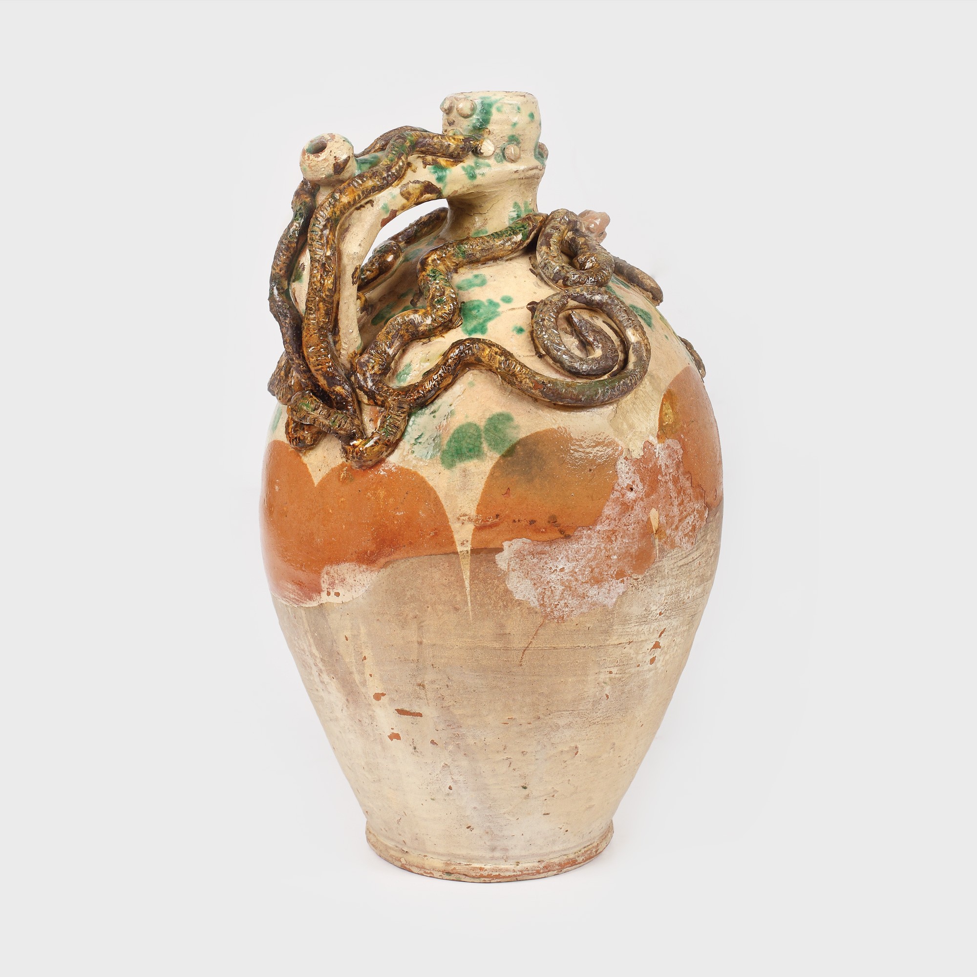 Piesă cu funcţie ceremonială, "ulciorul cu şerpi" era în Oltenia darul pe care naşii îl făceau finilor - umplut cu ţuică. Prezenţa şerpilor care se luptă (sunt reprezentaţi încleştându-şi capetele) aduce în discuţie străvechile simboluri ale fecundităţii pentru noul cuplu cât şi funcţia de protecţie a acestuia. Forma este tipică ulcioarelor utilitare, bitronconică, având mâner cu "ţâţă" de băut. Decorul este amplasat în jumătatea superioară, sub gât, fiind realizat prin stropire cu pigment verde şi brun pe fond angobat şi sculptural, prin modelarea şi aplicarea celor trei perechi de şerpi. Starea de conservare a smalţului este proastă, prezentând desprinderi şi rosături.