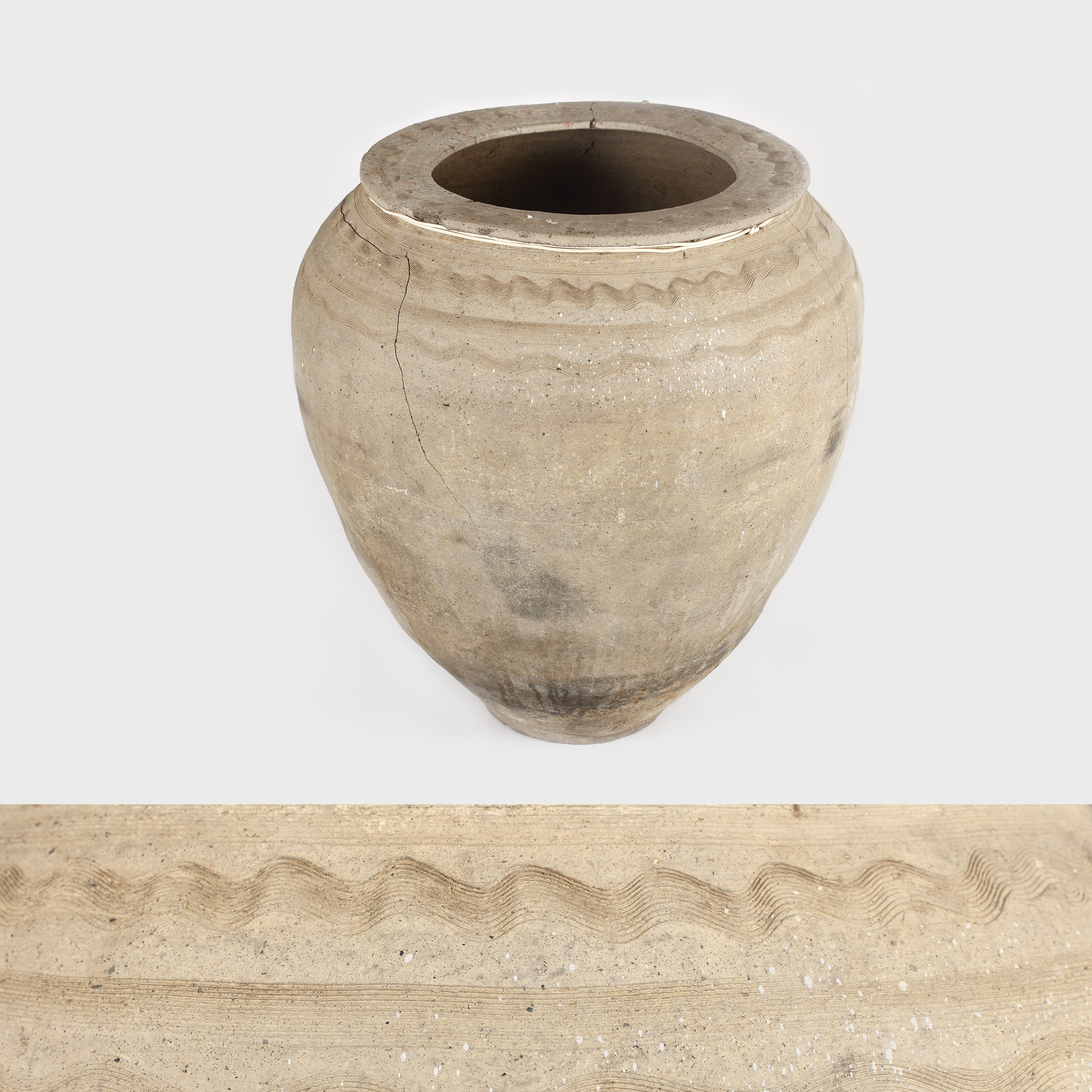Vasul este realizat din ceramică de bună calitate și a fost lucrat la roată de un meșter anonim, apoi ars în cuptor. Piesa se încadrează tipologic și cronologic în cadrul culturii Sântana de Mureș - Cerneahov care s-a dezvoltat între secolele II – V pe un vast teritoriu care acoperă părți de astăzi ale României, în special în Transilvaniei și Muntenia, Republicii Moldova, Ucraina și Bielorusia. Vasul era utilizat pentru păstrarea proviziilor, cel mai probabil a cerealelor. Corpul este bombat, cu o gură largă cu margine lată. În registrul superior se poate remarca un model realizat prin incizare sub forma a trei șiruri paralele, două ondulate, unul drept. Același model ondulat se poate observa și pe partea superioară a buzei. Starea de conservare este bună, vasul prezentând câteva fisuri.