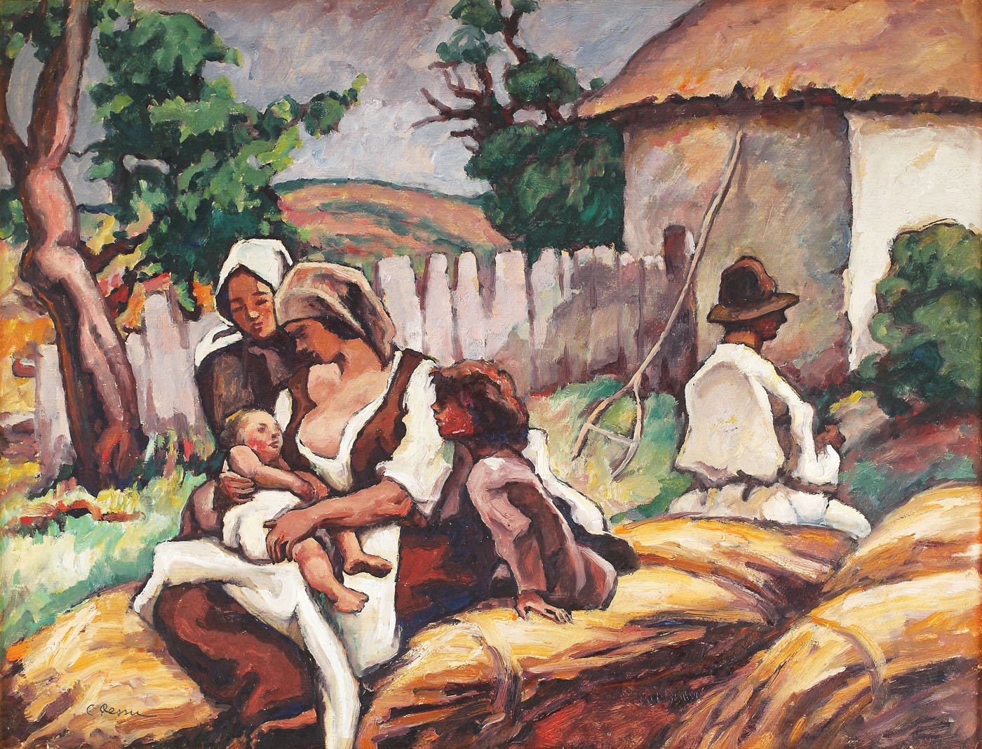 După picturile inspirate din viața țăranului român, expuse în 1910, la prima sa expoziție din cadrul Tinerimii Artistice, predilecția lui Camil Ressu pentru subiectele cu caracter rural și nota originală pe care le aduceau în această privință a fost observată de către critici. Ressu punea fundamentele unei imagini a țăranului, diferită de cea propusă până în acel moment de Grigorescu, epigonii maestrului fiiind o “problemă” a acelor primi ani de la dispariție. Picturile cu subiecte țărănești realizate de artist aveau un caracter accentuat de “manifest pictural”. Operele cu țărani ale lui Ressu au demonstrat o aptitudine proprie sensibilității sale, aceea de a percepe și evoca cu vigoare autenticitatea vieții arhaice și comuniunea omului cu natura. Tocmai de aceea subiectul va dăinui în creația artistului nostru până către ultimii ani de creație, chiar dacă sub diferite forme, stiluri sau abordări. În ceea ce privește regimul cromatic, Ressu va folosi o paletă variată, apropiată de cea impresionistă - pe care de altfel o depășește în jurul debutului, la 1910 -, care exclude pământiul, căutând să creeze valorații sensibile, dintr-o complexitate de tonuri. Uneori fauve, în special în alegerea purității culorilor primare, pictorul a împletit nu o dată paleta cu un stil cvasi-decorativ, amintit în acele peisaje în care natura este învăluidă de unduiri și linii fluide. Aproape în toate operele sale reprezentând peisaje sau personaje în peisaj (scene de gen) artistul urmărește construcția unei compoziții clasice, organizată astfel încât să poată reda un sentiment de liniște și pace, stare afectivă care exprimă, în viziunea lui Ressu, sinteza spațiului românesc. Folosind o paletă de armonii cvasi - fauve, artistul se manifestă ca un colorist preocupat de efectul exploziv al asocierilor cromatice, de șocul pe care-l provoacă exaltarea culorilor aduse la un înalt grad de saturație, echilibrate de monumentalitatea formelor, țăranul devenind mai mereu ax compozițional. De aceea Ressu se folosește de tipologii imaginare ca cea a maternității – subiect important în creația sa - “șiretlic” constructivist uzitat și în opera de față. (I.P.)