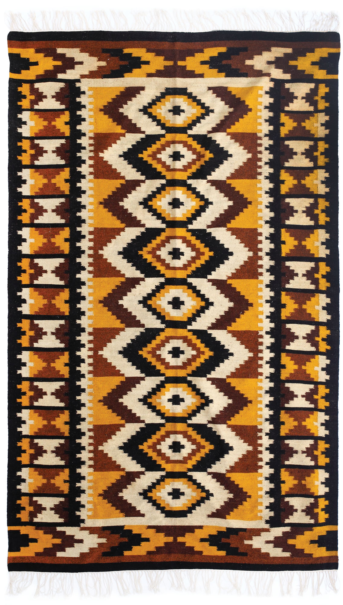 bumbac (urzeală), lână, băteală; ţesut în două iţe, cu urzeală ascunsă (scorţeşte), motive alese printre fire, ciucuri înnodaţi din firele de urzeală