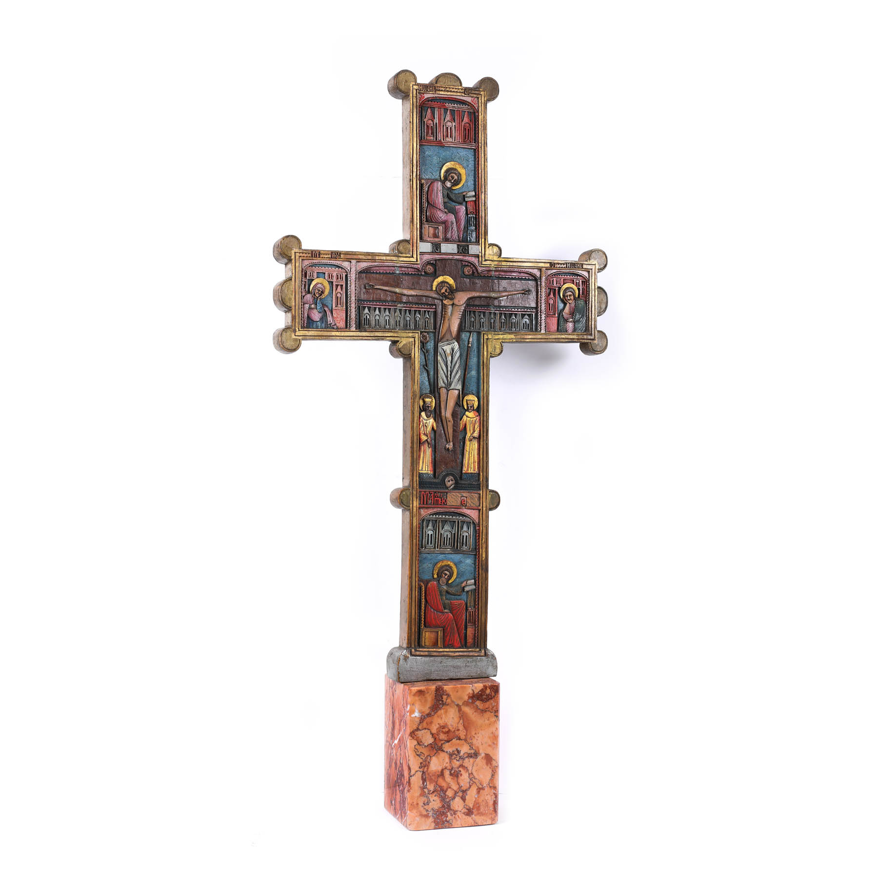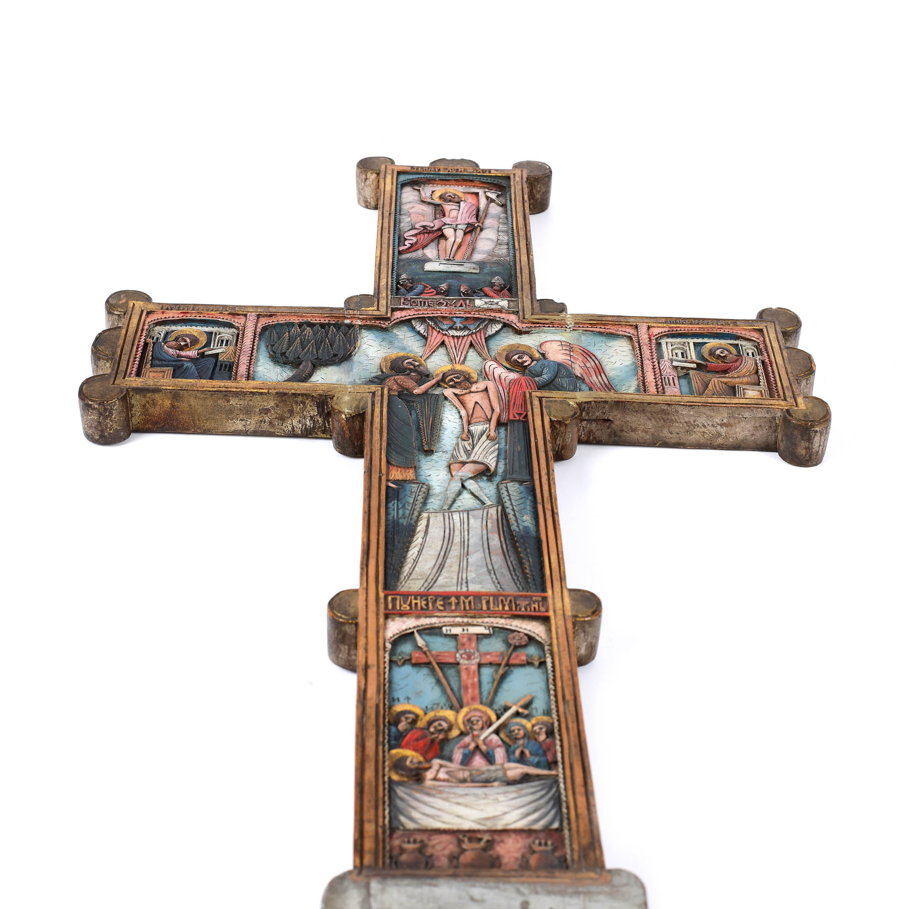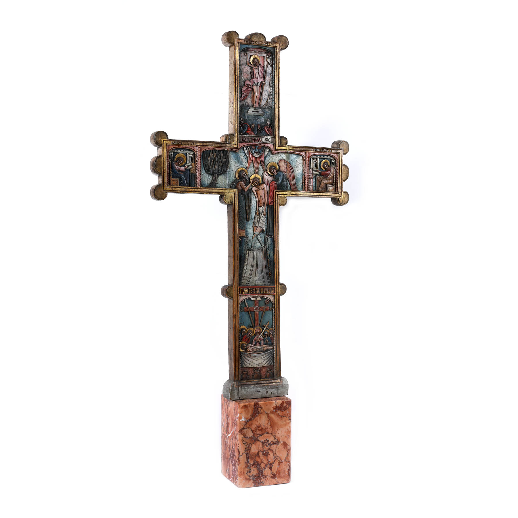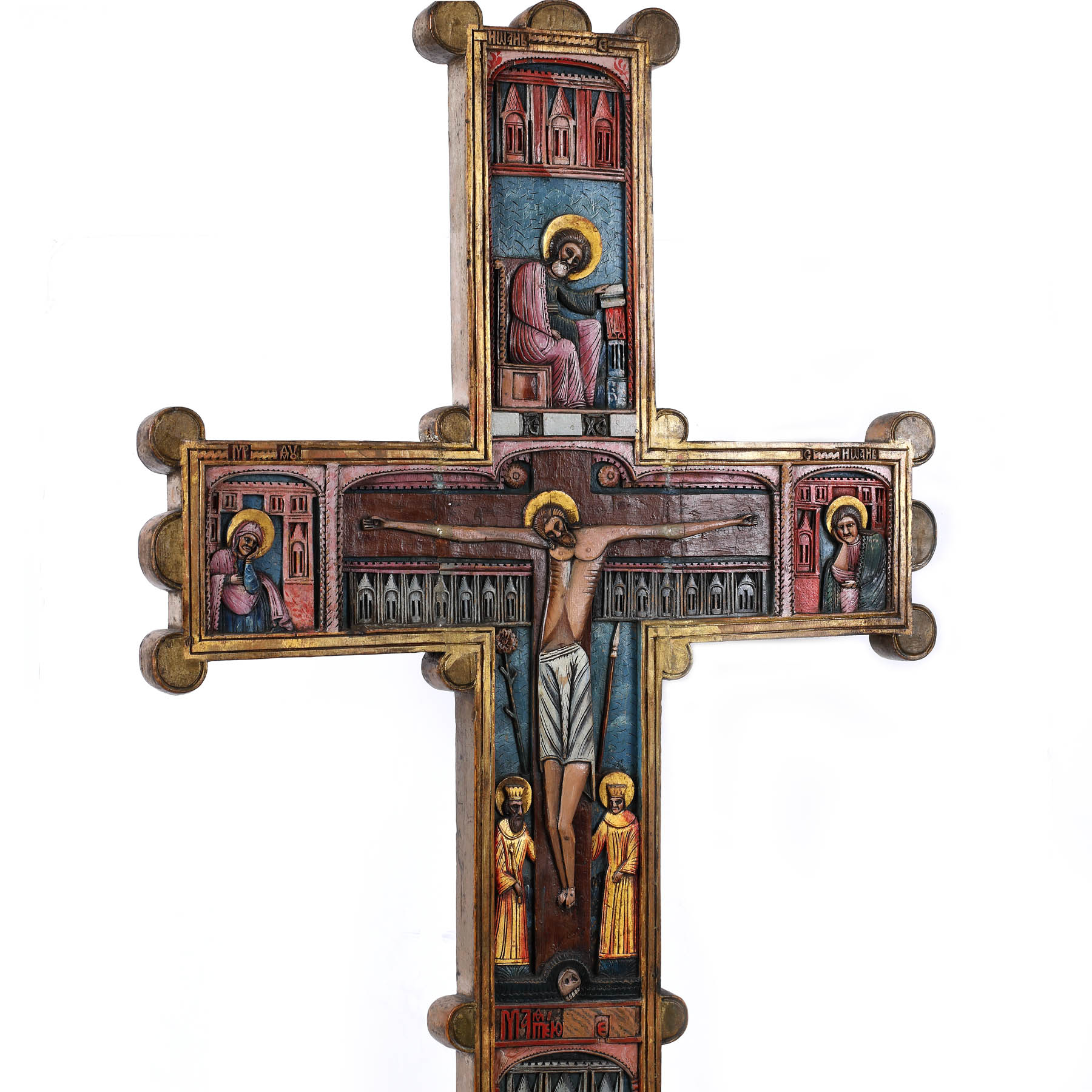 44. Cruce de altar, sculptată și pictată cu scenele ”Răstignirea” și ”Botezul Domnului”, școală românească, prima jumătate a sec. XIX, piesă foarte rară, de colecție [early 19th Century]