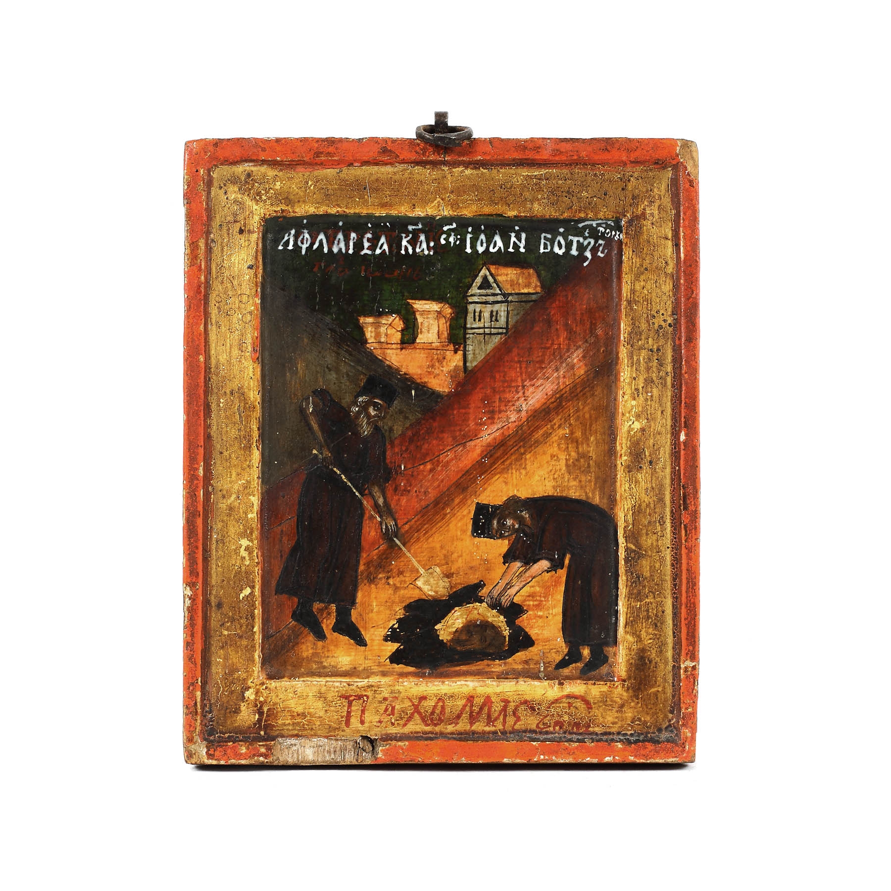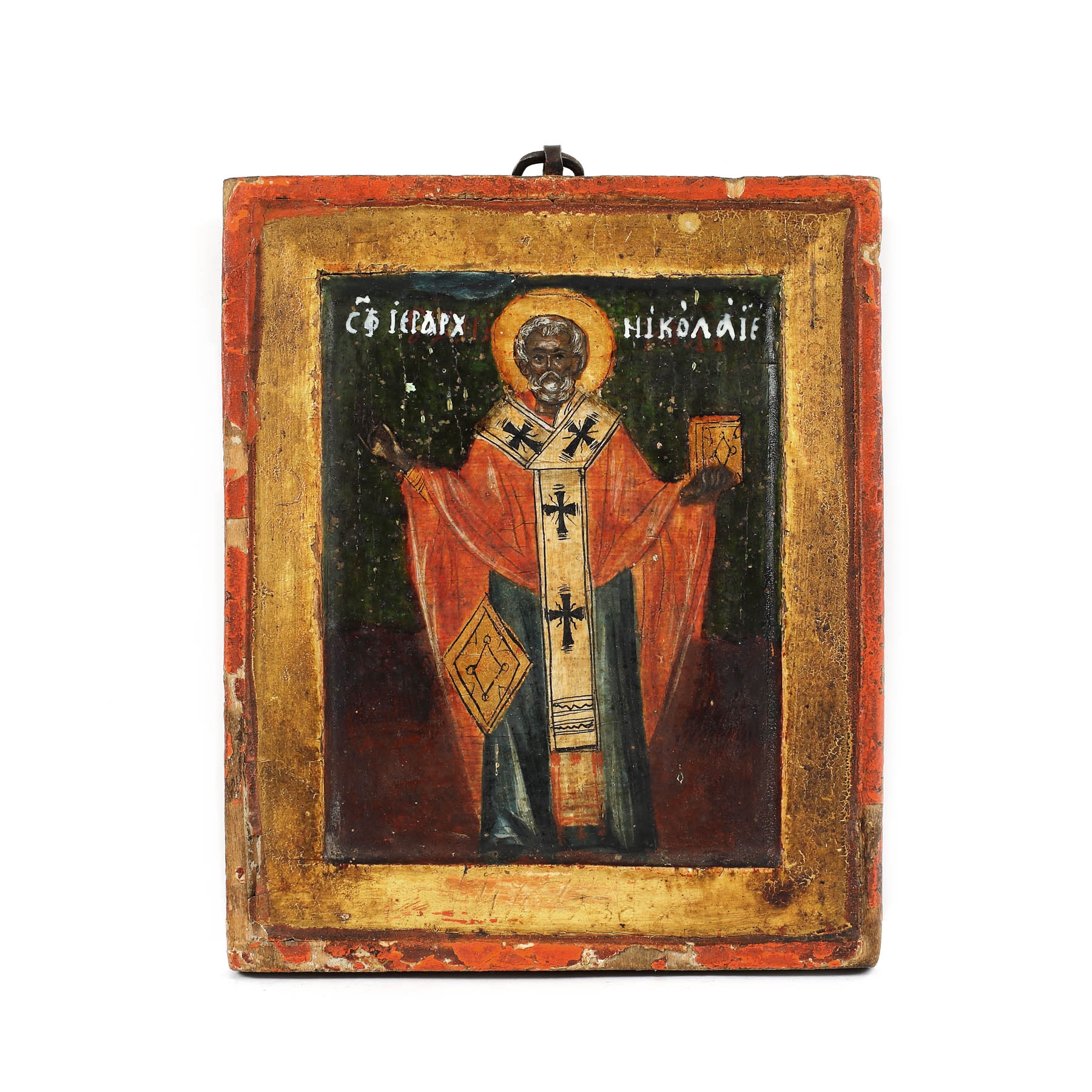 64C. Icoană dublă pe lemn, ”Sfântul Nicolae” și ”Aflarea Capului Sfântului Ioan Botezătorul”, școală moldovenească, zugrav Pahomie ieromonah, epoca lui Eremia Movilă, sfârșitul sec. XVI, piesă rară, de colecție [late 16th Century]