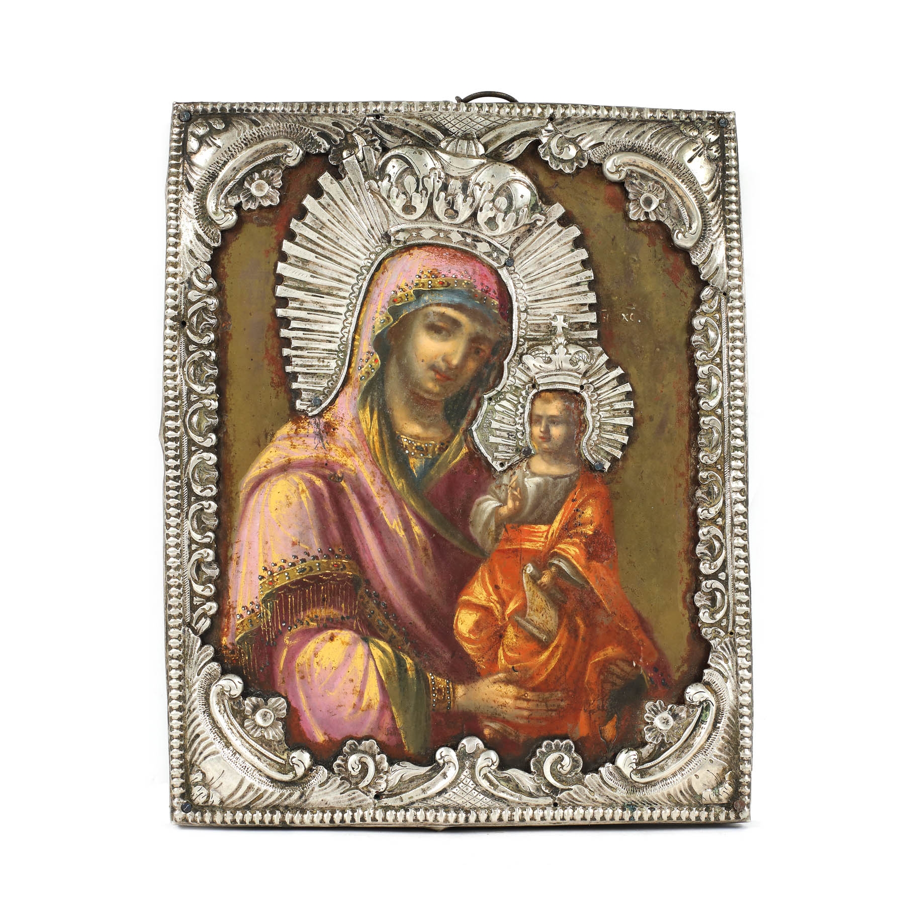67. Icoană pe lemn, cu riză din argint, ”Maica Domnului cu Pruncul (Hodighitria)”, școală românească, a doua jumătate a sec. XIX [late 19th Century]