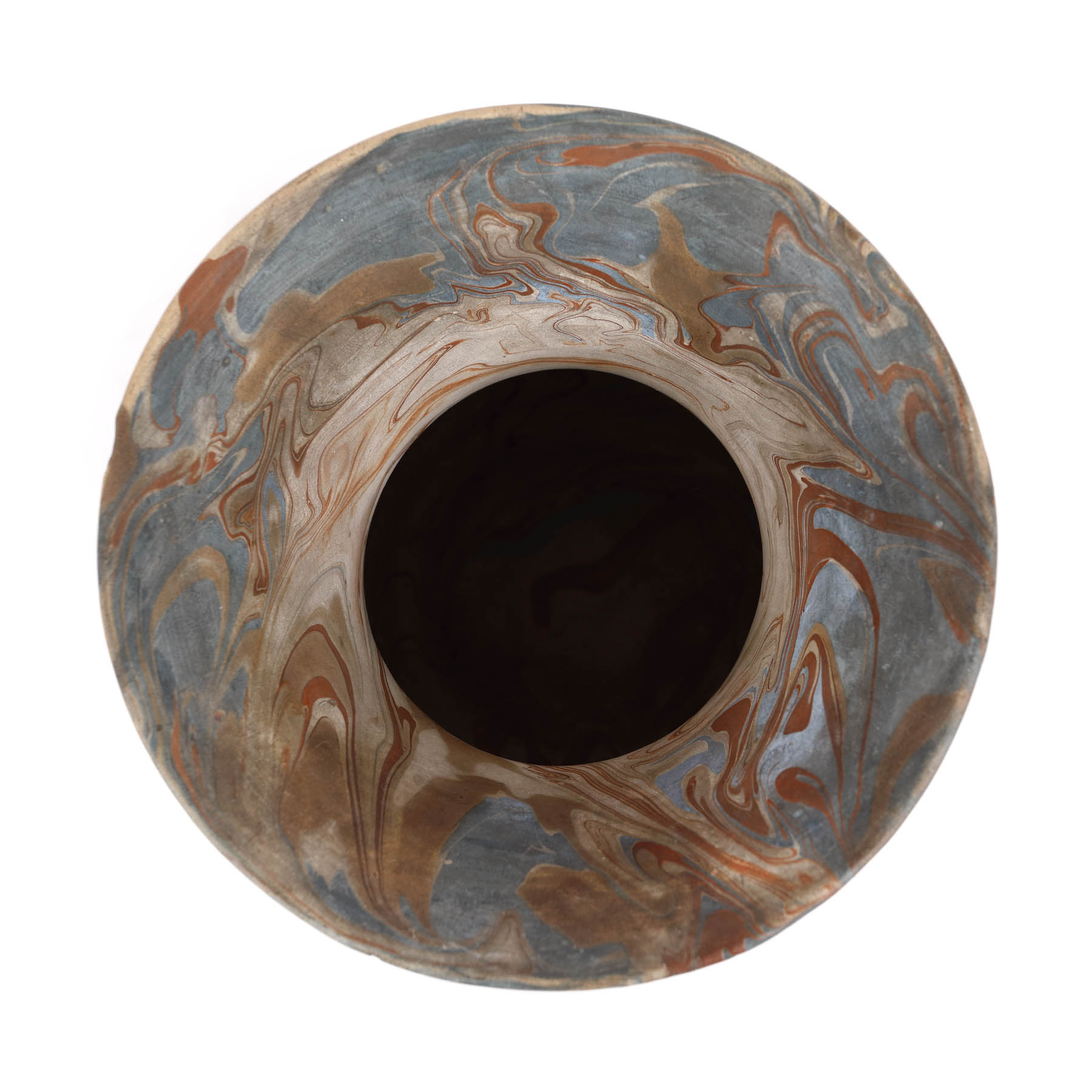 Piesa prezintă la bază inscripția ”J.Dh. din Filaret 1936”. Tipologia formei: sferică cu gura înaltă și evazată. Decorul este dispus la exterior, pe toată suprafața vasului. Compoziție decorativă și categorii de motive: motive vegetale - vrej cu frunze de arțar și cârcei, liber desfășurat pe toată suprafața vasului. Cromatica: fond grafit, motive cu alb. Starea de conservare este foarte bună.