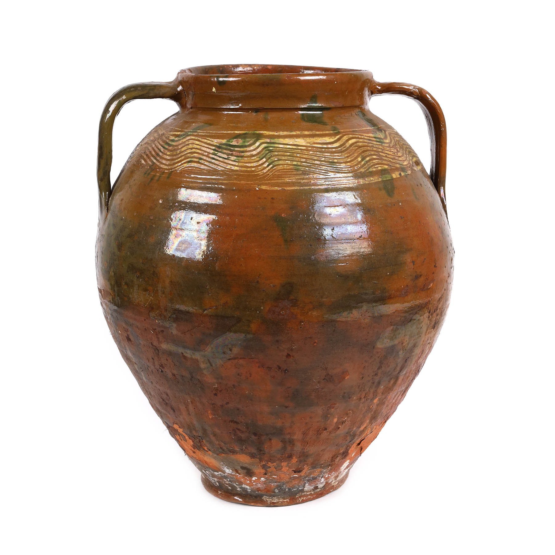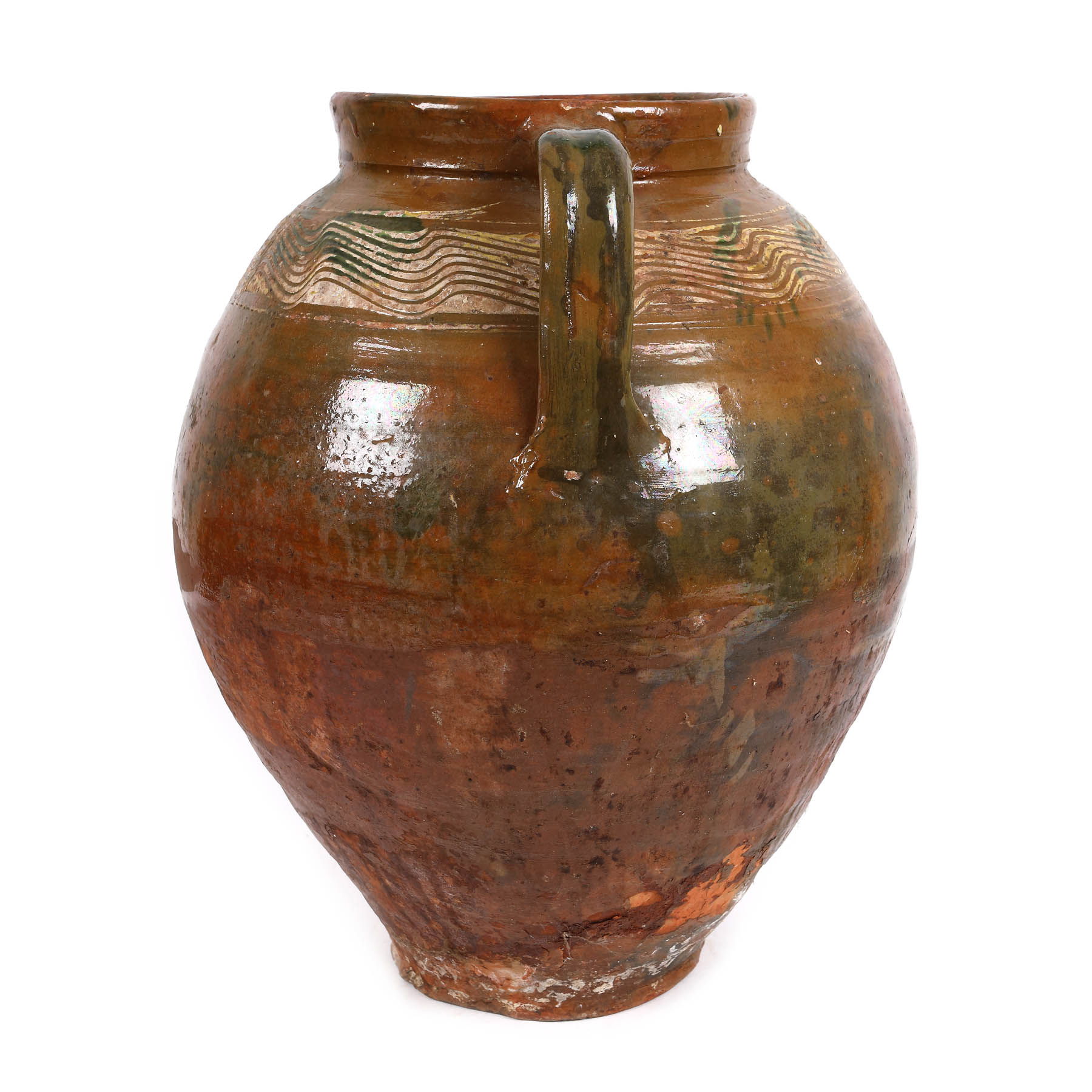 Piesa este modelată manual la roată, decorată cu cornul și prin stropire, smălțuită, ardere dublă. Tipologia formei: bitronconică cu gura dreaptă și două ”mănuși”/torți. Decorul este dispus la exterior, pe ”umărul vasului, între cele două torți iar compoziția este decorativă și prezintă următoarele categorii de motive: registru lat de motive geometrice-valul. Cromatica: fond cărămiziu, motive cu angobă albă și smalț verde. Stare de conservare satisfăcătoare, spre bază are mai multe zone în care argila este erodată.