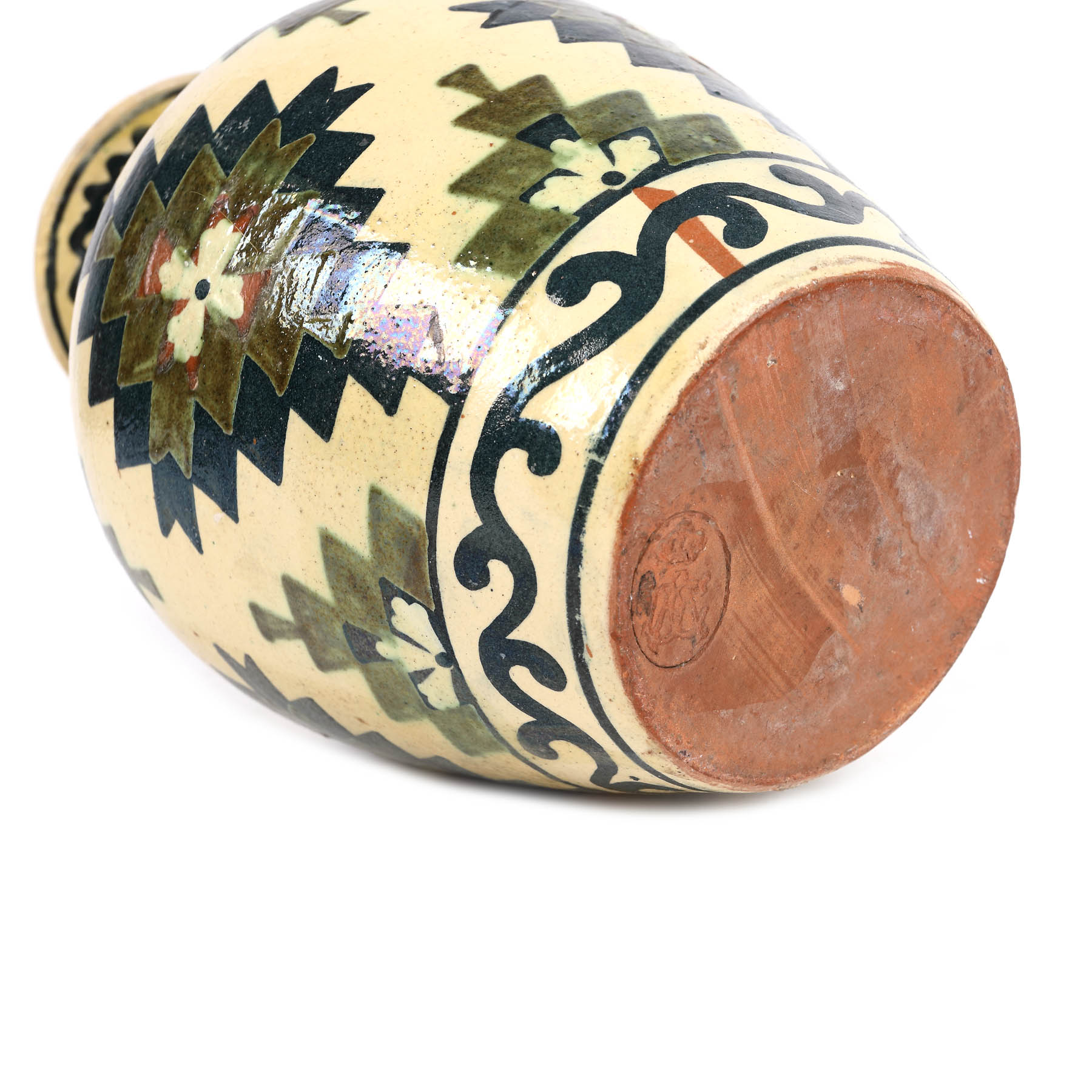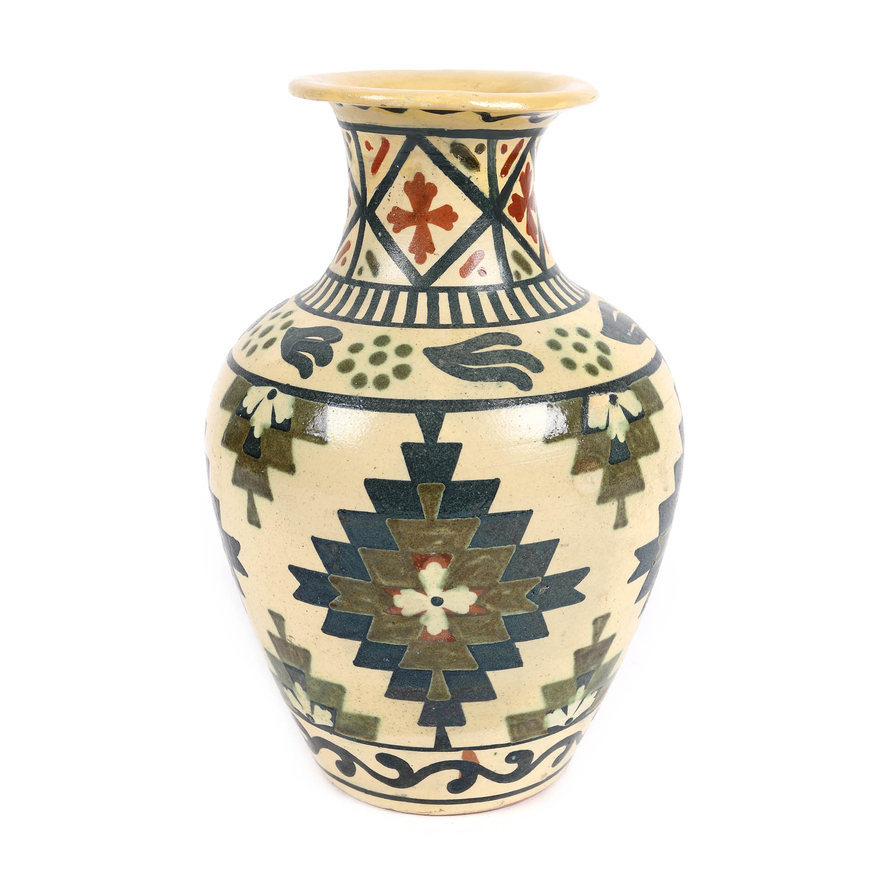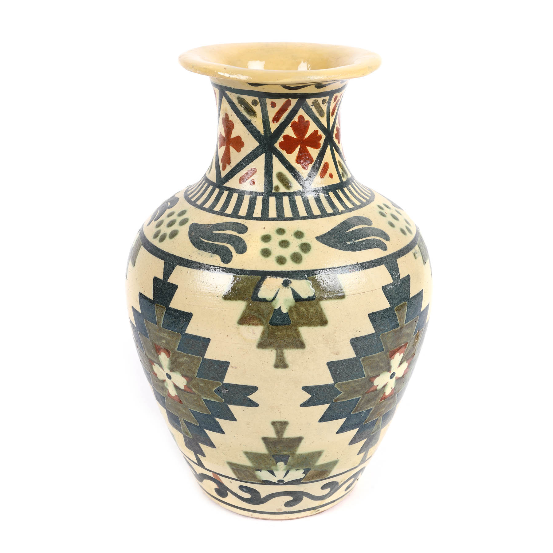 52. Vază pentru flori, decorată cu motive geometrice inspirate de covoarele tradiționale, lucrată în atelierele regale Troița, prima jumătate a sec. XX [early 20th Century]