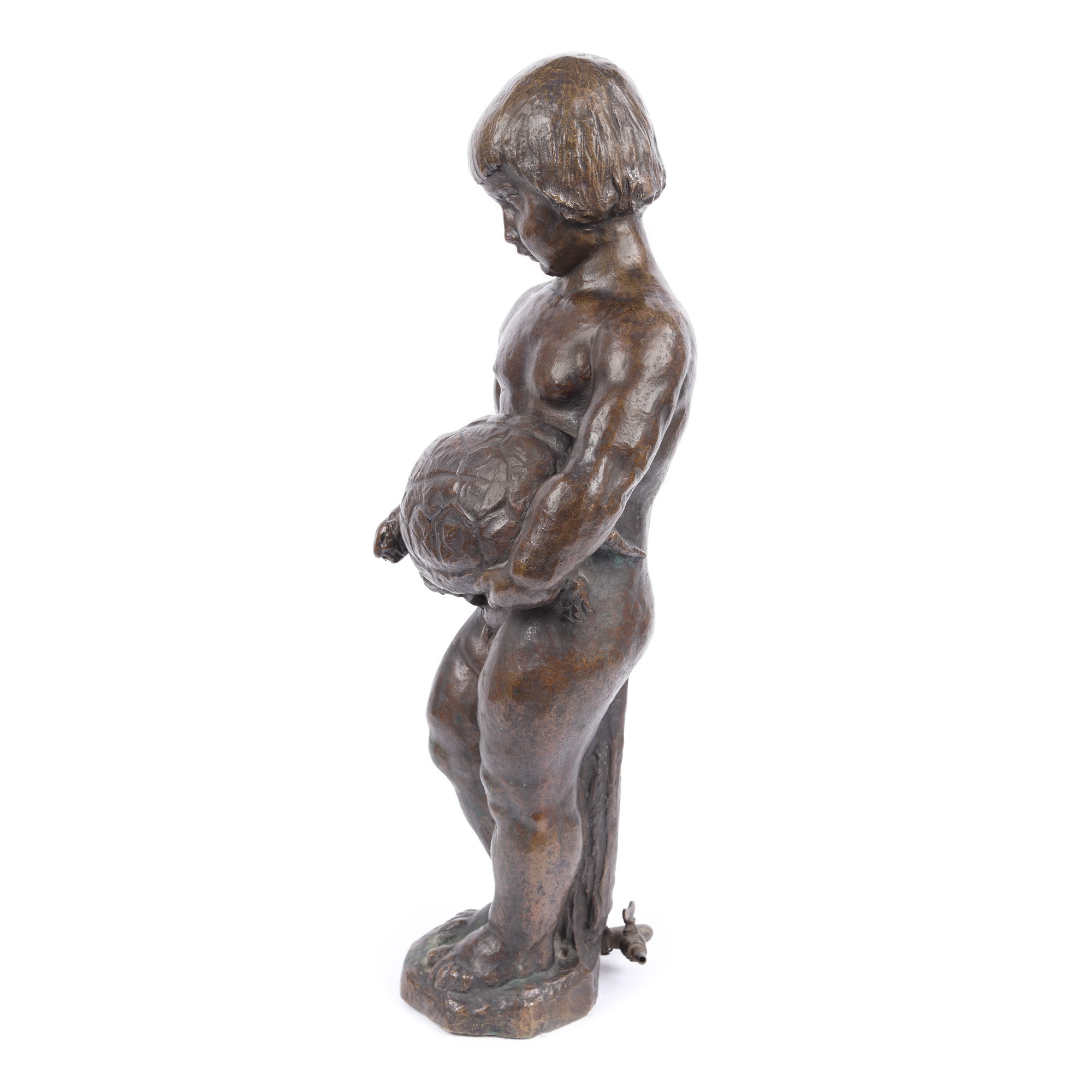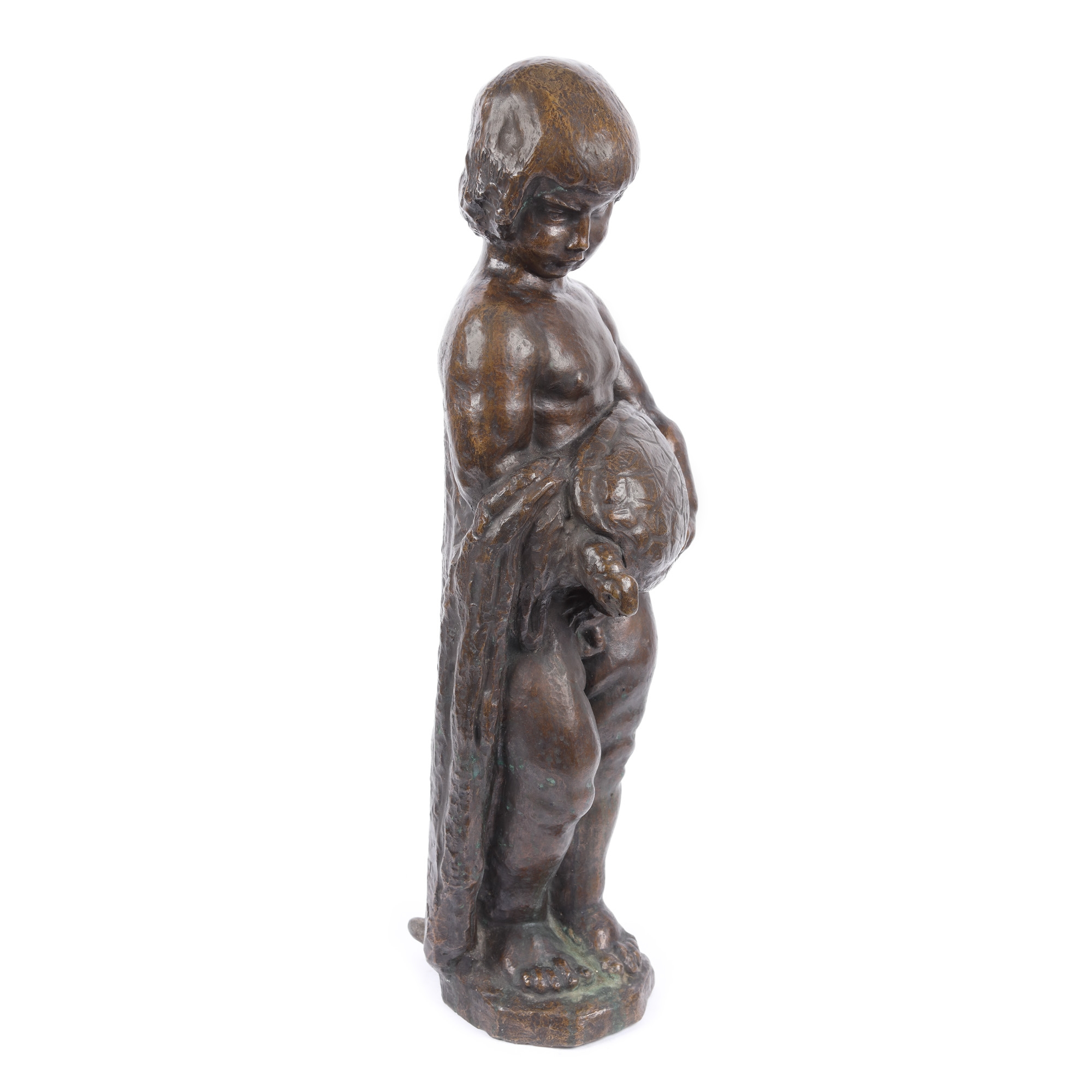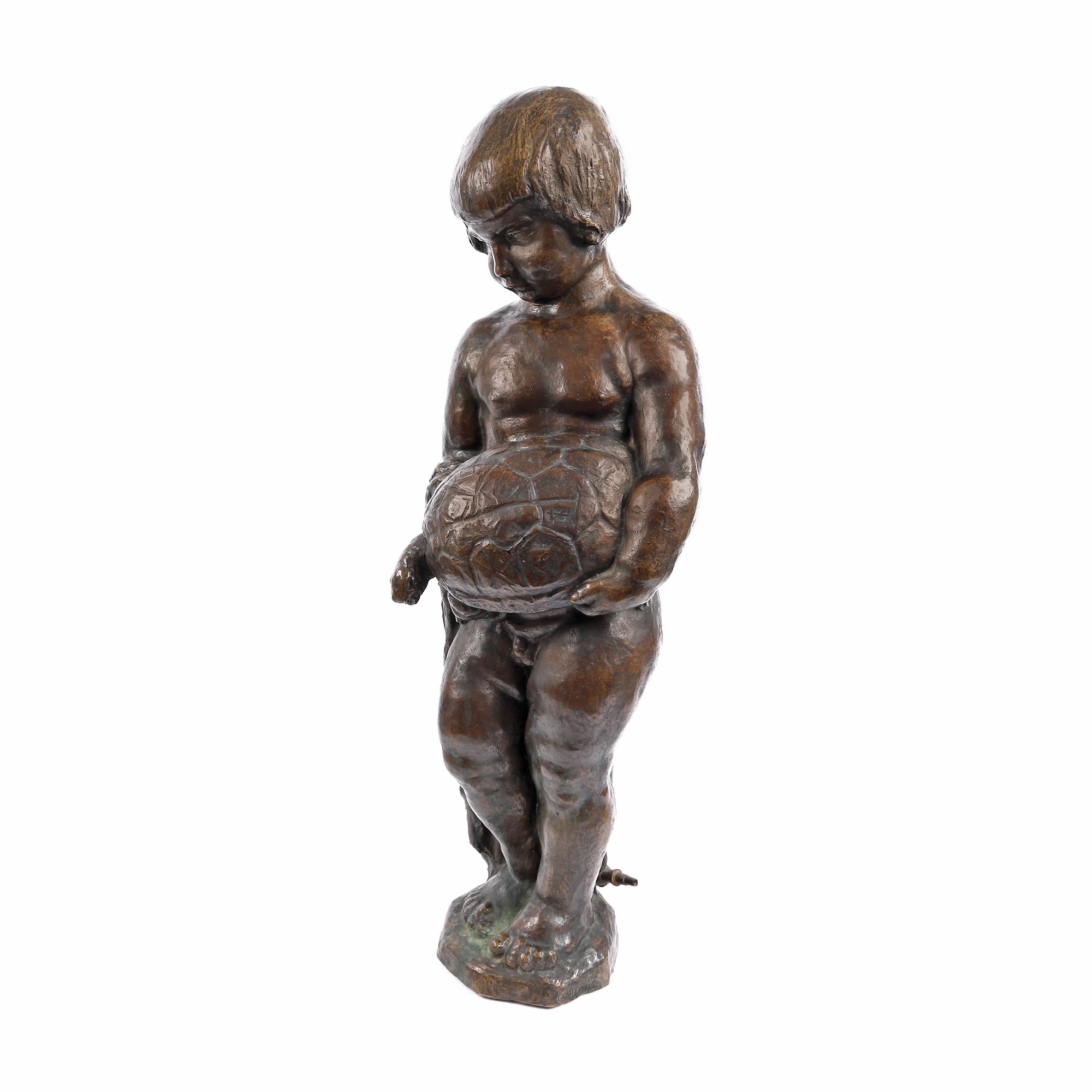 Sculptura a fost realizată în a doua jumătate a anilor `20 ca proiect pentru o fântână, reprezentând un copil dolofan ce ţine în mână o ţestoasă, din gura căreia urma să tâşnească apă (1). Fântâna nu a mai fost probabil executată, însă opera a rămas printre cele mai cunoscute lucrări ale lui Medrea, fiind cuprinsă deseori în paginile studiilor şi albumelor ce i-au fost dedicate artistului. Motivul copilului ce ţine un element marin a pătruns în statuara românească pe filieră franceză, un exemplu celebru fiind opera lui Jean-Baptiste Carpeaux „Pescar cu scoică” din 1857. Acesta este o reinterpretare a formulei antice a personajului în postură ghemuită, aflat în interacţiune cu o scoică sau animal ieşite din mare, influenţat de observaţia directă a unei scene de pe o plajă şi de amintirea unei lucrări asemănătoare de François Rude, „Pêcheur napolitain jouant avec une tortue” din 1829-1833, de la Muzeul Luvru. Băiatul din sculptura lui Rude, un pescar napoletan, apare aşezat, jucându-se curios cu o broască ţestoasă, lucrarea fiind una dintre primele care au încercat să înfăţişeze corpul uman aşa cum apare acesta în faţa ochilor noştri, rupând cu idealul neoclasic. Băiatul cu broască ţestoasă era încă din Baroc un subiect îndrăgit în sculptura de fântâni ce decorau pieţele sau grădinile. Uneori, personajul simboliza zeul râului sau un spirit marin, purtând amulete cu scoici sau plante acvatice sau era reprezentat călărind broasca ţestoasă. Sculptura lui Medrea este inspirată de exemplele artei franceze, cu toate că poziţia personajului este diferită, copilul aflându-se în picioare, în contraposto, ţinând în braţe broasca ţestoasă. Pe braţul drept poartă un drapaj care rezolvă echilibrul compoziţional. Corpul băiatului, cu rotunjimi de putto, este modelat din curbe blânde, volume robuste şi forme sferice, cu un pronunţat simţ al teluricului. Reliefarea generoasă urmăreşte sugerarea sentimentului de plenitudine. S-a observat că viziunea lui Medrea asupra pasticităţii corpului uman îşi are originea în tradiţiile folclorice româneşti şi mai exact în rotunjimea oalelor ţărăneşti (2), în relaţie cu ideea de rodnicie, stabilitate şi eleganţă. Medrea urmărea să imprime în carnaţia personajului pulsaţia vieţii, construind cu gingăşie suprafeţele curbate, convexe, organizându-le într-un ritm domol, fluid. Volumul carapacei ţestoasei comunică cu formele pline ale trupului, această tipologie a personajelor lui Medrea simbolizând fertilitatea şi maturitatea, pornind probabil de la forma pământului, a majorităţii fructelor sau a sânului femeii (3). Aici, rotunjimea accentuată a trupului face referire la delicateţea şi prospeţimea tinereţii, alături de care broasca ţestoasă are semnificaţia de putere şi longevitate. Copilul împrumută din atributele animalului, adoptând o oarecare sobrietate şi răbdare, care nu este specifică celorlalţi băieţi reprezentaţi în sculptură împreună cu broaşte ţestoase, în atitudini ştrengăreşti. Fizionomia liniştită, cu expresia calmă, musculatura fără încordări a corpului dar alcătuind o structură solidă, simplitatea pozei şi a formulării compoziţiei, creează o imagine de o mare forţă expresivă, ce împleteşte masivitatea cu puritatea, forţa cu gingăşia. (1) K. H. Zambaccian, „C. Medrea”, p. 11 (2) Marin Mihalache, „Cornel Medrea”, p. 7 (3) Henry Moore apud Marin Mihalache, „Cornel Medrea”, p. 7.