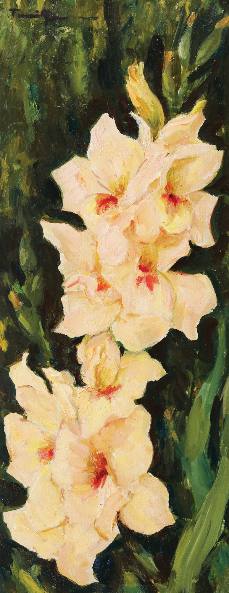 Armonist al formelor traduse prin culoare, pictorul Tonitza va acorda un studiu atent naturii, care i se va dezvălui de fiecare dată interesantă și instructivă. Pentru o înțelegere aprofundată a limbajului picturii artistul va prefera studiul liber al naturii pe timp de vară, atunci când culoarea se revarsă liber și luminos asupra formelor. În mijlocul naturii va întâlni florile, care își vor face apariția în repertoriul artistului începând cu anii ’20. Una din primele expozițiie în care remarcăm florile va fi expoziția comună „N. N. Tonitza – Ștefan Dimitrescu”, din ianuarie- februarie 1920, în cadrul căreia artistul avea să expună zece compoziții cu flori. O prezență fertilă a florilor o observăm și în preajma anilor 1935-1937, perioadă în care, timp de trei veri consecutive pictorul se va afla la Schitul Durău (Neamț), unde va picta în encaustică împreună cu elevii săi de la Academia de Arte Frumoase din Iași. Pe lângă lucrările realizate aici, artistul își va dedica timpul liber și studiului florilor. Rezultatul muncii sale va putea fi admirat în cadrul expozițiilor „Grupului celor patru”, precum și în cadrul expozițiilor personale, unde artistul avea să expună un număr semnificativ de compoziții și panouri cu flori („Trandafiri”, „Petunii”, „Trandafiri ghimpați”, „Gladiole”, „Crini” ș.a.). (G.M.)
