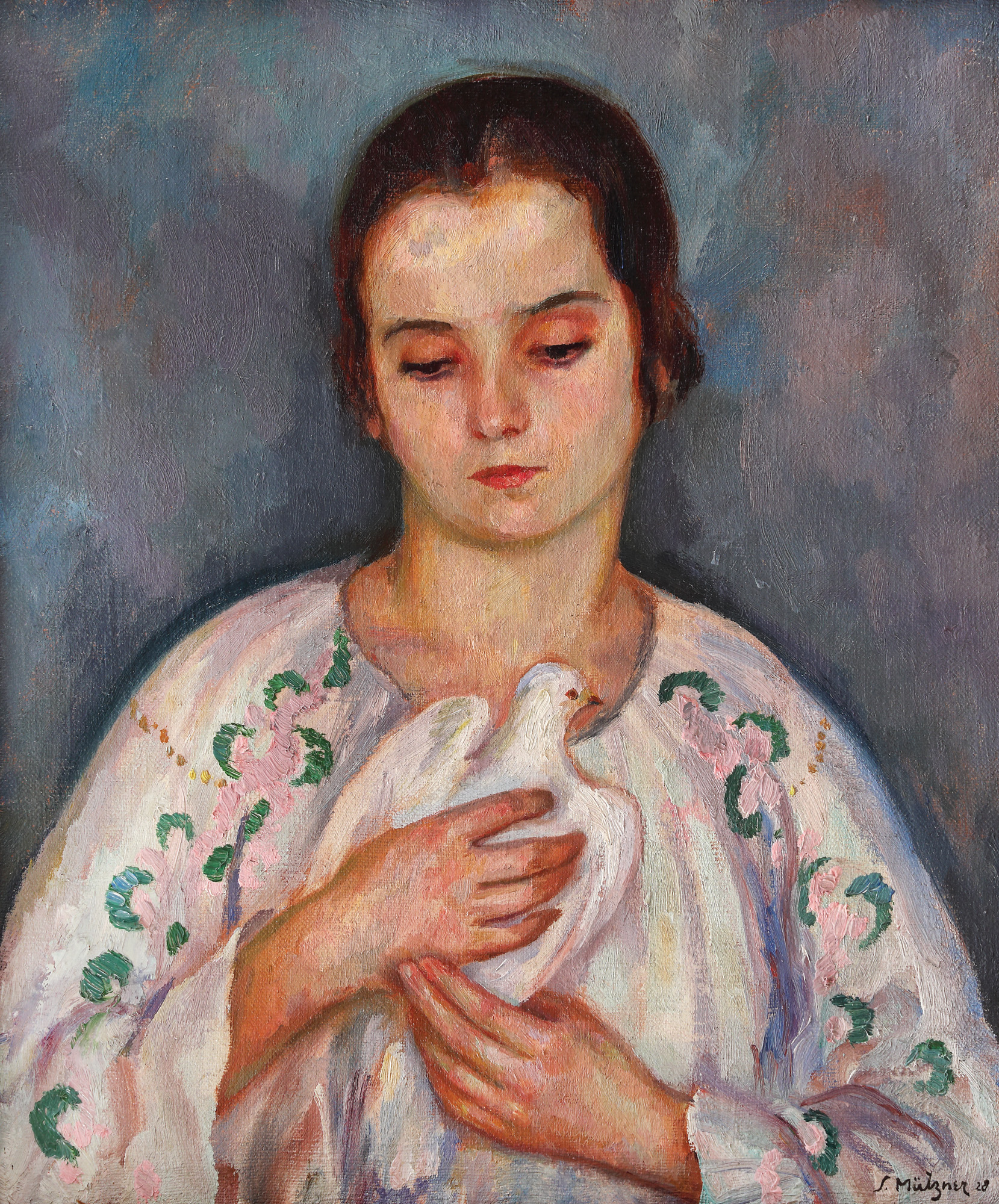Opera este reprodusă în monografia „Samuel Mützner”, Rodica Marian, Ed. Antet, București, 2005, la p. 137, sub titlul „Fata cu porumbelul”.