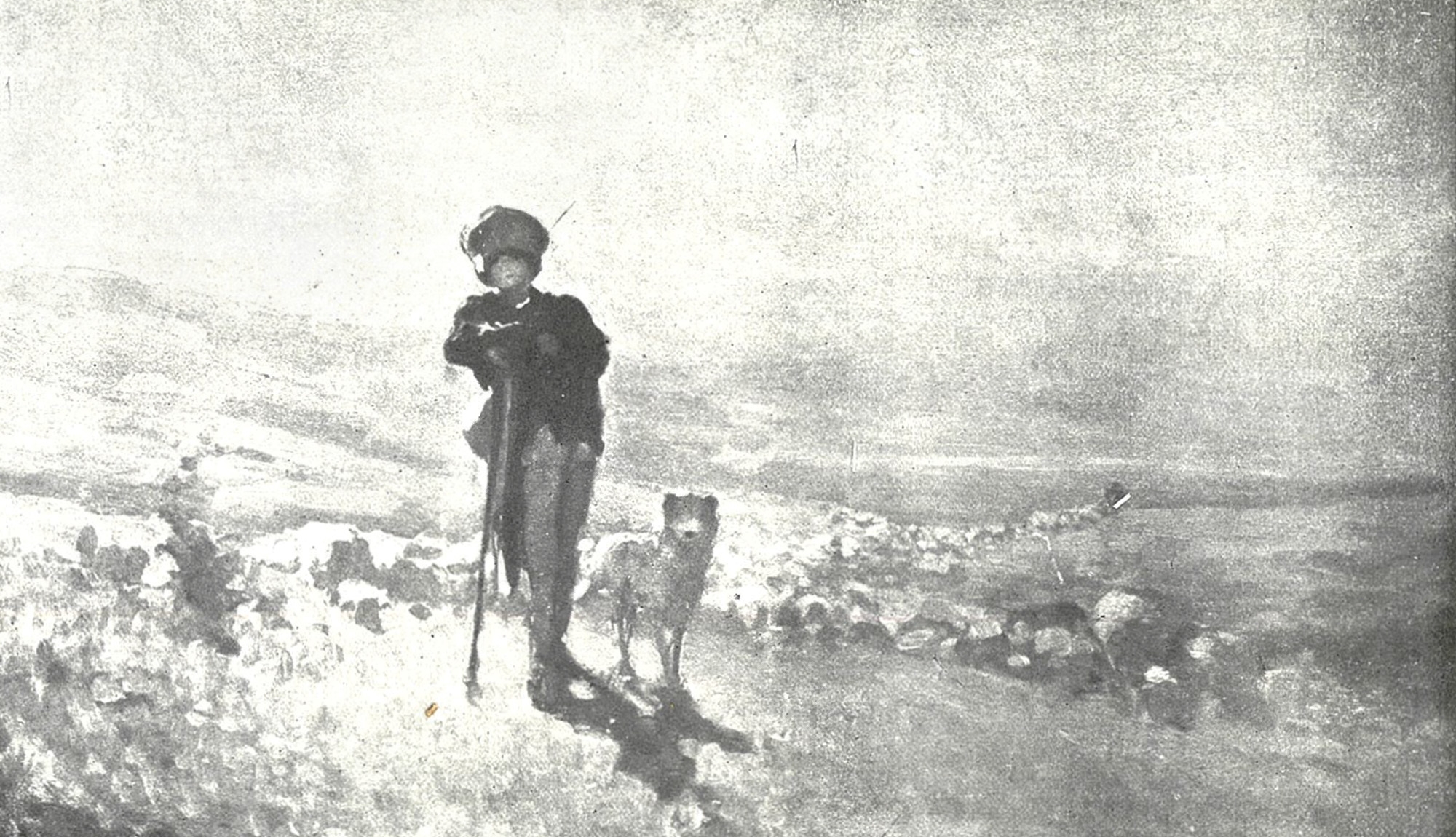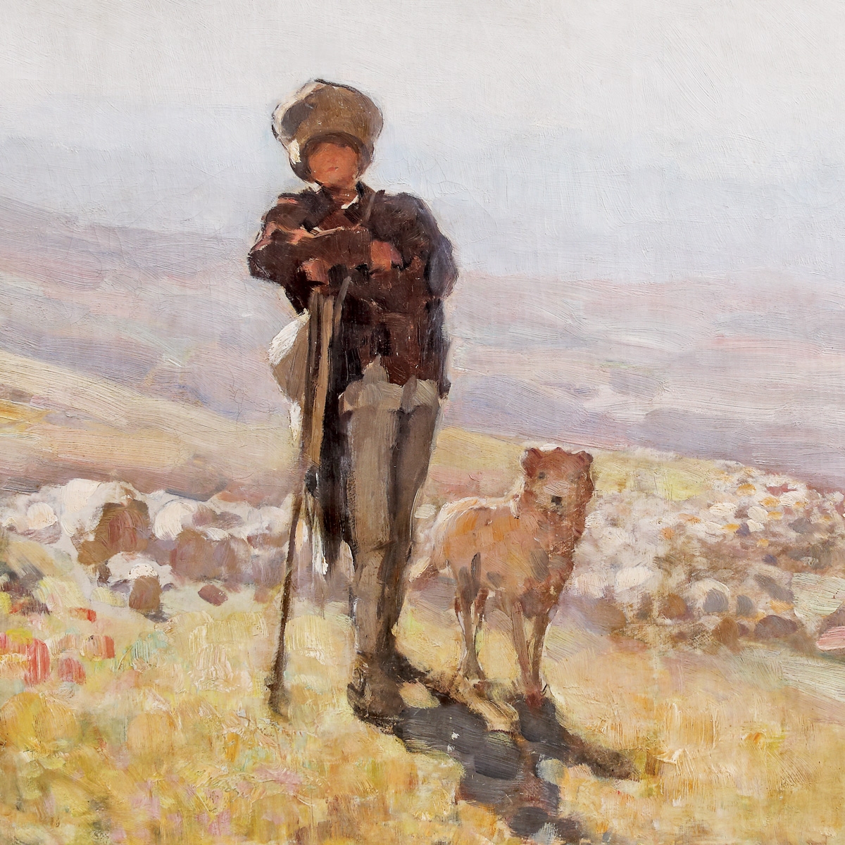 Subiectul acestui tablou, personaj în peisaj, se înscrie în mod evident în universul picturii impresioniste. În acest sens, deși ciobanul ocupă un loc bine semnalat în compoziție (prin verticalitatea siluetei, prin petele de brun ale hainei contrastând cu ambianța), primul protagonist al imaginii este desigur lumina solară estivală, captată în alburi colorate, în nuanțe de gris deschis, în rozuri pale, scăldând ansamblul în tonalități de surdină. În fundal, pierduți într-un abur de alburi se pot bănui, munții. Artistul nu ne furnizează anul execuției, dar lucrarea este databilă prin specificitatea ei în perioada albă și probabil realizată către 1896-1906. Prin subiect și prin tratare picturală, face parte din suita de variațiuni pe aceeași temă a ciobanului tânăr în peisaj pe care Grigorescu o introduce în pictura noastră (devine subiect național prin excelență), pe care o cultivă și o explorează în numeroase ipostaze, cu precădere în formate verticale de pânză (Ciobănaș pe Valea Prahovei, Coborând cu turma, v. G.Oprescu [-R.Niculescu], 1962,vol.II, p. 230-231 etc.). Ipostaza de față se individualizează prin dimensiunile generoase, prin orizontalitatea compoziției ce acordă un loc privilegiat peisajului de coline ritmat discret de elementele animaliere, ca și prin asimetria plasării axei personajului. Elementele constitutive ale compoziției, vocabularul tematic și plastic utilizat de artist sunt cele însușite în anii de formație de la Barbizon și Marlotte (1863-1869) și apoi în continuare din numeroasele sale întâlniri cu pictura impresionistă afirmată odată cu sfârșitul aceluiași deceniu (chiar dacă ante 1874 nu era încă denumită noua mișcare). Prezența preferențială a universului rural în opera lui Grigorescu este în mod evident o preluare ce i s-a potrivit, din școala realismului de la Barbizon, dar construcția modernă, rezumativă, gestuală a formelor, prin câteva vârfuri de pensulă și cultul luminii de plein air reprezintă opțiunea sa pentru viziunea novatoare a impresioniștilor, colegii săi de generație și de formare de la Ecole des Beaux-Arts. Am putea afirma că pictura de alburi este, către 1890-1900, replica personală a lui Grigorescu la problema luminii de plein air, adusă în față de impresionism. Se poate presupune că modelul care i-a pozat lui Grigorescu pentru acest tablou este Maria Danciu în travesti. Ea a fost modelul preferat al artistului începând din anii 1880, cea care l-a însoțit în această parte a vieții. Silueta gracilă, trasăturile delicate ale chipului (chiar dacă doar sugerate) pe care le întânim în multe figuri de ciobani tineri pictați de Grigorescu, ne determină să presupunem acest lucru, bazându-ne și pe relatarea doctorului Istrati, prieten apropiat al artistului. Intitulată „Pe Bucegi”, lucrarea făcea parte la 1910 din colecția reginei Elisabeta a României, după cum aflăm din prețiosul catalog inclus monografiei publicate de A. Vlahuță. Aprecierea operei grigoresciene de catre regina Elisabeta a fost semnalată de către Gabriel Badea-Păun în cartea sa dedicată reginei poete Carmen Sylva, dar un studiu privind colecția de Grigorești a familiei regale (colecție începută în jur de 1870), nu a fost încă alcătuit. În eseul monografic publicat în 1930, criticul N. Petrașcu comentează lucrarea de față al cărui titlu îl preia după Vlahuță, dar nu menționează în lista lucrărilor, posesorul. Reprodusă în volumul II al monografiei de G. Oprescu [-R. Niculescu], 1962, pictura purtând de astă dată titlul „Ciobănaș în munții Bucegi” era catalogată ca aparținând Muzeului de artă al RPR (fără precizarea numărului de inventar). După toate probabilitățile ea nu a figurat în cadrul acestui patrimoniu, respectiva informație privind deținătorul prezentei picturi, va fi fost, credem, o formulă adoptată la acel moment, fie pentru a se evita referirea la colecția regală, fie necunoscându-se localizarea picturii după abdicarea regelui Mihai la 30 decembrie 1947. Se poate remarca aceeași situație și în cazul altor lucrări de Grigorescu reproduse în monografia Vlahuță ca aparținând colecției regale, catalogate în volumul din 1962 ca existând în Muzeul de artă al RPR. (I.B.)
