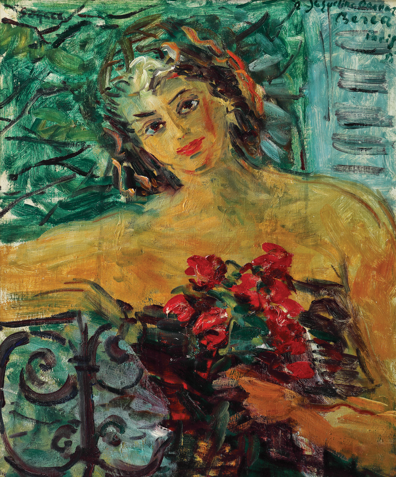 semnat, datat, localizat şi dedicat dreapta sus, cu verde, "Berea, (19)51, Paris, a Jacqueline Damar"