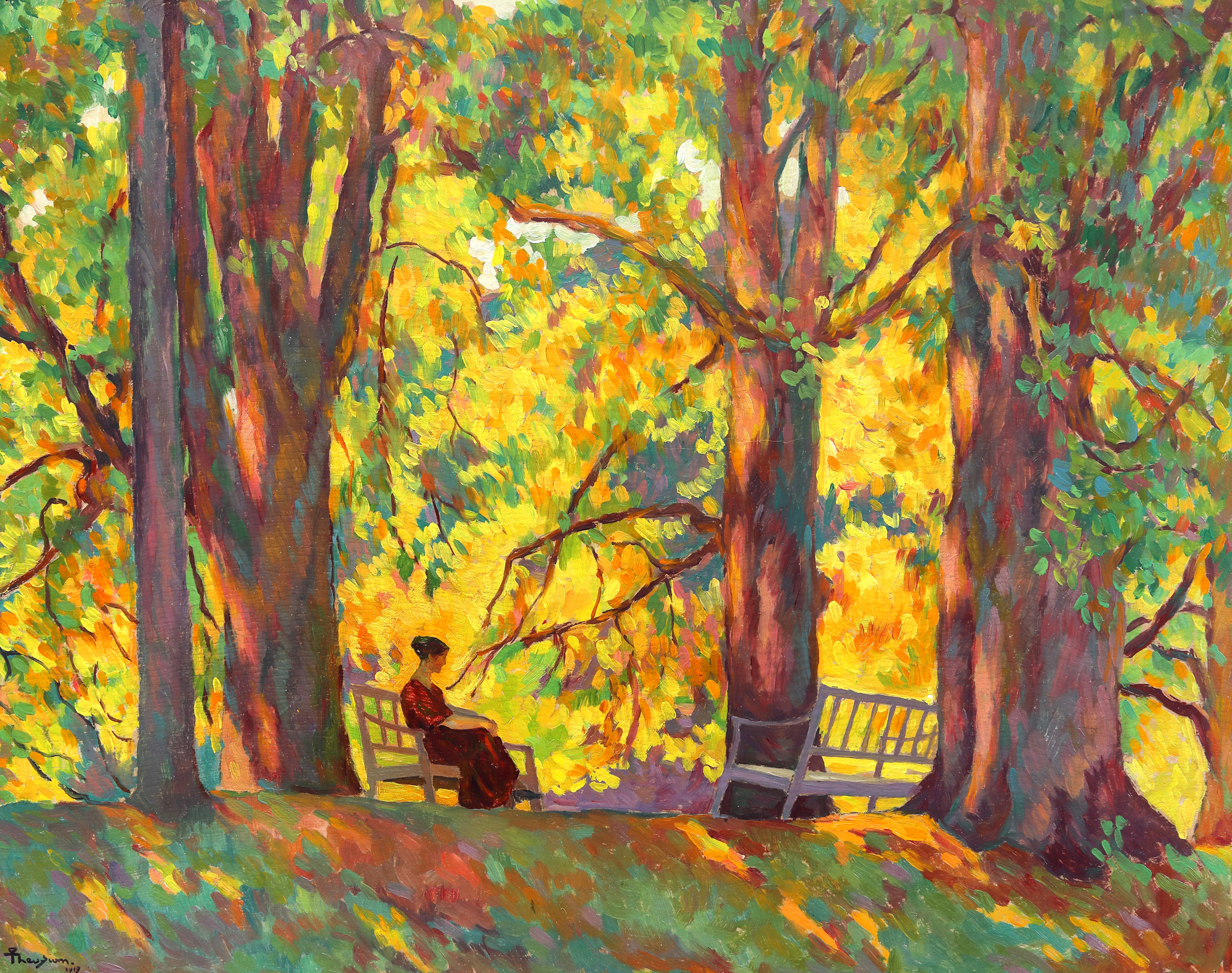 “Femeie în parc” ne introduce într-un ciclu restrâns al operei lui Theodorescu-Sion, modelat de acesta în perioada 1919-1920, moment în care tehnica și maniera de pictură simt o anumită atracție față de peisajul de inspirație simbolistă. Această apropiere de simbolism este certificată și prin manifestările artistice la care ia parte Sion în epocă, având în 1920 expoziții alături de Kimon Loghi, Alexandru Satmary sau Pan Ioanid, recunoscuți pentru apetența lor la o interpretare simbolică a figurativului. În cazul pictorului nostru, peisajul se apropie de aceste valențe estetice în principal din cauza unei reconsiderări a tehnicii de pictare, întorcându-se la o manieră cvasi-pointilistă, pe care nu o mai practicase încă de la începutul deceniului doi al secolului XX. În plus, regăsim în această perioadă compoziții în care pictorul nostru este interesat de efecte și armonii, dar și de reacția paletei într-un regim cromatic luminos. Opera noastră, alături de alte studii de reflex și acord de complementare (vezi “În livada de nuci”, cat. 55., pag. 78 în Catalogul Expoziției “Ion Theodorescu-Sion”, Doina Schobel, Hariton Clonaru, Hariton Clonaru; “În grădină”, cat. 58, pag. 80, în același catalog), se integrează lesne repertoriului simbolist tocmai prin folosirea temei femeii în grădină, chiar dacă peisajul are întâietate și ne introduce într-o manieră plein-air-istă.