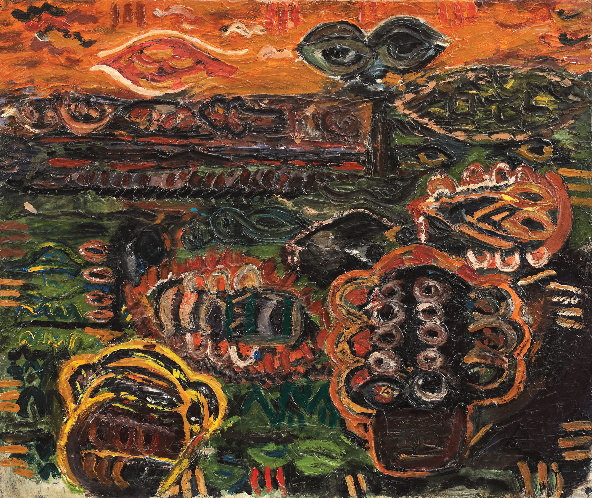 Gânditor modern al anilor postbelici și luându-și drept repere folclorul străvechi și stilistica artei populare românești, Ion Țuculescu devenea începând cu anii ’30 un participant la marile mișcări ale creației plastice universale. Pe lângă primitiv, care îl atrage, artistul va acorda o mare atenție realului, luându-l drept reper și surprinzându-l în spațiul său vizual imediat, spațiul ulterior fiind ocupat de etosul popular, creând astfel o nouă realitate, simplificată și îndreptată spre un mister cosmic mărturisit. Își va dedica prima sa etapă creativă artei populare românești, care îl va ademeni prin modernitatea pe care aceasta o propunea, prin procedeele specifice de geometrizare și prin coloritul de o impresionantă decorativitate și vitalitate. A doua perioadă creativă va fi dedicată perioadei narativ-pitorești, în cadrul căreia își vor face apariția elemente magice precum fluturii, păpușile, totemul sau triunghiul, precum și alte obiecte de natură folclorică, ca frunza, floarea, pasărea sau ulciorul. Ultima perioadă de creație, dedicată semnelor și simbolurilor, se va remarca puternic începând cu mijlocul anilor '50. Această ultimă perioadă, considerată cea mai efervescentă din punct de vedere creativ se va caracteriza printr-o manieră abstractizată, un colorit puternic, precum și printr-o ritmică tot mai vitală a formelor și conturelor. Pe lângă portrete, naturi statice sau interioare, un loc aparte în creația sa îl va ocupa și peisajul. Un aspect aparte al acestui gen va fi cel al dominantelor cromatice, simplificate ca structură în tonuri primare și secundare, avalașa cromatică a artistului Țuculescu distrugând astfel tiparele realismului și ale experimentelor post-impresioniste. (G.M.)