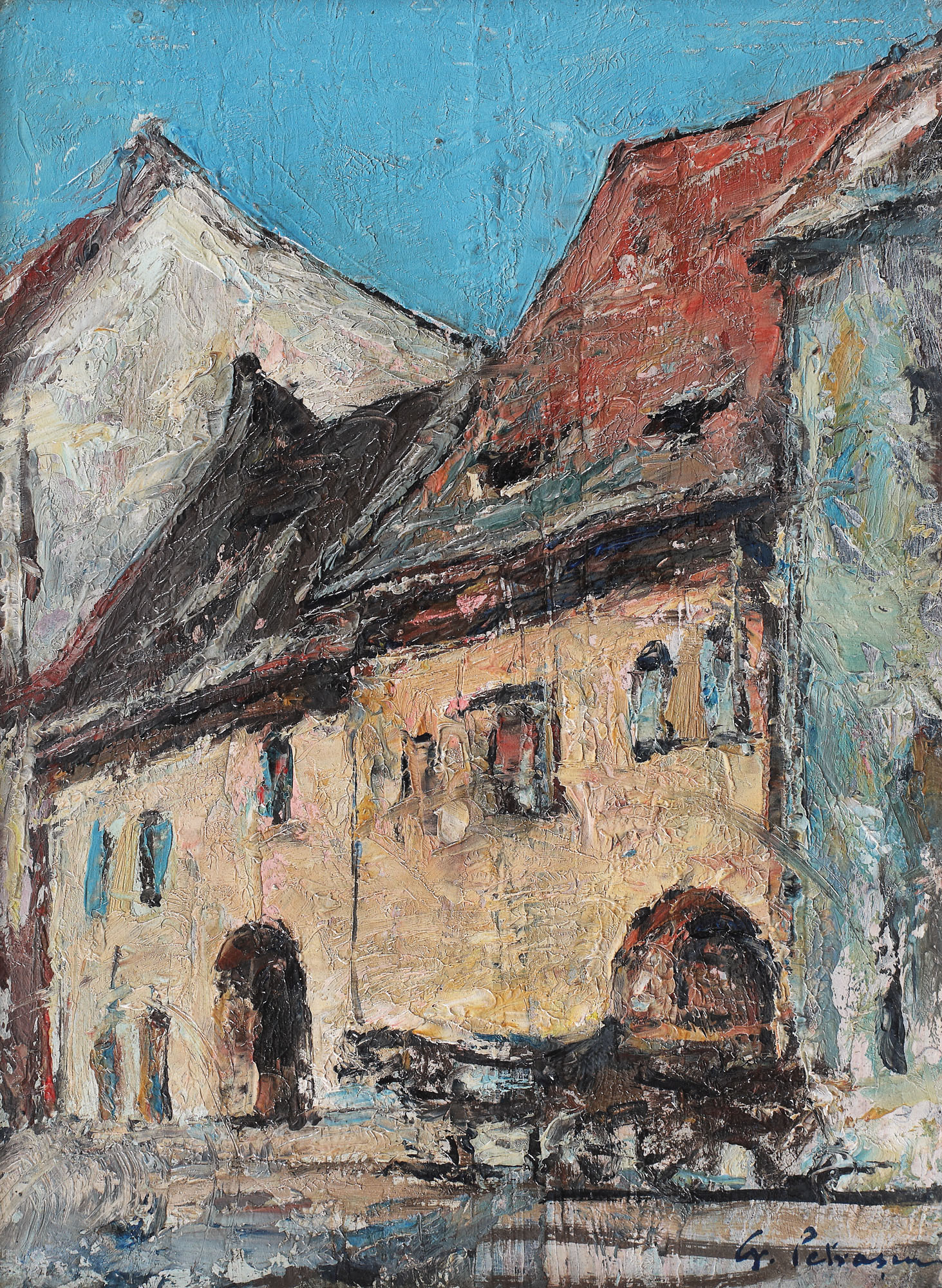 Concentrându-și creația pe un registru tematic restrâns, artistul Gheorghe Petrașcu realizează o artă a concretului, ce irumpe din realitatea mediului cotidian, din contactul cu cei din jur sau din locurile pe care le vizitează. Va acorda încă de la început o mare atenție peisajului, realizând călătorii la Vitré, Veneția, Toledo, unde va lua contact cu arhitecturi pline de efervescență culturală. De asemenea și în țară va realiza dese călătorii la Viforâta, Târgoviște, Sibiu sau Sighișoara, unde va fi impresionat de cromatica bogat colorată a construcțiilor. În preajma Sighișoarei va realiza opere precum: „Hanul Covaci din Sighișoara” (1922), „Case din Sighișoara” (1922), „Sighișoara” (1922) ș.a. (G.M.)
