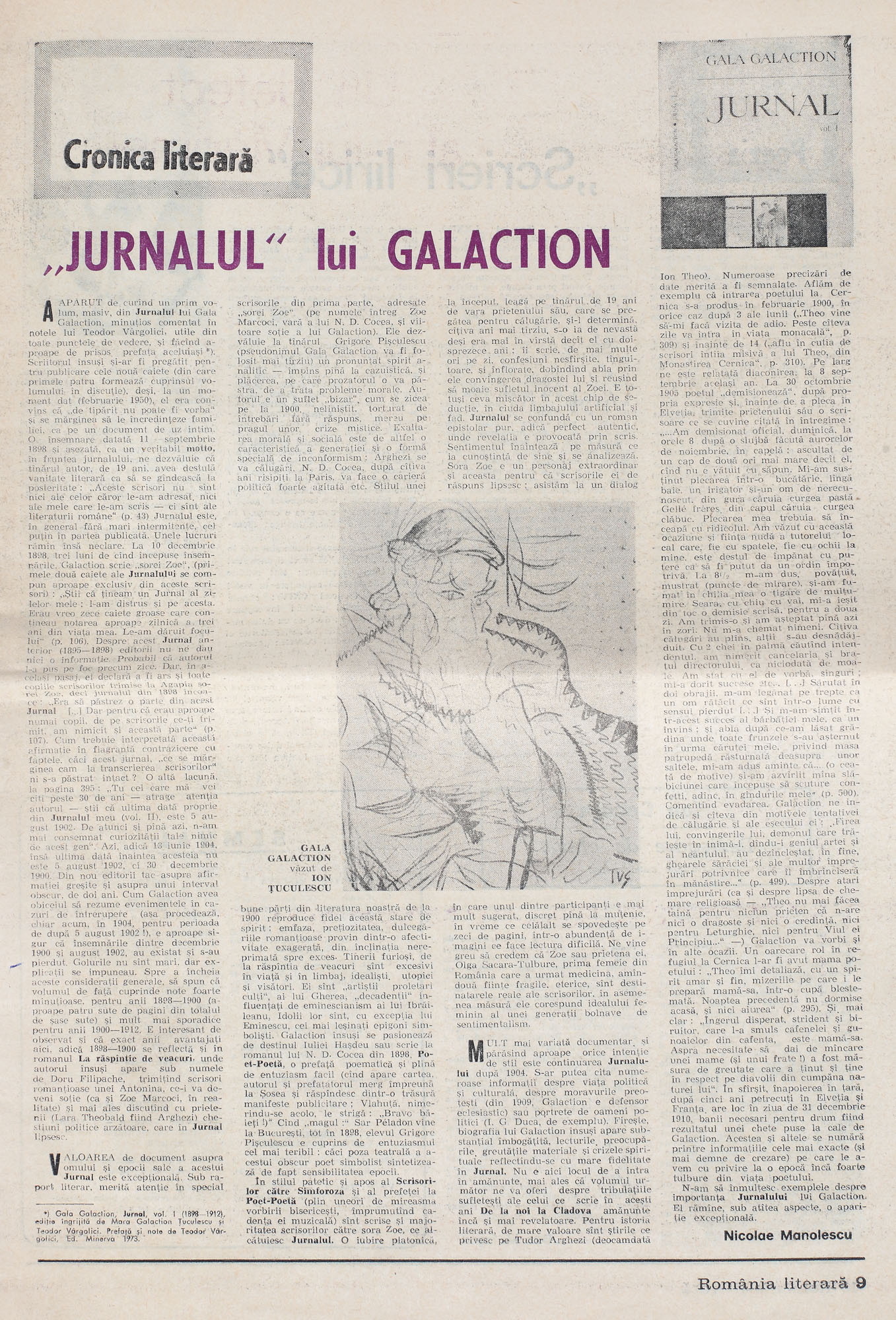 Opera ilustrează articolul "Jurnalul lui Galaction", Nicolae Manolescu, din ziarul România Literară, 26 iulie 1973.