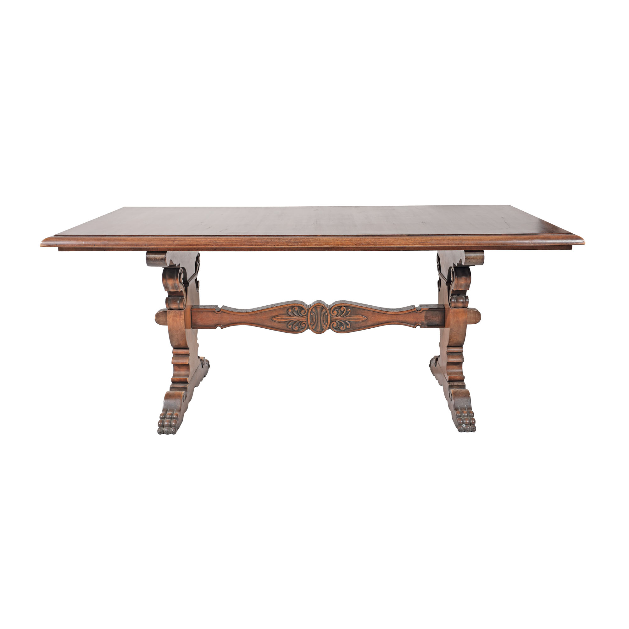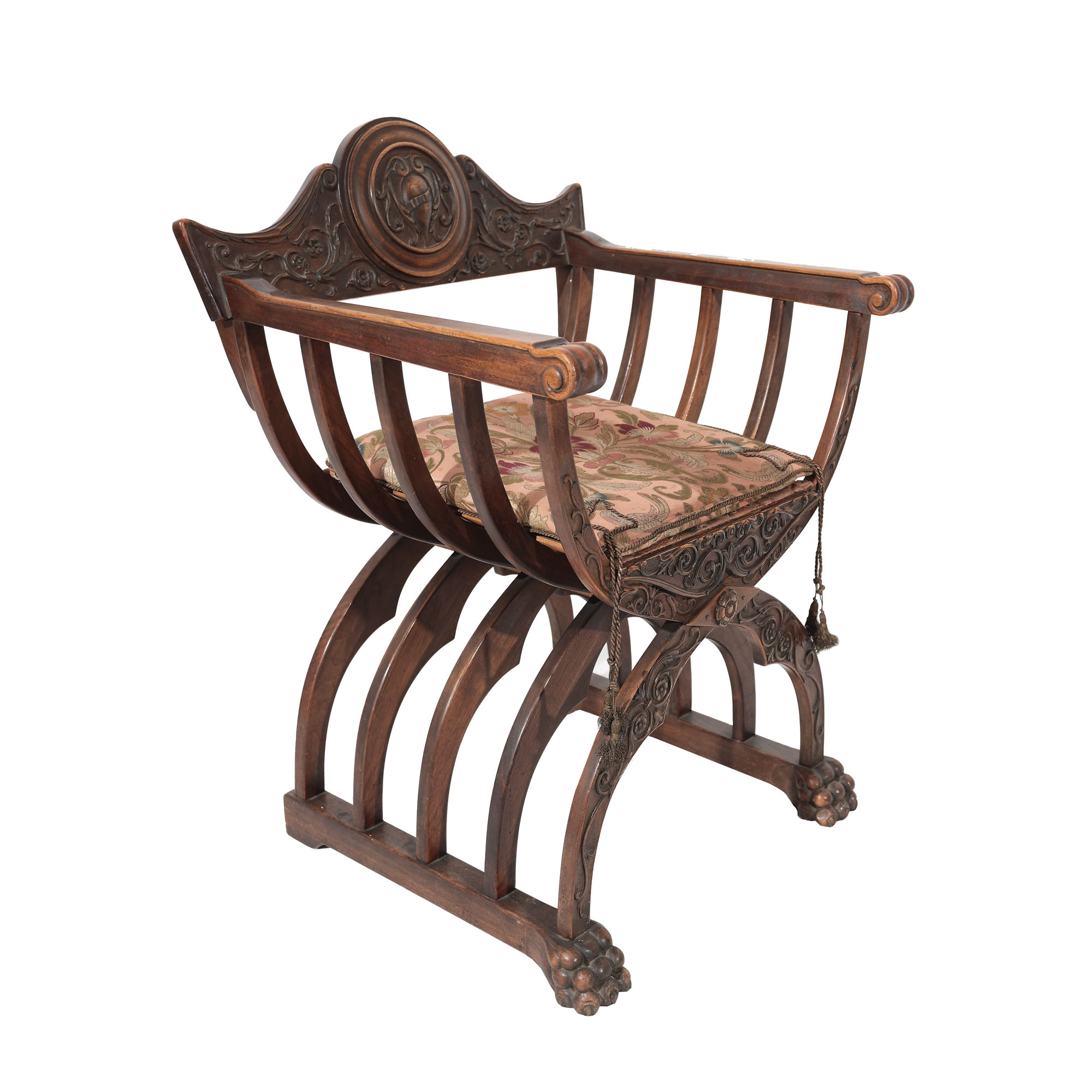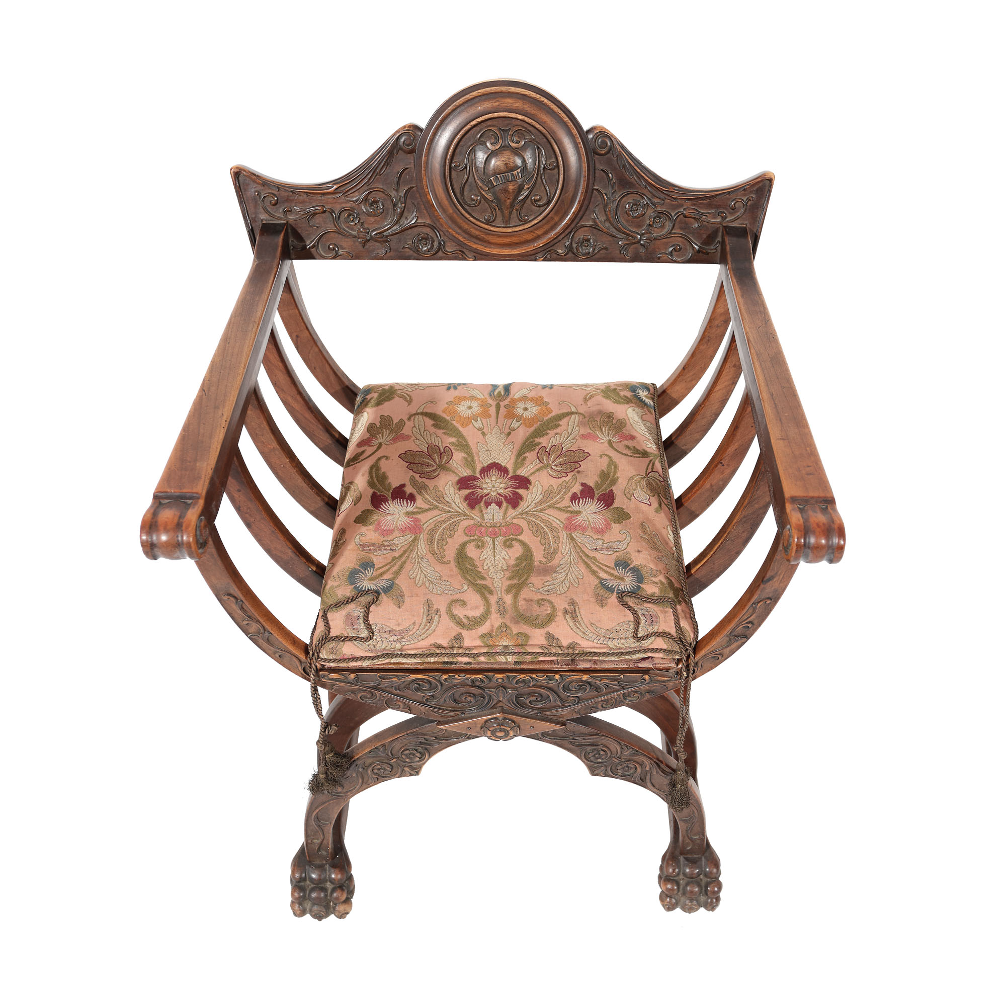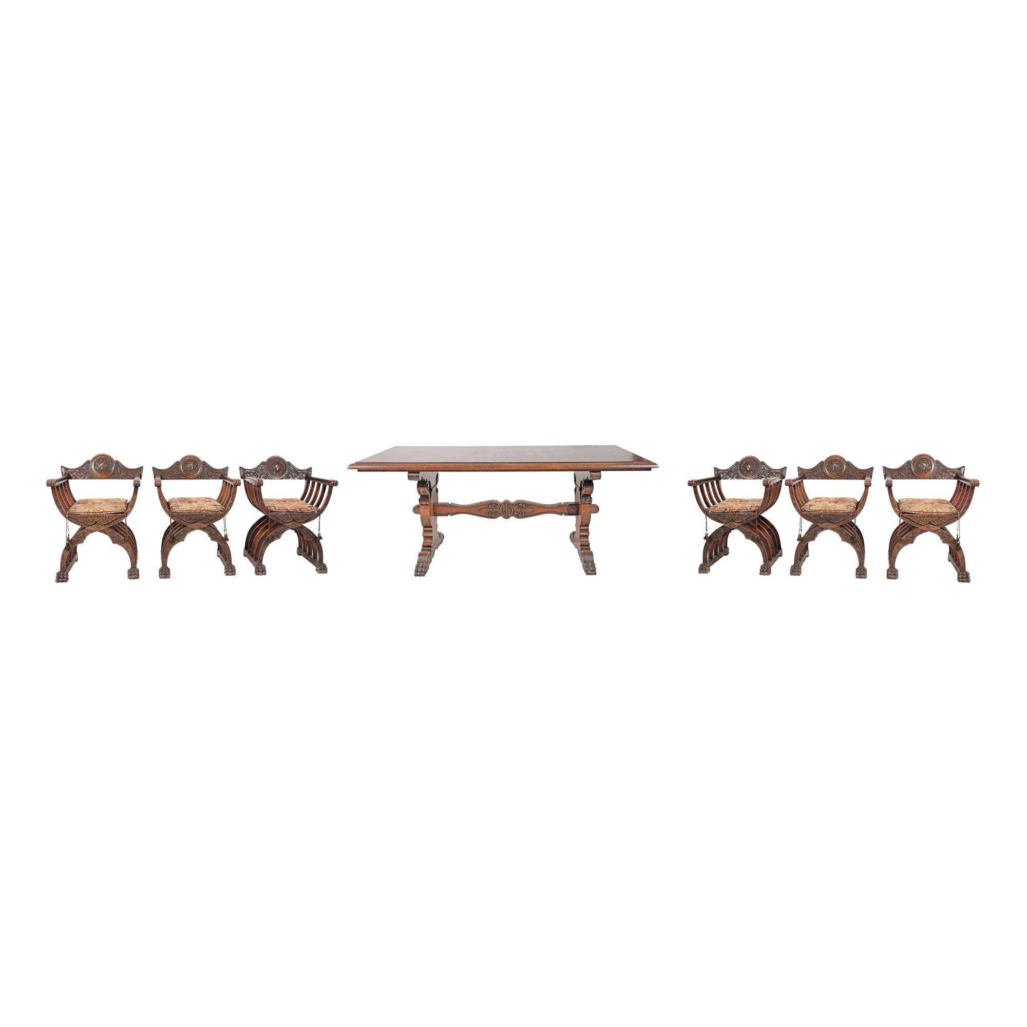 129. Garnitură Neo-Renascentistă formată din masă și 6 scaune, manieră Dantesca, sfârșitul sec. XIX, provine din colecția istorică Șerban Țuculescu-Maria Galaction