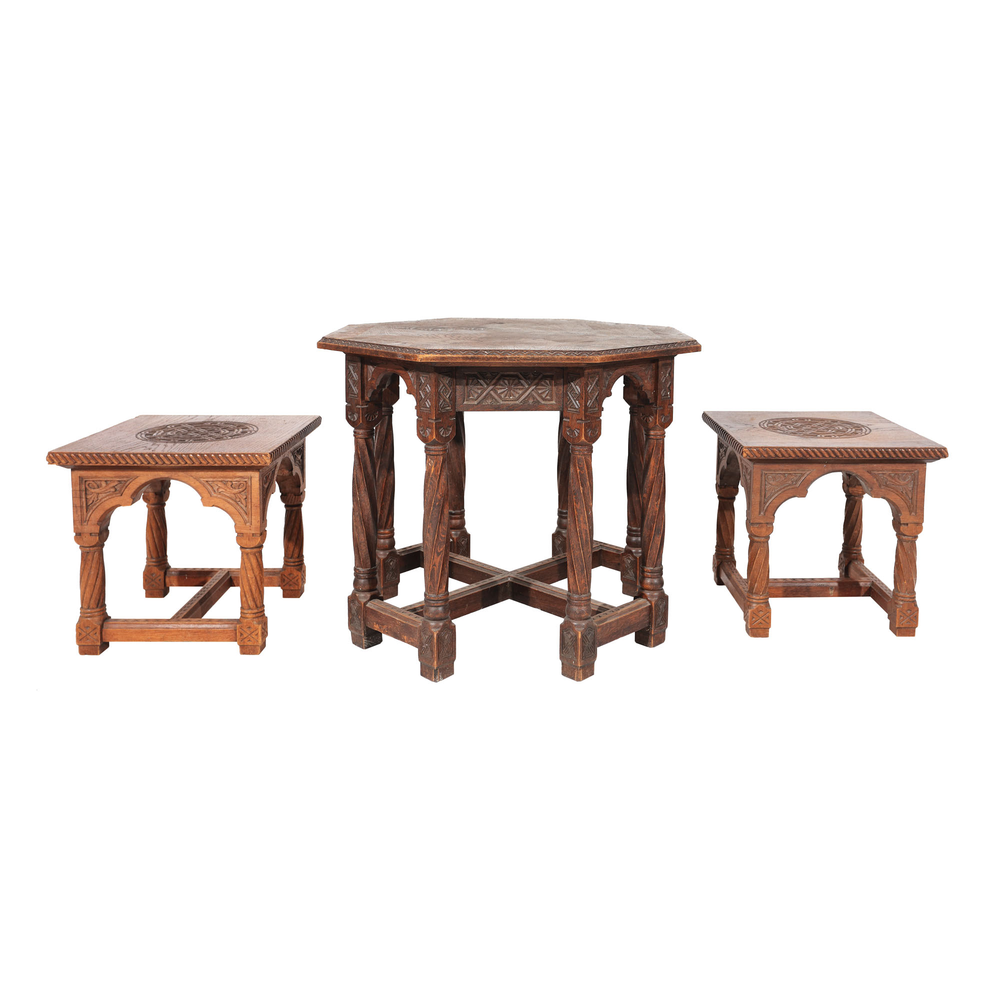 120. Garnitură Neo-Românească, compusă din masă și două scaune, posibil Atelierele Școlii de la Sinaia (designer Regina Maria), provine din colecția istorică Șerban Țuculescu-Maria Galaction