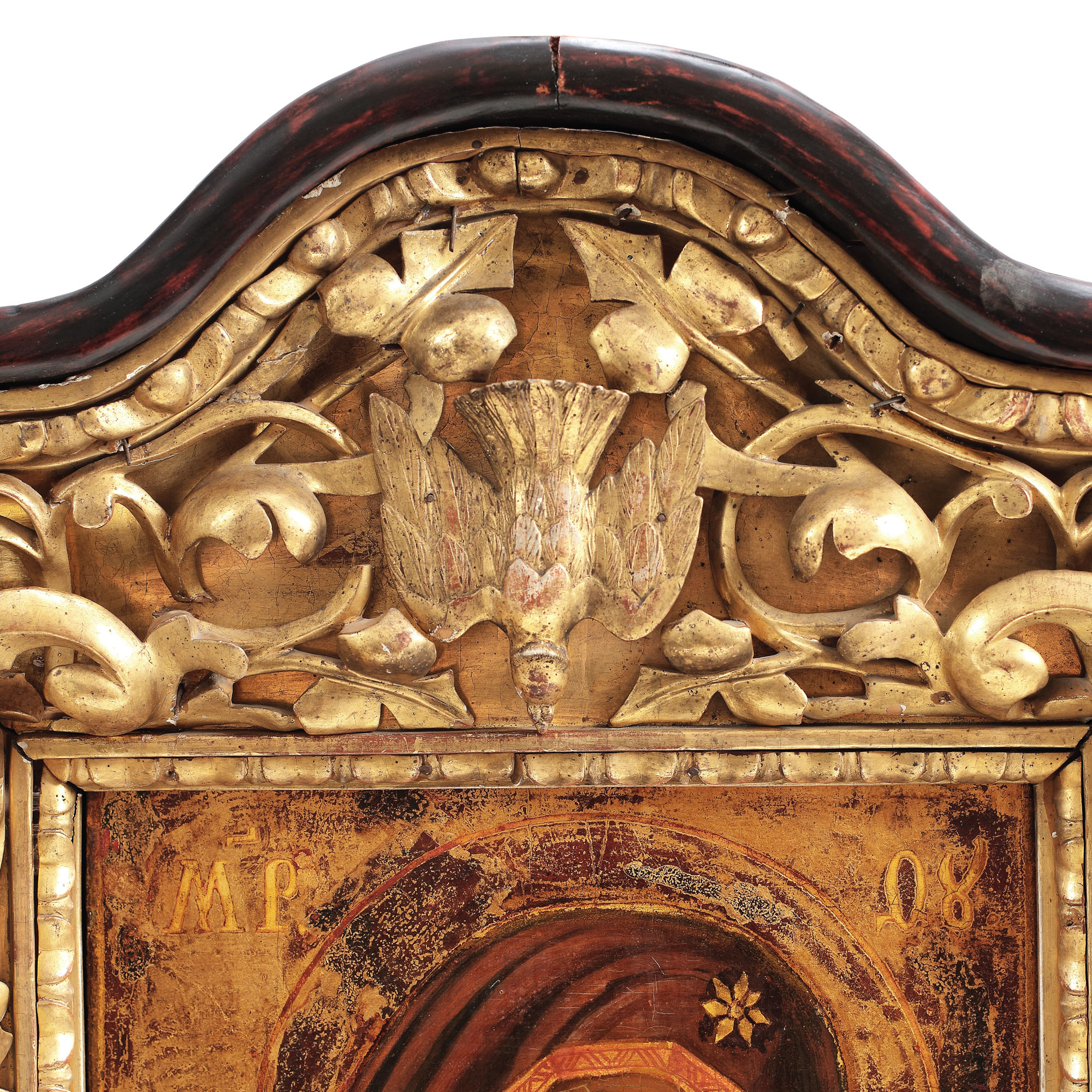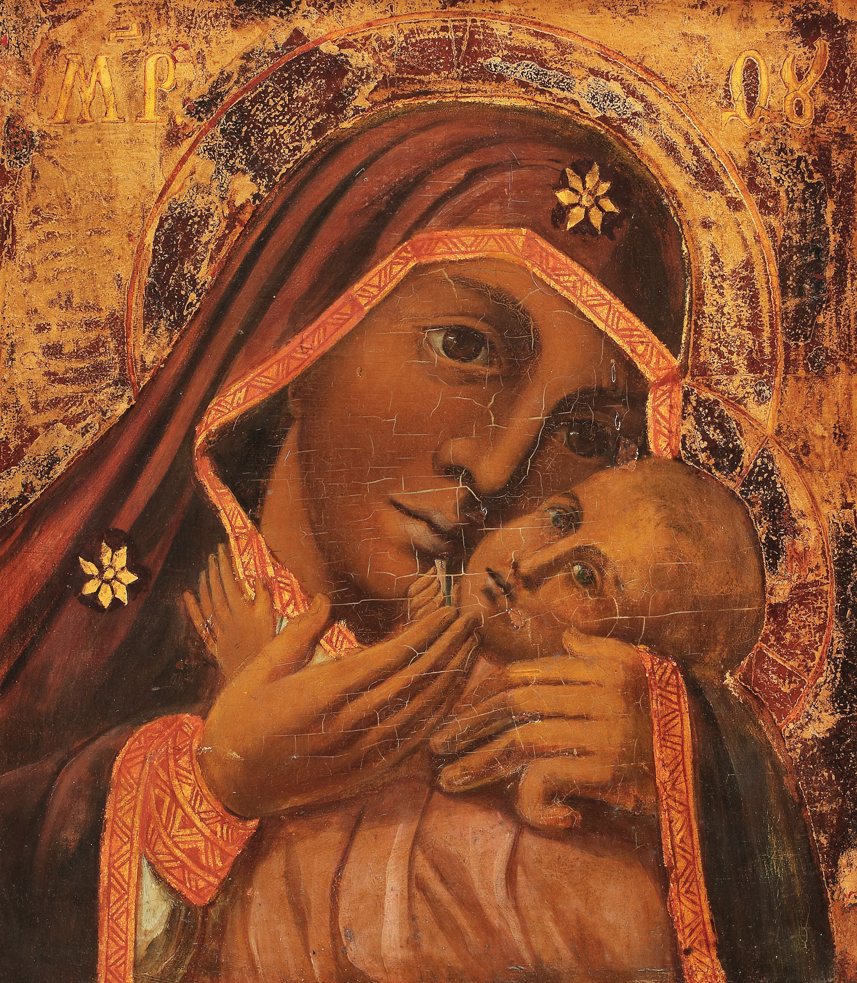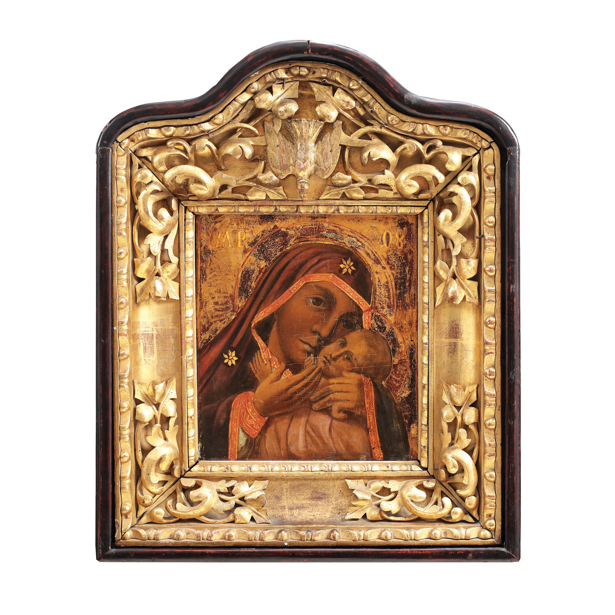 117. Icoană pe lemn, "Maica Domnului cu Pruncul (Glikofilusa)", școală românească, începutul sec. XX, provine din colecția istorică Șerban Țuculescu-Maria Galaction