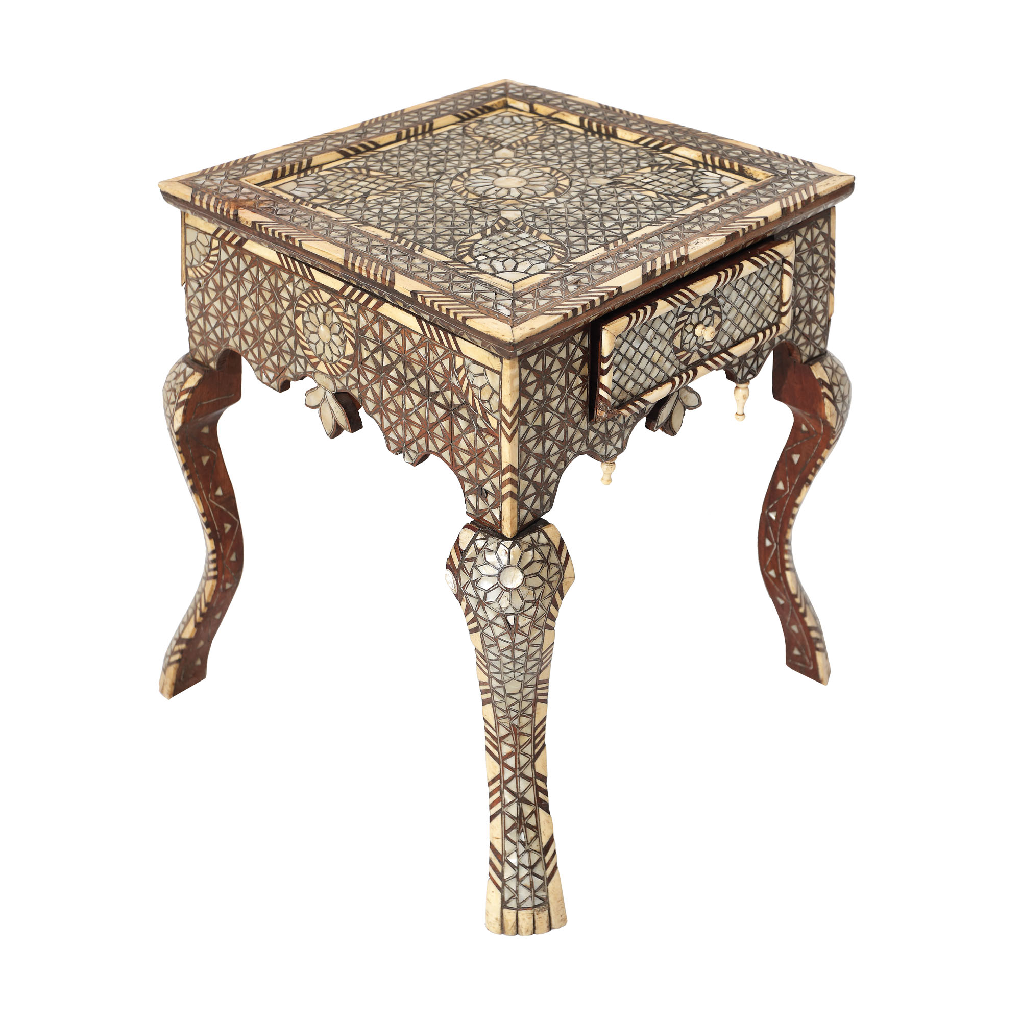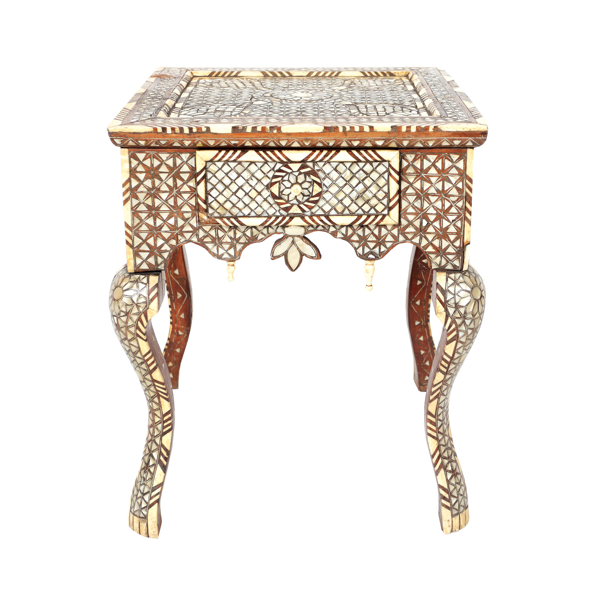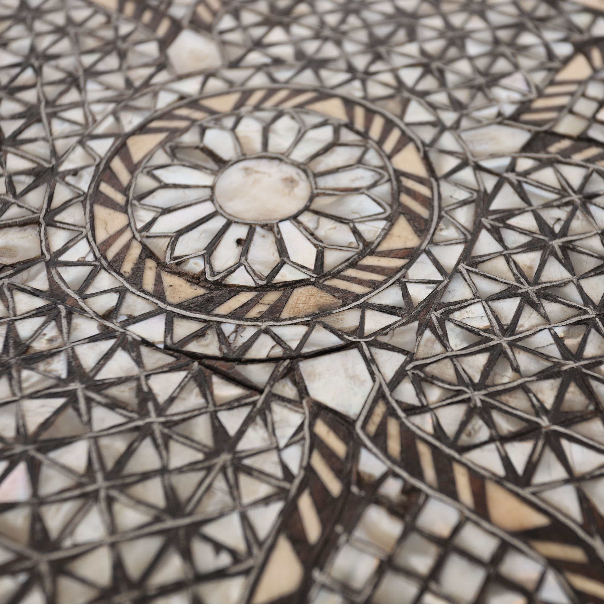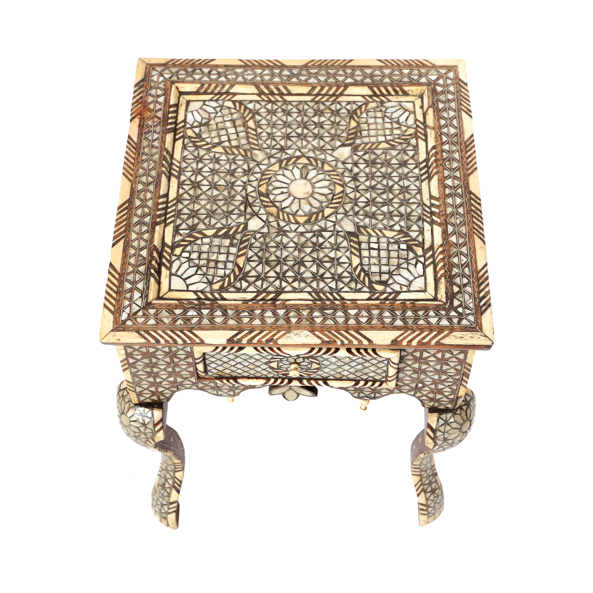 130. Măsuță pentru cafea, manieră orientală, decorată cu intarsii din sidef, cca. 1910, provine din colecția istorică Șerban Țuculescu-Maria Galaction