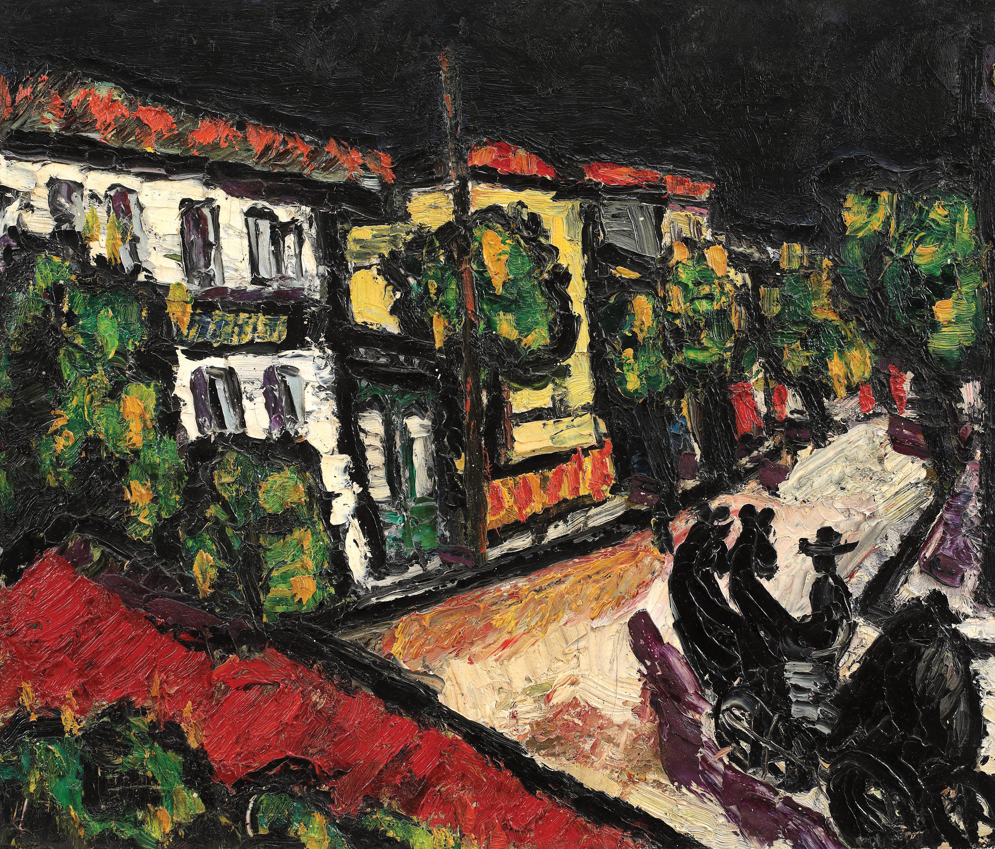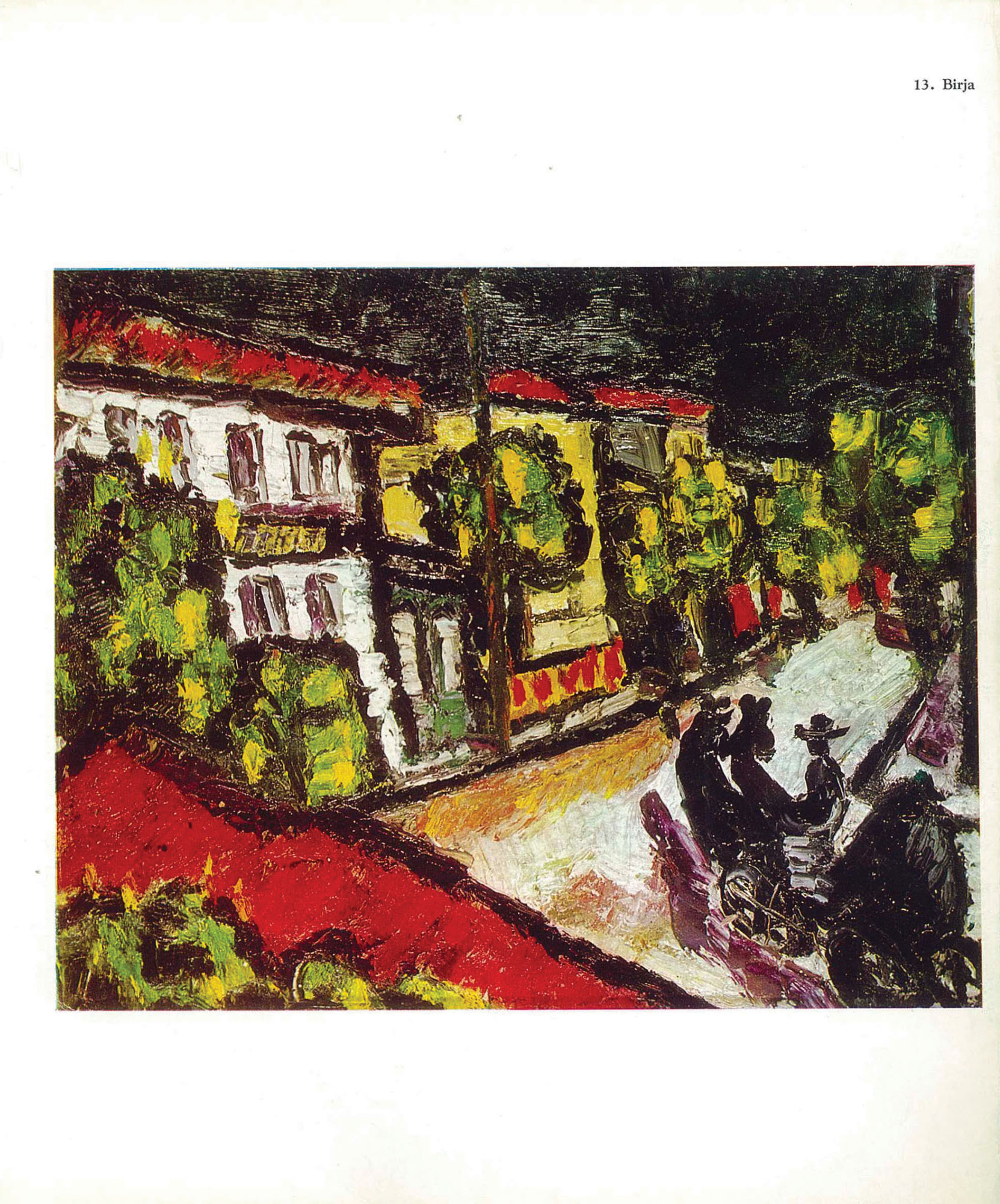 Reafirmându-se ca artist spre sfârșitul anilor ’30, perioadă în care arta românească părea să stagneze, artistul Ion Țuculescu aducea cu sine un nou spirit, determinând prin arta sa transfiguratoare noi deschideri de drum. Gânditor modern, Ion Țuculescu avea să devină prin opera sa un participant la marile mișcări ale creației plastice universale, luându-și drept repere primitivul și realul, pe care le va integra și formula în noi ordini și apariții. Primitivul, care îl atrage își găsește rezonanțele în istoria popoarelor, artistul fiind un foarte bun cunoscător al artelor vechi, al artelor romane, grecești, egiptene și indiene. În ceea ce privește realul, artistul îi va acorda o mare atenție, surprinzându-l în spațiul său vizual imediat. Arta populară românească, spre care se va îndrepta în prima sa perioadă creativă, îl va atrage pe Țuculescu prin modernitatea pe care aceasta o propunea, precum și prin procedeele specifice de geometrizare și intensificările coloritului. În preajma acestei artei, cromatica sa va arăta la începuturi subtilă, cu certe tinderi către sever, urmând ca mai târziu viziunile sale asupra lumii înconjurătoare să fie străbătute de sumbru și de stridențe, exprimate de artist printr-un colorit aspru, către violent, cu exaltări ale tonalităților. Îl va mișca în demersul său de asemeni fovismul, curent etalat în Franța secolului XX și caracterizat prin utilizarea culorii pure, precum și expresionismul, exprimat de artistul Țuculescu printr-o paletă crudă și printr-o forță intensă a instinctului primitiv. În urma primei sale apariții expoziționale de la Ateneu, din anul 1938, artistul va înfățișa un temperament impetuos, viguros, dovedind trăsături impresionante de colorist, apariția sa reprezentând una dintre cele mai senzaționale manifestări artistice ale ultimilor ani, rememorată de criticii și de publicul de artă. Începând cu anul 1942, anul unei noi expoziții personale, se remarcă în creația sa o prezență tot mai accentuată a negrului, care va căpăta pe parcurs însușiri substanțiale. În acest mod, negrul nu va mai îndeplini doar funcția de fond sau de fundal, ci va străbate viziunile sale artistice, apropiindu-l de tainic și de fantastic. Culorile nu vor mai emana lumina, ci o vor primi atât cât negrul le va îngădui, dispus în mari suprafețe sau conturând formele. O nouă revenire asupra negrului o va manifesta și cu ocazia expoziției din decembrie 1943, în cadrul căreia se remarcă o paletă puternic contrastantă de culori întunecate și luminoase, creând o atmosferă impresionantă de expresie. Menționăm din acești ani lucrări ca: „Noaptea salcâmilor”, „Peisaj nocturn”, precum și „Birja”, reprezentative prin ambianța fantastică, nocturnă, precum și prin rezumarea sintetică și măreață a realității. Elaborate în jurul unei etici intime, cu elemente preluate din jurul vieții înconjurătoare, operele zugrăvesc registre imagistice restrînse, populate cu fragmente din natură, animale, sau figuri, alături de o paletă vie, spirituală, ce amintește în continuare de elementul tradițional, invitând privitorul la o lectură de ordin fantastic. (G.M.)