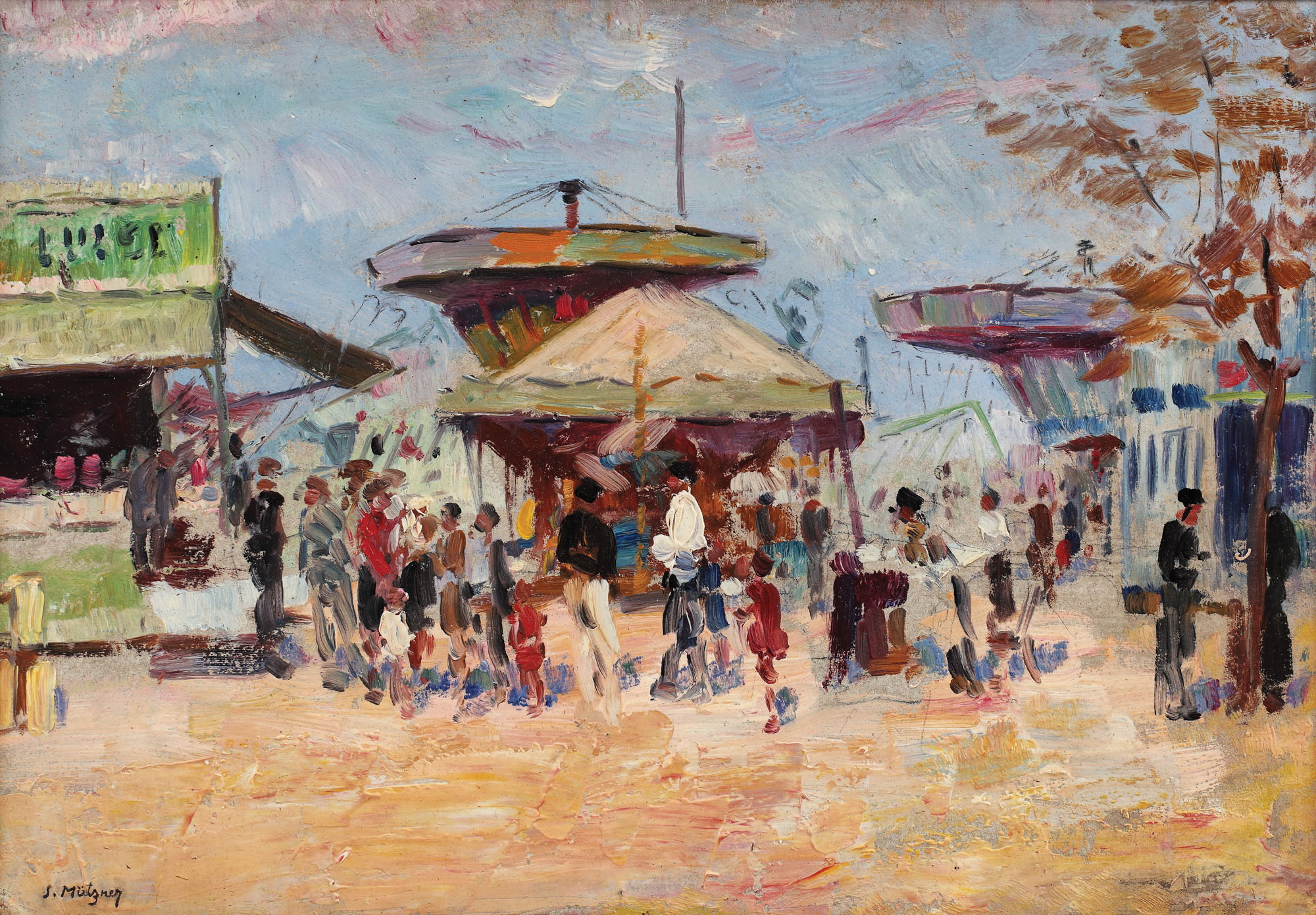 semnat stânga jos, cu negru, ”S. Mutzner”; intitulat și datat pe verso, cu roșu, ”Târgul Moșilor, 1941”