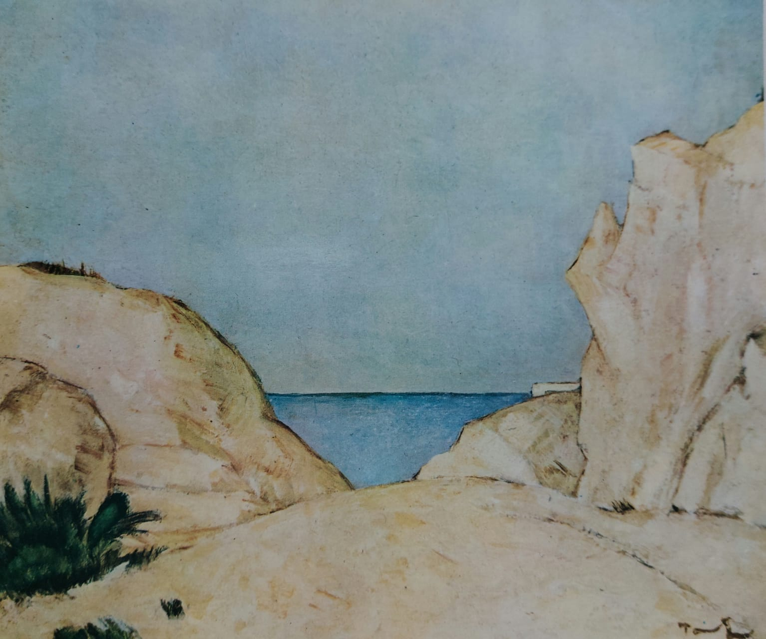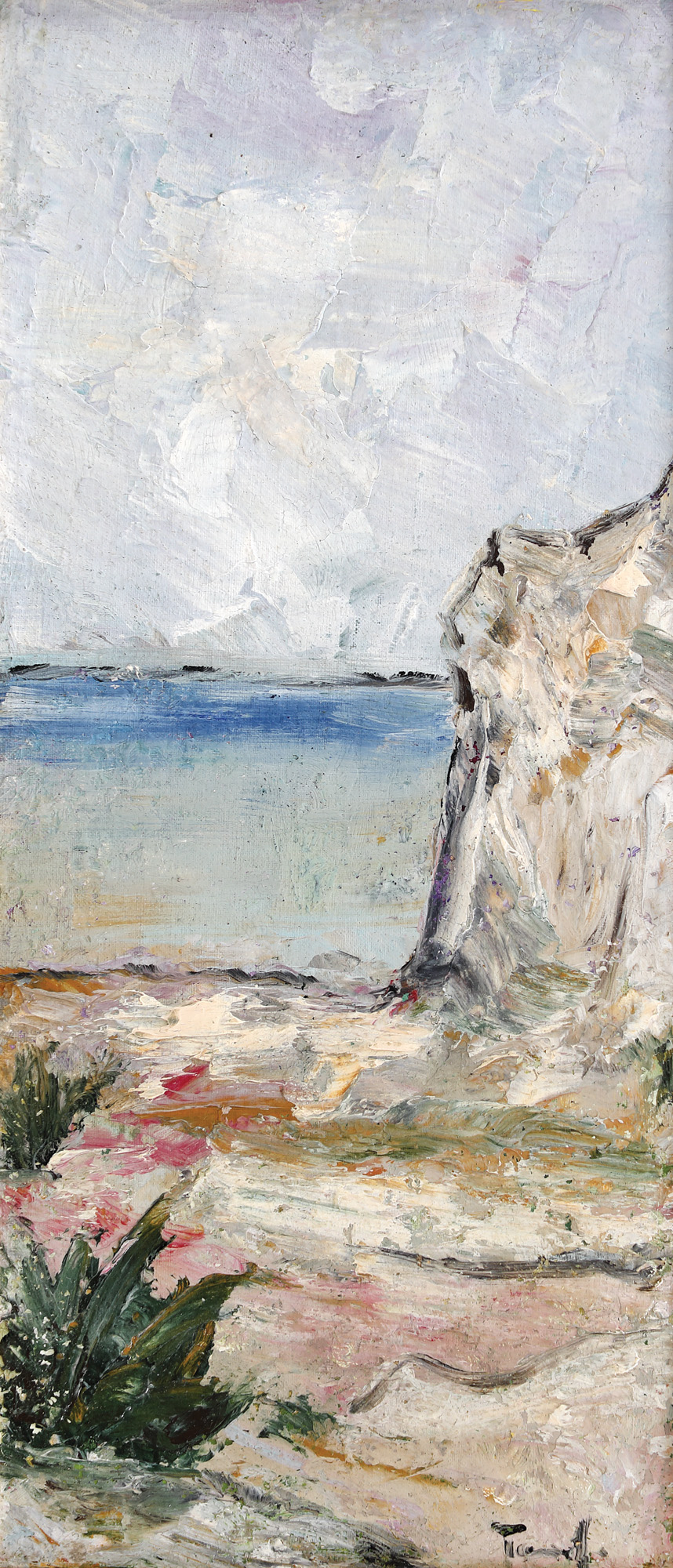 Momentul descoperirii Balcicului va coincide, în economia creației lui Nicolae Tonitza, cu momentul renunțării la învățăturile școlii academiste, care îi limitau considerabil perspectiva liniară. Vara lui 1933 îl surprinde pe artistul român colindând meleagurile maritime care îi vor lărgi considerabil orizontul pictural. Verile petrecute la Balcic vor umple pânzele lui Tonitza de cafenele, case tradiționale, florării, geamii, cerdacuri, mahalale sau golful fermecător al spațiului dobrogean. Spirit analitic, artistul va identifica soluții inedite în ilustrarea adâncimii spațiale și va opta pentru împărțirea pânzei în așa-zise ”ecrane”. Stâncile, cerul și marea se vor succede într-o extraordinară alternanță, relevând apropieri și distanțe fidele realității. Tonitza surprinde marea într-o instanță imobilă, densă și opacă. Mirajul lumii orientale va conferi un ritm deosebit creațiilor realizate la Balcic, iar arabescurile sinuoase ale liniilor vor apărea tot mai des în opera specifică acestei perioade. Artistul surprinde atmosfera și culoarea locală printr-o reducere considerabilă a paletei la doar câetva nuanțe dispuse pe suprafețe mult mai mari. Delimitează formele de culoarea desprinsă din paletă cu aceeași pricepere pe care o demonstrează și în desen. Suprafețele largi, realizate în ulei, se bucură de lumina diafană a golfului, pe care artistul o aplică în straturi repetate de alb. În opera de față, Tonitza realizează o veritabilă panoramare a spațiului de la țărmul Mării Negre. Introduce admirabil accentele de negru, care contribuie la reliefarea materialității naturii reprezentate. Contrastele sunt reduse la minimum, personajele umane sunt inexistente, iar ceea ce primează în creația sa atribuită acestei perioade e reprezentarea cât mai fidelă a realității. Astfel, artistul va trece peisajul marin prin filtrul său propriu și îl va transpune pe pânză cu iscusința desenatorului și cu atenta întrebuințare a penelului pictorului.