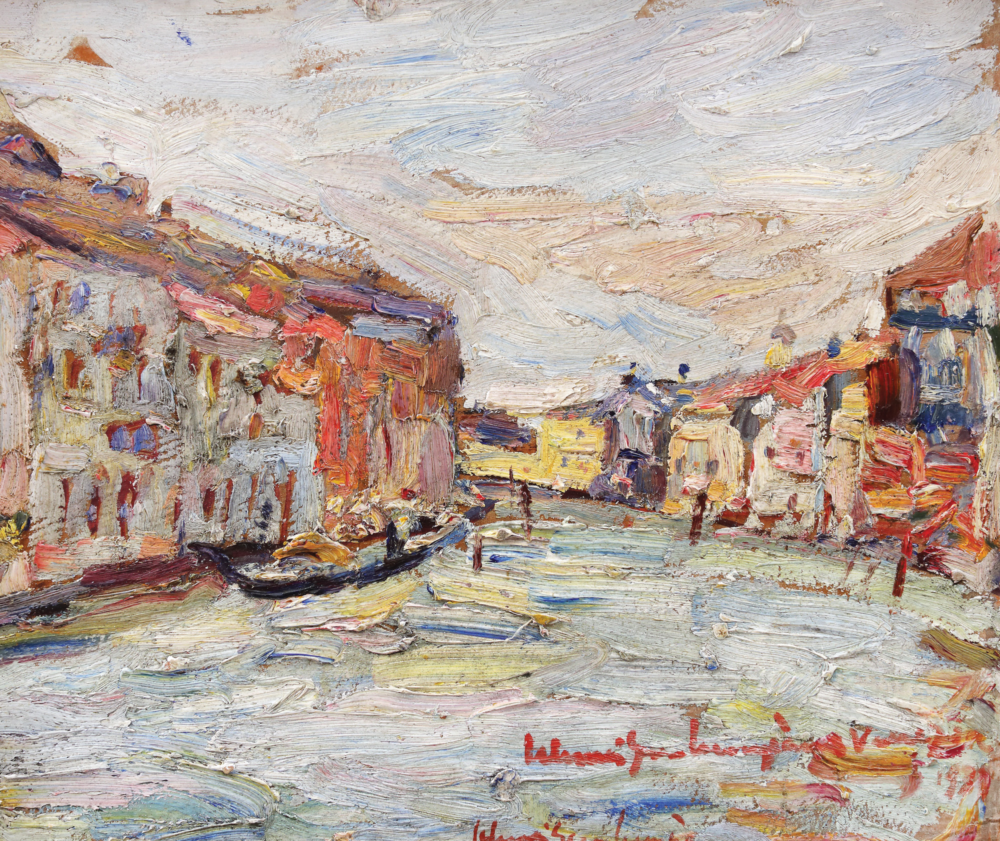 semnat, datat și localizat dreapta jos, cu roșu, de două ori, "Schweitzer-Cumpăna, Veneția, 1937"