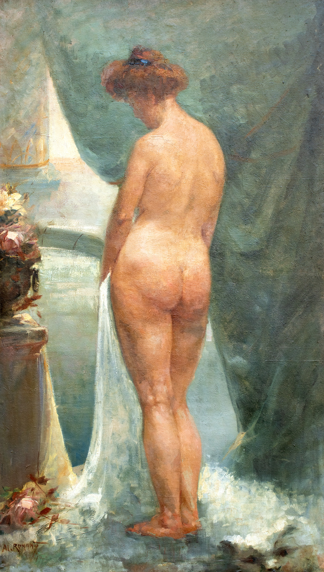 semnat și datat stânga jos, cu brun, ”A. Romano, 1909”