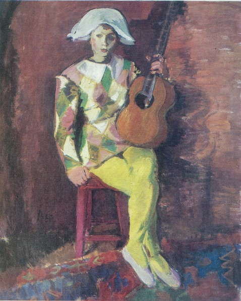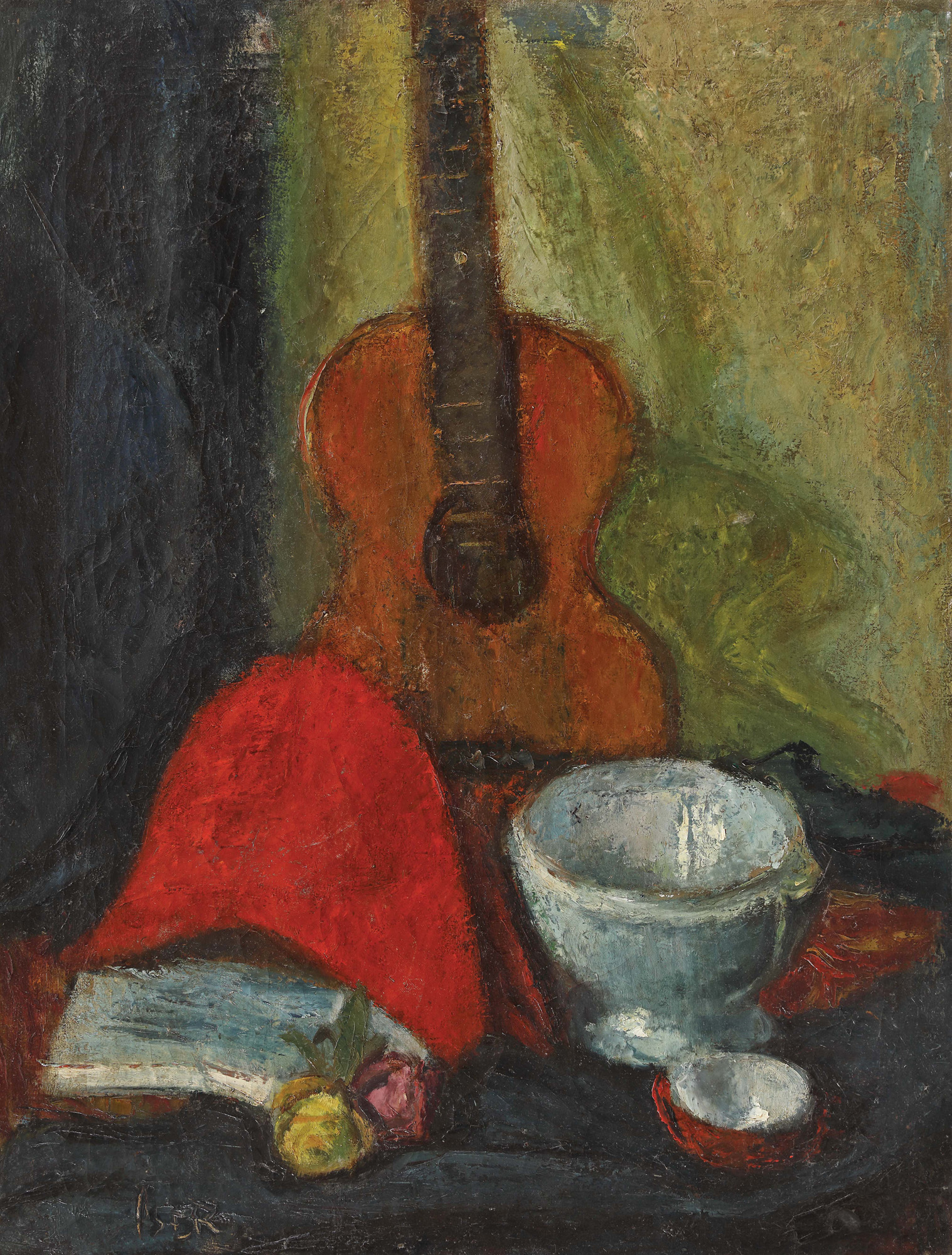Iosif Iser debutează în fața publicului în postura desenatorului-publicist care schițează, în paginile gazetelor vremii, o cronică satirică a realității. Excelent observator, expresiv și sintetic, artistul consacră întinderea pânzelor sale descifrării tipologiilor umane. Începând cu 1920, Iser începe să își îndrepte atenția mai mult către pictura în ulei. Va prelua subiecte din cotidian și va întrebuința excursiile în străinătate ca pietre de hotar în constituirea creațiilor sale. Familiile de tătari, odaliscele sau compozițiile care au în plan central recuzita tipic turcească vor deveni subiectele favorite ale lui Iser. În opera de față, artistul își restrânge paleta cromatică la doar câteva nuanțe, modelate alternativ. De această dată, identificăm o imixtiune a influențelor care pornesc de la peninsula iberică, poposesc în inima Italiei, unde întâlnesc Commedia dell’Arte și străbat apoi drumul către lumea solară a Dobrogei. Remarcăm chitara clasică din prim-plan, care însoțește adesea arlechinii în operele sale, dar și pălăria roșie, recurentă de altfel, specifică aceleiași tematici. Opera devine, așadar, o natură statică în care artistul adună laolaltă elementele de recuzită pe care le oferă arlechinilor din celebrele sale lucrări. Cromatica e opulentă, de factură răsăriteană; subiectele sunt ordonate arhitectonic iar liniile sintetice rezumă întocmai formele. Deși infimă în economia întregii sale opere, natura statică aduce un suflu nou, puternic marcat de influențele orientale, pe care artistul le preia atât în conturarea formelor, cât și în alegerile cromatice. Arlechinul, devenit laitmotiv, e transpus atât în compozițiile cu personaje, cât și în naturile statice.